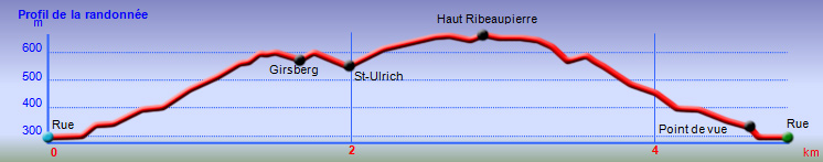 La randonnée, courte et agréable chemine tout d'abord dans les vignes au dessus desquelles volent parfois des cigognes, pénètre dans le bois jusqu'au premier château. La pente n'est jamais très forte mais il vaut mieux toute de même avoir un bon entraînement. Les distances reliant le St-Ulrich aux autres ruines sont courtes et des raccourcis ou déviations sont possibles.