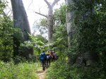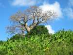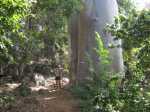 La randonnée, courte et facile, débute à la première plage de Mtsanga Kolo Batsoumou où l'on peut reprendre le GR1 du tour de Mayotte très facilement. Mais il faut voir de jour les activités nocturnes des tortues. On file donc directement par la plage vers celle de Mtsanga Kombo Bato qui comporte plus de baobabs. On remarque partout des traces laissées par les animaux marins lors du retour dans leur élément naturel. Leur poids et la lenteur de leurs mouvements ont laissé dans le sable des traces profondes qui trahissent au cm près le lieu de la ponte. Certaines traces sont rectilignes (Photo 7), d'autres beaucoup plus sinueuses lorsque la bête a rencontré un obstacle. Certains baobabs en bordure de plage tiennent tout juste debout tant les tortues ont creusé à leur pied. On voit également sur le sable des coquilles vides, signe que des bébés ont pu regagner la mer à une période sans oiseaux, beaucoup plus propice à leur survie qu'une naissance en pleine journée.