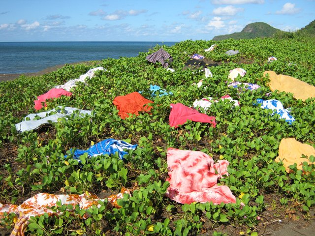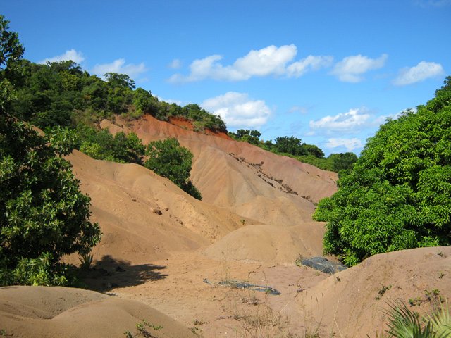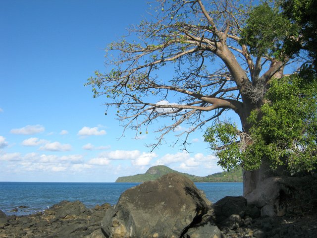 Avant de partir, ne pas hésiter à remonter un peu les sentiers partant vers Mtsamoudou par la crête pour profiter une dernière fois de vues plongeantes sur les plages (Photo 3) ou repérer le circuit de la randonnée qui passera auprès du Saziley Bé (Photo 2). Suivre la plage où la marche est facile au milieu des nombreuses traces de tortues (Photo 8). La petite ravine qui a pris sa source à quelques centaines de mètres au nord laisse en bordure de plage un petit étang d'eau calme et transparente (Photo 9). Marcher vers la pointe en suivant les traces blanches et rouges du GR peintes sur des roches. On parvient à un baobab maigrichon en bord de plage (Photo 10). C'est là qu'il faut abandonner les plages pour bifurquer dans la petite vallée entre le Mont Saziley Bé (153 m) et le Mlima Saziley (233 m). Le sentier traverse une zone originale d'érosion particulière qui ressemble à des dunes de sable dur ou aucune végétation ne vient pousser (Photo 11). Ce sont des padzas déjà rencontrés lors d'autres randonnées sur l'île. Ces zones déforestées et incultes, issues de l'érosion de roches basaltiques, prennent parfois de très belles couleurs (Photo 12). On aperçoit rapidement l'Anse Mounyambani et c'est là qu'on rejoint les plages qu'on longera jusqu'au village (Photo 14). La mer est calme et le regard porte jusqu'à l'île Chissioua Bambo et à Brandelé (Photo 15). Les baobabs commencent à envahir les bords du chemin et dépassent des habituels mahots de bord de mer (Photo 16). Certains sont énormes et très impressionnants et ont du mal à loger sur la pellicule en un seul clic (Photo 17). Le sentier est toujours propre et facile. Il faut parfois passer près de l'eau pour un cheminement tout aussi agréable (Photo 18). La balade se poursuit en traversant de nouvelles zones couvertes de ces énormes baobabs qui atteignent parfois des tailles hors du commun (Photo 20). Ils sont si nombreux qu'il est impossible de s'arrêter près de chacun d'eux (Photo 22). Après une courte pente qui se termine au-dessus du village, on domine la baie et les habitations de Mtsamoudou (Photo 23). Une descente un peu rocheuse mène la plage de Mtsamoudou. Il faut passer près d'une petite lagune avant de rejoindre les "faubourgs". On aperçoit au loin le Saziley Bé qui semble tout proche (Photo 25). Le village de pêcheurs, très calme, se visite autant par la plage que par ses rues typiquement mahoraises. On y voit du linge qui sèche au vent marin (Photo 26), de belles pirogues en "stationnement" (Photo 27) ou en construction (Photo 28). Les pêcheurs restent à même le sable pour réparer leurs filets ou tresser des nattes de cocotier. Sur la plage, chiens abandonnés, chèvres en vadrouilles ou poules rajoutent de l'animation. En ville, odeurs de cuisine ou cases typiques donnent une bonne idée de la vie dans ce département éloigné de tout. Cette randonnée se termine ici mais peut très bien continuer tout le long du GR qui suit la côte jusqu'à Bandrélé en longeant la côte au plus près.