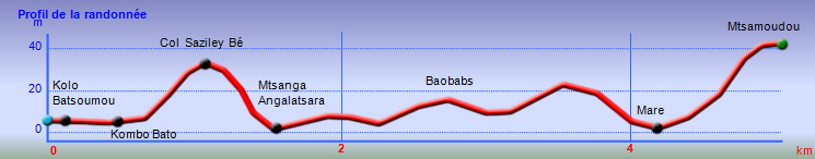 Après avoir passé une nuit sur la plage de Mtsanga Kolo Batsoumou, prendre le chemin de Mtsamoudou en longeant tout d'abord la plage puis celle de Mtsanga Kombo Bato avant de bifurquer à gauche au faré pour traverser la presqu'île en laissant sur la droite le Piton Saziley Bé - Arriver à la Plage de Mtsanga Angalatsara et suivre le sentier parallèle à la côte jusqu'au village de Mtsamoudou.