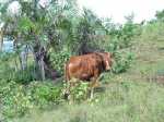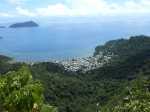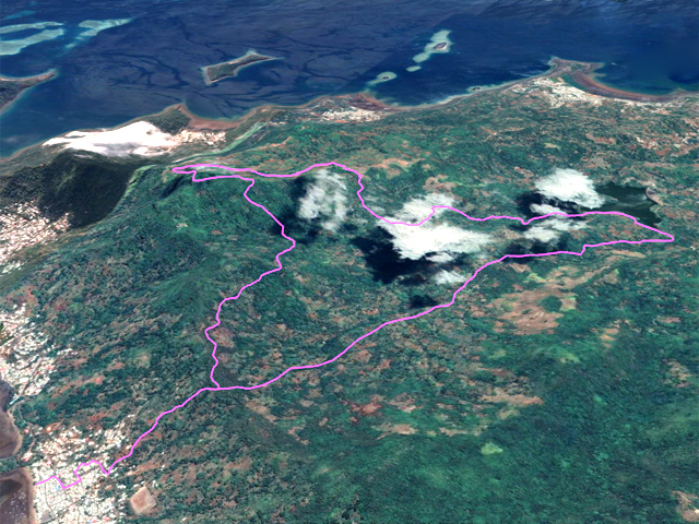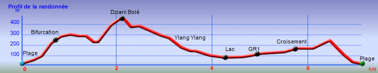 La randonnée débute dans le village de Mtsamboro qu'il est intéressant de traverser pour s'imprégner de l'habitat et de la manière de vivre des insulaires. On garde la plage pour la fin de la boucle et on entame la randonnée en employant rues ou ruelles, plus ou moins propres (Photo 1). Beaucoup d'habitations sont faites de rajouts de murs en parpaings ou entourées de tôles ondulées (Photo 2). Le contraste est grand entre les vues de la ville surchauffée et la verdure qui la domine du côté du Mont Hachiroungou (Photo 1). On rejoint très vite le départ du sentier Ylang matérialisé par une pancarte représentant tous les sentiers classiques de Mayotte. Il commence entre les dernières cases du village dont certaines sont en torchis (Photo 4). Le sentier passe près de zones cultivées et grimpe de plus en plus jusqu'à un faré situé à la jonction avec le GR1du tour de Mayotte. En se retournant, on a sous les yeux le village noyé dans la verdure ainsi que les ilots situées au large (Photo 5). Cette vision de carte postale fait un peu oublier la saleté aperçue lors de la traversée de Mtsamboro. La zone est boisée et des sentiers ou pistes partent un peu partout dans plusieurs directions (Photo 6). Partir à gauche sur le GR1 en direction du Kétabé (389 m) qu'on contournera par la droite sur un sentier terreux encombré parfois de roches (Photo 7). Tant qu'on chemine sur la crête, on continue à bénéficier de larges panoramas sur l'océan, les îles Choazil (Photo 8) ou Mtsamboro (Photo 9). Le sentier se transforme souvent en piste large sur laquelle paissent des vaches attachées à de longues cordes sous les cocotiers ou les palmiers (Photo 10). Les premiers ylang-ylang font leur apparition mais ils ne sont pas taillés. Plus loin on traverse plusieurs plantations de centaines d'arbres où poussent également des cocotiers (Photo 11). Une halte s'impose pour respirer de plus près les fleurs (Photo 12), étudier l'art de tailler les arbres en espalier (Photo 13) ou toucher les fruits de cet arbre emblématique (Photo 14). La pente débute en direction du point culminant de la région, le mont Dziani Bolé. La forêt, touffue, est agréable (Photo 15) et les makis, pas toujours discrets, se font remarquer régulièrement (Photo 16). La montée, parfois forte, se termine au sommet comportant une petite aire bétonnée d'où l'on bénéficie de magnifiques panoramas sur toutes les villes côtières (Photo 17). Le sentier se perd un peu dans les herbes et fougères mais il est difficile de s'égarer (Photo 18). La descente débute avec des vues sur la retenue collinaire qu'on cherche à rejoindre. On arrive plus loin à un énorme manguier très caractéristique comportant même une balise du GR1, impossible à manquer (Photo 19). Le parcours traverse des padzas, ces terres arides issues de l'érosion millénaire des roches de Mayotte. Plus bas, on rencontre quelques cultures de vanille, des orangers en plus ou moins bon état et de nouvelles plantations d'ylang ylang. On traverse quelques gués parfois en eau (Photo 20). En quittant le sentier pour emprunter la piste (Alt. 111 m) on passe devant un alambic artisanal en état de fonctionner (Photo 21). Les vachettes et petits zébus restent toujours aussi calmes malgré les mouches qui les assaillent (Photo 23). Ne pas manquer, dans les zones humides le long de la piste, ces plantations de palmiers raphia desquels pendent de longues fleurs ou lianes chargées de fruits (Photo 24). Plus loin, on rencontre la retenue collinaire de Dzoumonyé, qui est un petit lac artificiel dont on aperçoit en face le barrage (Photo 25). Sans doute fort utile pour l'arrosage ou la lutte contre l'incendie, cette retenue n'encourage guère à s'y baigner lorsqu'on voit la couleur de l'eau (Photo 26). Il suffit de suivre la petite route qui longe la rive et trouver, juste avant le pont la piste qui remonte vers Kétabé et le GR1. Le retour vers Mtsamboro longe tout d'abord le ruisseau Mro Wo Bandrani qu'on franchit plusieurs fois par des gués avant de parvenir à un faré et un panneau d'information de la réserve forestière. La remontée s'effectue surtout sur des pistes jusqu'au croisement traversé en début de boucle (Photo 27). Après la longue descente glissante vers Mrsamboro, on retrouve ce village littoral et la plage mais il faut tout de même réfléchir avant de se baigner quand on voit les quintaux de détritus qui traînent un peu partout (Photo 28).