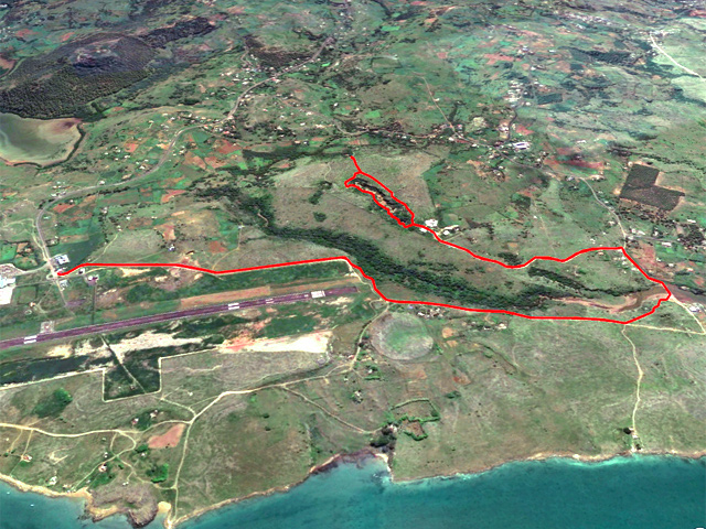 Se rendre l'aéroport de Rodrigues et se garer moins de 50 mètres après le virage de l'entrée au parking de l'aéroport (ou sur le parking de l'aéroport) - Prendre à gauche la piste qui débute en face d'un rond-point et se diriger vers la rivière - Laisser sur la gauche le pont qui enjambe la rivière et poursuivre jusqu'au gué pour la franchir - Continuer 200 mètres sur la piste et prendre immédiatement à gauche pour rejoindre l'entrée du complexe - Traverser les nouvelles plantations puis visiter la vallée des tortues puis les grottes ouvertes avant de faire demi-tour par le même itinéraire.