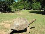 On estime à près de 300 000 le nombre de tortues vivant à Rodrigues au début du 18ème siècle. En moins de 100 ans, plus aucune carapace ne se déplaçait sur cette petite île isolée de tout. Le premier prédateur de la planète avait accosté sur ses rives et venait régulièrement faire le plein de viande et de graisse. François Leguat a tout d'abord réintroduit deux espèces avant de tenter de sauver une tortue de Madagascar subissant le même sort que leurs cousines de Rodrigues en 1750. Cette courte balade débute à l'aéroport pour qu'elle puisse porter le nom de randonnée. On peut ainsi visiter une zone assez sèche en ne marchant que 3 kilomètres. Cette visite peut même s'envisager un jour de départ en après-midi en se rendant à l'aéroport 4 heures avant l'heure de convocation. La randonnée est sans grand intérêt mais les visites valent la peine de prendre son temps. On visite tour à tour une zone de reboisement en espèces endémiques, une réserve de tortues et des grottes, phénomène assez rare dans cet hémisphère. La plantation, lorsqu'elle sera terminée comportera 300 000 pieds de plantes endémiques ou indigènes chargées de repeupler toute la zone de l'Anse Quitor. Le parc à tortue n'a pas réussi à réintroduire la tortue originelle qui a totalement disparu. En revanche, on rencontrera la géante d’Aldabra (Dipsochelys elephantina), la tortue araignée de Madagascar (Pyxis Arachnoides oblonga) et la tortue étoilée du sud de Madagascar (Astrochelys radiata). On visite d'abord les pouponnières et plus loin la vallée qui abrite les adultes qui vivent ici en liberté dans le Canyon Tiyel qui n'est qu'un effondrement du toit des grottes qui se trouvaient là il y a quelques millénaires. La grotte Tamarin se visite sur une distance de 600 mètres. On rencontre comme toujours les concrétions de ces cavités calcaires façonnées par les eaux d'infiltration. Rien à voir avec la Dordogne ou l'Ardèche mais le détour vaut la peine, ne serait-ce que pour être au frais durant une petite heure. L'île étant d'origine volcanique, il n'y a pas de calcaire naturel. Ces grottes ont issues d'amoncèlements tassés de sables riches en débris de coquillages et perforés plus tard par les eaux plus acides.