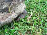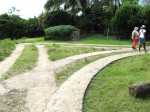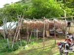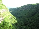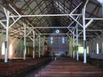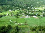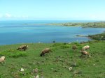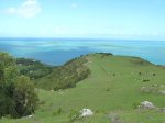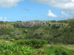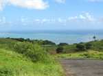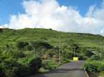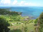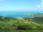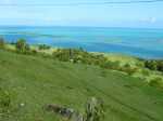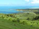 La randonnée débute sur la route, à la Baie aux Huitres, mais peut aussi commencer à Port Mathurin car elle est courte et peut être facilement rallongée. Partir vers l'ouest et prendre la première rue à gauche. Passer devant le stade et entamer la montée à travers les habitations puis récupérer le sentier remontant en bordure de rempart dans des zones défrichées accueillant parfois quelques bœufs au bout de leur longue corde. La Baie aux Huitres grandit assez vite car on se retrouve vite à 150 m d'altitude (Photo 2). Elle est impossible à confondre avec une autre baie de l'île en raison de son espace rectangulaire protégé du l'eau. On rejoint rapidement une piste qui évite la circulation et monte au Mont Tonnerre pour rejoindre plus tard la minuscule bourgade de Bigarade. Les panoramas sont nombreux en direction de tous les côtés de l'île (Photo 4). De là, on part vers l'Est en direction de Saint-Gabriel sur une route agréable bordée de prairies et de quelques habitations dispersées (Photo 7). A Petit Gabriel, prendre à droite et marcher jusqu'à la Cathédrale Saint-Gabriel dans son écrin de verdure (Photo 8). L'imposant édifice construit en pierre grise et corail comporte deux tours latérales (Photo 9). L'immense édifice, construit de 1936 à 1939 par le Père Eugène Legault et par la population, peut abriter une foule impressionnante de 2000 fidèles (Photo 10). Il a été construit au centre de l'île et se retrouve presque chaque jour plein à craquer dès les offices du matin. Reprendre le chemin inverse durant 500 m et bifurquer à gauche pour entreprendre la descente sur un sentier passant tout d'abord entre quelques habitations (Photo 12). Un écart, plus difficile à repérer permet de s'éloigner un peu et marcher dans une végétation touffue (Photo 13) puis de pénétrer en bordure de la vallée profonde assez boisée (Photo 14). Une fois de retour sur le sentier, la marche se poursuit vers le Sud parmi les moutons dans des prairies en pente douce donnant sur la mer sans suivre réellement un sentier. La végétation a presque totalement disparu de ces prairies d'altitude bordées des rochers constituant le bord du rempart (Photo 15). Ne pas déranger les moutons qui broutent tranquillement ou se reposent sans ombre (Photo 17). Les panoramas sur le lagon et l'Anse Raffin sont de plus en plus beaux, surtout quand le soleil fait ressortir le turquoise de l'eau (Photo 19). La marche s'effectue en hors sentier au milieu des prés (Photo 20). On aperçoit le village de Parc à Tortue qui grossit près du Lagon (Photo 21). De l'autre côté de la crête, c'est Port Sud-Est qui grandit à vue d'œil (Photo 22). On arrive à la route au Parc à Tortues et il ne restera plus qu'à effectuer le kilomètre qui sépare de Port-Sud-est en longeant le littoral vers la gauche. Les séchoirs à poulpes sont installés devant chaque maison de pêcheur (Photo 24). Après une longue plage, on termine près du stade bordant le collège. Le retour à port Mathurin est conseillé en bus pour au moins une fois voir comment on peut entasser plus de monde que dans nos rames de RER parisiennes le matin à l'embauche, enfants des écoles compris !