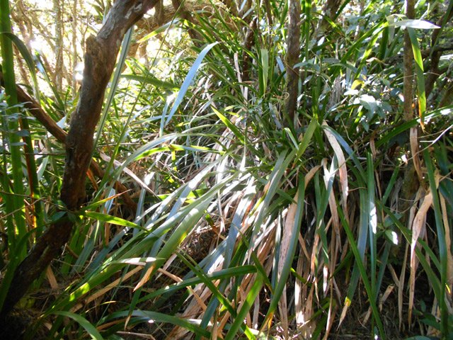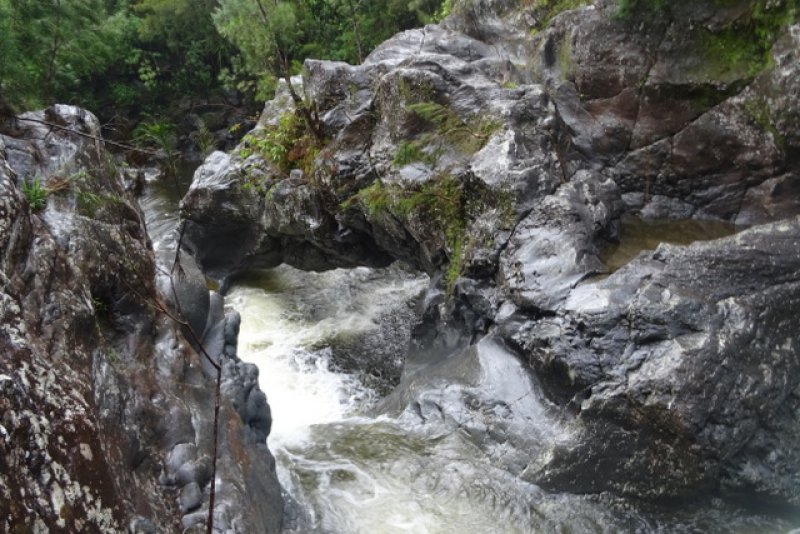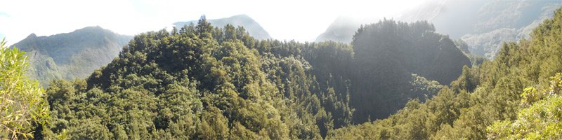 La randonnée débute à Grand Galet où de nombreuses places de stationnement sont possibles le long de la route. Beaucoup préfèrent se garer plus haut près de la citerne en début de sentier mais la place est vite prise d'assaut. Après avoir rejoint la citerne, le sentier traverse d'anciens champs et des bananeraies avant de franchir le fond très caillouteux de la Grande Ravine. Il se poursuit longuement en longeant un tuyau, en traversant d'autres champs plus ou moins abandonnés, continue par des passages plus ou moins pentus ou caillouteux et se termine à la passerelle de rondins qui franchit la Grande Ravine sur des petits bassins où grouillent des petites truites. Partir sur la droite et longer la rivière. Poursuivre sans s'occuper des boucles prévues en bordure de forêt et rejoindre l'aire de pique-nique située sous de grands filaos (Photo 4). C'est le premier point de repère qu'il faut atteindre. Poursuivre, toujours en rive droite, sur une vingtaine de mètres et repérer un passage agréable les pieds dans l'eau car il n'y a pas de gué à cet endroit (Photo 5). Aucun danger pour atteindre l'autre rive où l'on remarque des traces de passage. Une fois ce semblant de sentier repéré, partir sur la gauche pour remonter la rivière. Très vite, il repart sur la droite et attaque littéralement le rempart par des portions pentues sur une trace très visible et encombrée de quelques cailloux (Photo 6). Cette forte pente ne cessera que très rarement. La magnifique racine (Photo 7) sous-laquelle on chemine est le deuxième point caractéristique qu'il faut repérer dans la montée. Impossible de s'égarer puisqu'on suit une arête entre les deux vallées de plus en plus profondes au fur et à mesure de l'ascension. On pénètre enfin dans une grande forêt de filaos qui ressemblent à ceux rencontrés sur l'autre versant de la Ravine des Sept Bras pour rejoindre le Bras des Mousses. La trace reste visible 80% du temps et ne pose pas de problème particulier. La pente est toujours très forte (Photo 8) et les glissades faciles en raison de la couche importante d'aiguilles de filaos. Les 20% qui restent doivent s'effectuer sereinement à la recherche de vieilles traces de passage, de branches cassées, de plantes tranchées au coupe-coupe ou des détritus classiques rencontrés dans tous les coins de l'île (Toutefois un peu moins nombreux que sur le bord des GR). Garder à l'esprit que la première partie de l'ascension s'effectue sur la droite en frôlant le bord du rempart de la Ravine des Trois Sources (voir carte IGN) puis sur la gauche après avoir traversé le plateau couvert de filaos, framboisiers, goyaviers et bien sûr les sabres marrons (Photo 10) puis longé une zone de branles verts avec vue sur la Cascade de la Caverne Rouge (Photo 11). Après quelques nouveaux points de vue sur la vallée de la Ravine des Sept Bras à travers des trouées de la végétation (Photo 14), on parvient à un emplacement plat dont des vestiges de bâche bleue indiquent un ancien point de bivouac pour la nuit. Les sabres marrons deviennent de plus en plus nombreux sur la pente (Photo 13) qui se poursuit au-dessus de la Ravine des Sept Bras. Comme dans la montée précédente, il faut constamment rechercher les traces de passage mais un œil habitué a vite fait de trouver des repères pour se rassurer. (L'horaire imposé nous a obligés à faire demi-tour mais le reste de la montée s'effectue toujours dans les mêmes conditions). La descente est trois fois plus rapide que la montée mais deux fois plus glissante car le corps est attiré vers le bas. La trace est encore visible, les plantes foulées n'ont pas eu le temps de se relever et quelques branchettes coupées en montée confirment le bon trajet. Ne pas oublier de longer les deux faces du plateau en pente et on se retrouve naturellement sur l'arête étroite qui plonge vers la Ravine des Sept Bras qu'on entend très tôt. Une fois à la ravine, ne pas traverser immédiatement mais suivre un peu en rive gauche jusqu'à la Ravine des Trois Sources qui offre un cadre enchanteur mais sauvage parmi les mousses et les belles racines (Photo 23, 24, 25). La poursuite en rive gauche est hasardeuse à cet endroit et une traversée de la rivière s'impose à nouveau. Plus aucun problème pour retrouver le sentier marmaille, la passerelle et le sentier de Cap Blanc en direction de Grand Galet. La journée, placée sous le signe de l'aventure, mérite un complément, qu'il y ait ou non de l'eau dans la Grande Ravine. On peut, depuis la passerelle, partir en rive droite de la partie aval et rejoindre le haut de la cascade la Fouillée dont a repéré le grand bassin par le petit éboulis en bordure de sentier. Après avoir repris le chemin de retour, ne pas manquer le petit sentier qui rejoint une arche naturelle en bordure de rivière ainsi qu'un grand bassin très profond (Photo 26) ; attention à la glissade. Le clou de la descente se situe au confluent d'une petite ravine se jetant dans la Grande Ravine 50 mètres avant la Source Canal. Redescendre le font moussu et caillouteux de cette petite ravine et rejoindre prudemment le fond de la Grande Ravine. Spectacle sauvage assuré avec des roches lisses, crevasses, grottes, bassins vers l'aval et surtout cette énorme arche naturelle en amont surplombant un bassin de 10 mètres de profondeur (Photo 27). Le spectacle est unique quand il y a de l'eau dans la ravine et que le soleil est au plus haut. Sans cette eau, le paysage devient très sauvage et surtout impressionnant en raison de la profondeur de trou. On envie les canyoneurs qui évoluent principalement dans ce type de paysage. Reprendre la montée vers le sentier et rejoindre Grand Galet par une longue descente régulière.