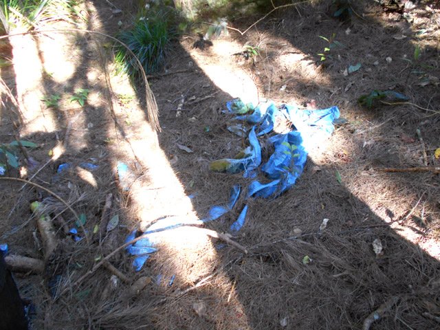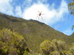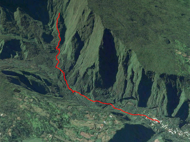 Cette difficile randonnée pour initiés ou canyoneurs a été découverte fortuitement lors de la création de la fiche sur les aires de bivouac de la Ravine des Sept Bras. Cette sortie marmaille, initialement prévue en moins de deux heures s'est terminée après 6 heures d'une interminable remontée du rempart en suivant un sentier connu des braconniers et canyoneurs afin de rejoindre par le sud les ravines des affluents de la Ravine des Sept Bras dont certaines ont déjà été présentées à partir de la face nord. Faute de temps prévu ce jour là, la remontée s'est arrêtée 30 minutes après le lieu d'un ancien bivouac (Photo 12) dans les filaos. Les amateurs de sentiers oubliés ou quelque peu difficiles ne manqueront pas de partir tôt, prévoiront assez de nourriture et de boisson afin de pousser plus avant cette découverte très originale. Les commentaires en fin de page seront les bienvenus afin d'aider les futurs volontaires. Le sentier est constamment en forte pente, demande un excellent entrainement ainsi qu'un bon sens de l'orientation. Les pentes à 80° bordant le sentier de part et d'autres quand on marche sur d'étroites arêtes fait comprendre très vite qu'il vaut mieux suivre correctement la trace pour éviter de se retrouver sur ces flancs abrupts où seuls les arbustes peuvent servir de soutien. Rares mais beaux points de vue sur les nombreuses rivières se jetant dans la Ravine des Sept Bras, dont la belle et longue cascade de la Caverne Rouge.