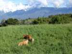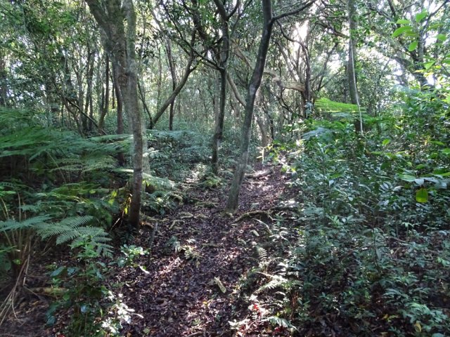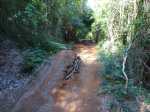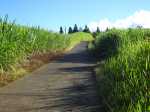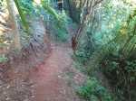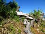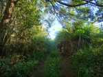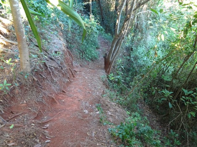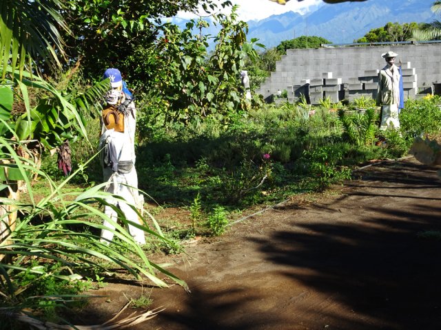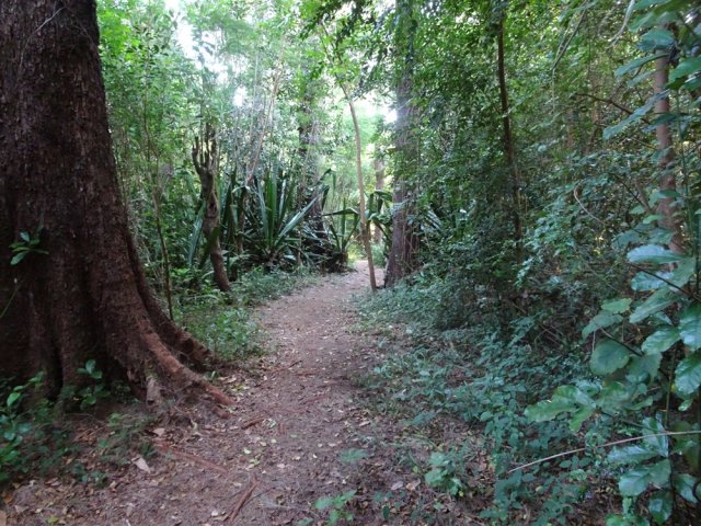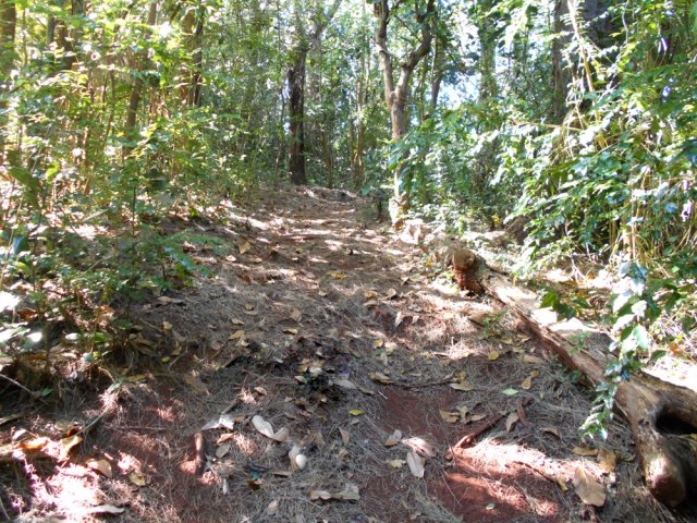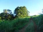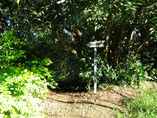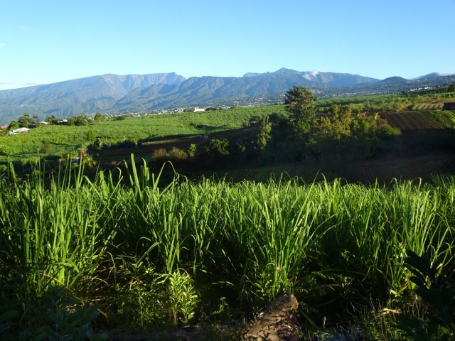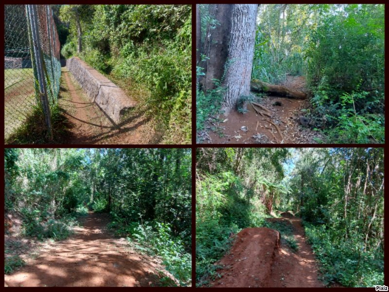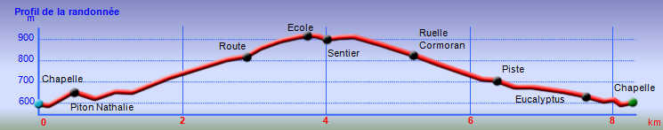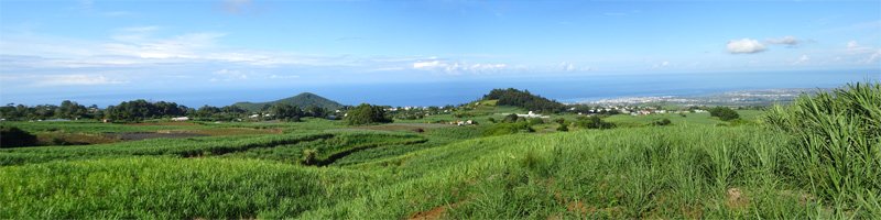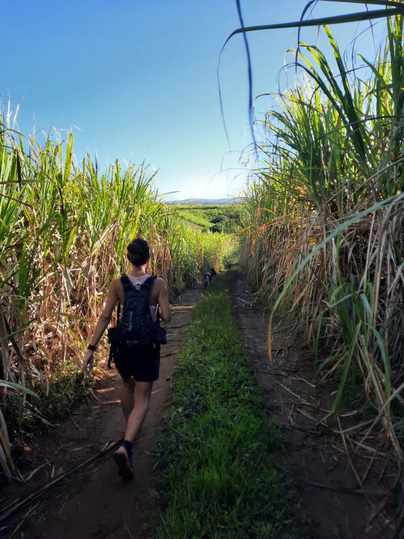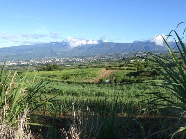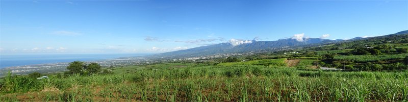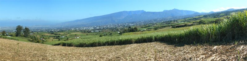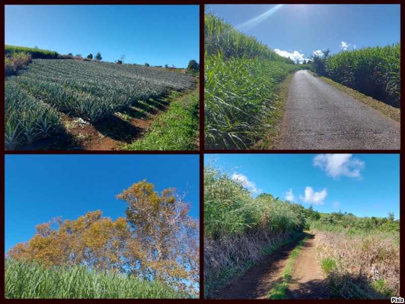 La randonnée débute au stade de Bérive, facile à trouver près de la rue du Paille en Queue qui est aussi la D3. Un grand parking permet de stationner à une cinquantaine de mètres du grillage entourant le terrain de sport. D'autres emplacements peuvent se trouver près de la chapelle et de la mairie annexe. Rejoindre le grillage entourant le stade et le longer sur quelques mètres. Repérer le sentier qui part sur la droite et rejoint ensuite la lisière du bois occupant le Piton Nathalie. On rejoint l'orée du grand bois de filaos où poussent également des troènes et des goyaviers (Photo 1). Le sentier se divise très vite en plusieurs autres indiquant que l'on peut se promener ici à sa guise tout en gardant les autres itinéraires pour la fin de la boucle. Les traces de roues de VTT montrent que l'endroit est également connu des cyclistes qui y ont installé des tremplins. Les roues ont parfois créé des semblants de fossés et on imagine les sportifs penchés pour ne pas déraper. Prendre le sentier le plus à droite avec, parfois, de fortes montées glissantes. Le passage est de bonne qualité entre les grands filaos (Photo 2). Il oblique plus haut vers la gauche et emprunte une petite descente sableuse où il faut éviter de glisser (Photo 3). Marcher vers l'ouest en longeant les installations de saut des vététistes. Guetter le petit sentier partant sur la droite et descendre vers de grands eucalyptus de la lisière nord. Enjamber le gros tronc couché de l'un d'entre eux et arriver en bordure des champs offrant déjà les premiers panoramas sur les plus hauts sommets (Photo 4). Escalader le tronc d'un énorme eucalyptus terrassé par un cyclone (Photo 5). La piste qu'on emprunte par la droite est assez envahie de hautes herbes mais elle se suit tout de même sans hésitation ni colle-colle désagréables venant s'accrocher habituellement aux vêtements (Photo 6). Elle longe et ondule en même temps que la petite ravine, affluent de la Ravine des Roches. On arrive à l'Impasse goudronnée des Tourterelles Pays qu'on suit sur moins de 500 mètres à travers les cannes et quelques habitations. Plus haut, emprunter l'agréable piste qui se dirige vers de grands eucalyptus (Photo 7). On parvient près de magnifiques champs d'ananas tout en profitant de larges panoramas sur les hauts sommets (Photo 8). A l'arrière, c'est sur l'océan que porte le regard ainsi que sur le Piton Nathalie qu'on a quitté il y a peu (Photo 9). L'état des pistes diffère en fonction de l'altitude ou des cultures. Certaines sont larges et très roulantes (Photo 10) tandis que d'autres sont un peu plus envahies (Photo 11). A l'approche des 800 m, plusieurs pistes partent dans tous les sens au milieu des cultures. C'est là qu'il faut dénicher la piste très envahie de grandes herbes qui donnent l'impression que l'endroit est abandonné. Le bouchon n'est long que d'une vingtaine de mètres mais ne doit pas décourager à poursuivre. Une fois cet écueil franchi, on se retrouve sur une piste large et creusée qui se termine au Chemin Léopold Brabant. Partir sur la gauche et marcher en direction de la Ligne d'Equerre. De l'autre côté de la Ravine des Roches, on aperçoit parfois la route qu'on utilisera pour la descente à travers les cannes (Photo 12). Laisser à gauche la Ruelle des Cormorans puis la Route des Pinsons et poursuivre en montée jusqu'à apercevoir les cryptomerias de la Ligne d'Equerre (Photo 13). Marcher jusqu'à l'école proche de ces conifères abritant un boulodrome (Photo 14). Longer l'Impasse des Mandarins et décider ou non de pénétrer dans la petite forêt où le magnifique sentier créé il y a quelques années a hélas été délaissé (Photo 15). Les curieux apprécieront les beaux arbres et tenteront de retrouver le sentier plus ou moins visible en sous-bois (Photo 16). Rejoindre le boulodrome en poursuivant sur l'Impasse au milieu des habitations (Photo 17). Rejoindre le calvaire (Photo 18) et partir à droite sur la route en direction de Bérive par une longue descente constante. Ne pas s'effrayer des épouvantails installés dans une cour par un collectionneur aux goûts originaux (Photo 19). Les détracteurs de la marche sur goudron tenteront de se consoler en cherchant les points d'intérêt de chaque côté de la route. Il n'y a pas que de la canne à sucre et l'on peut rencontrer des troupeaux de bovins et de magnifiques paysages (Photo 20). On longe des habitations isolées entourées de jardins fleuris, de nouvelles cultures diverses ou de grands eucalyptus (Photo 21) tout en profitant des points de vue sur le Piton Mont Vert et le Piton Nathalie (Photo 22). La route est étroite, la circulation faible et les cannes l'emportent largement sur le reste (Photo 23). Après une série de virages, ne pas manquer la piste partant sur la gauche en longeant une prairie (Photo 24). Le Piton Nathalie grossit à vue d'œil. Les pistes sont toujours aussi agréables malgré quelques herbes (Photo 25). La piste se termine à l'Impasse des Tourterelles Pays où l'on retrouve celle empruntée au départ. Reprendre le chemin inverse sur la piste très herbeuse et rejoindre ce qui reste de l'eucalyptus déjà enjambé au départ. Partir immédiatement sur le sentier sous les filaos et les goyaviers puis retrouver le sentier du Piton Nathalie toujours bordé des installations pour vététistes (Photo 26). Délaisser le sentier partant sur la droite à l'approche du stade car des travaux d'urbanisme l'ont détruit. Terminer sous les filaos sur un sol parfois glissant à cause des aiguilles tombées au sol (Photo 27). En repartant vers la gauche, on rencontre le sentier pris au tout départ. Rejoindre le grillage du stade d'où l'on bénéficie d'un beau point de vue sur le village de Bérive (Photo 28) puis terminer vers le parking.