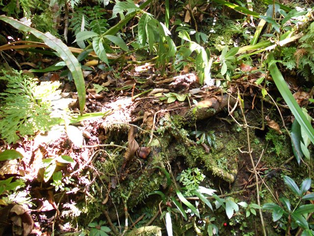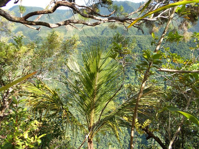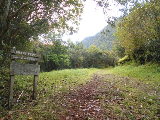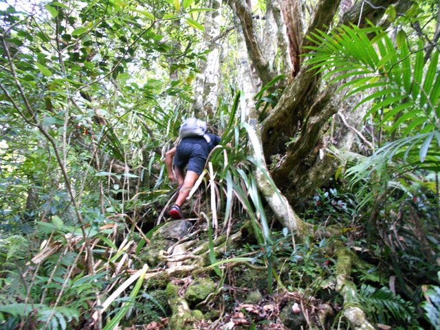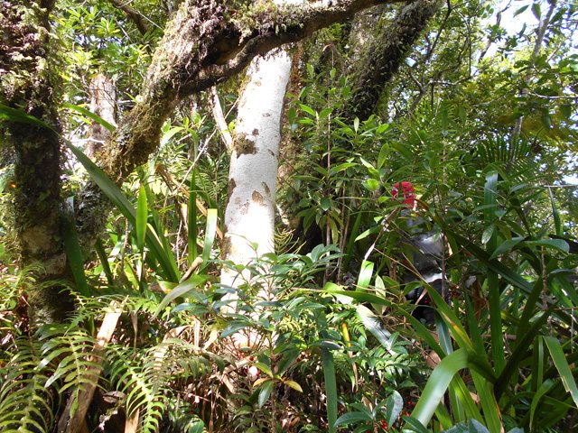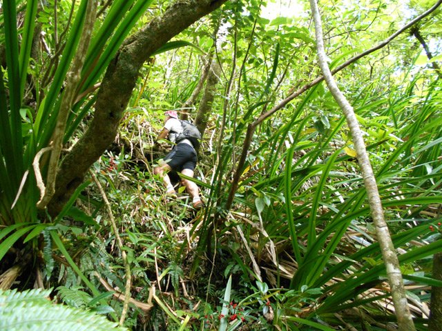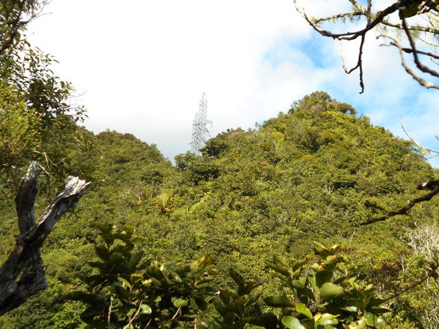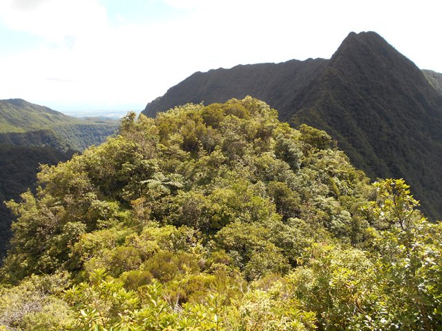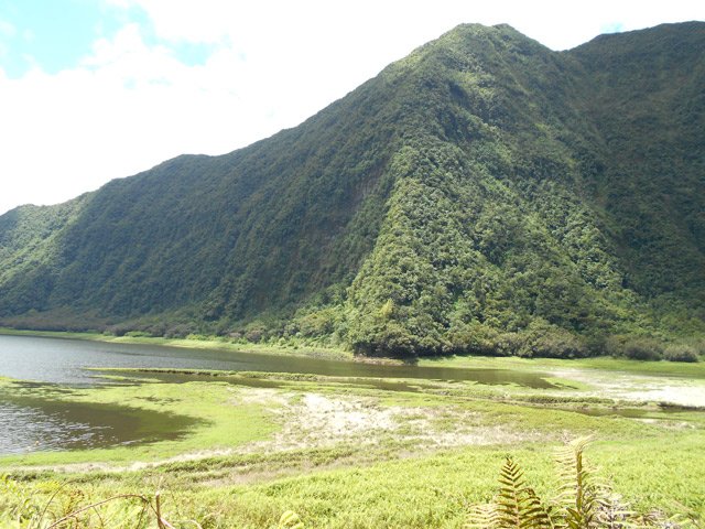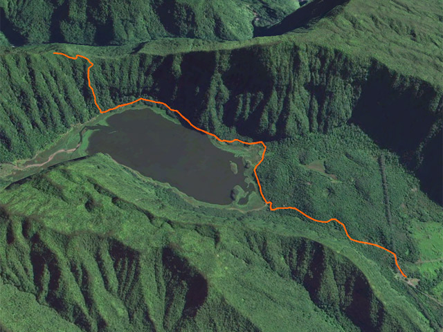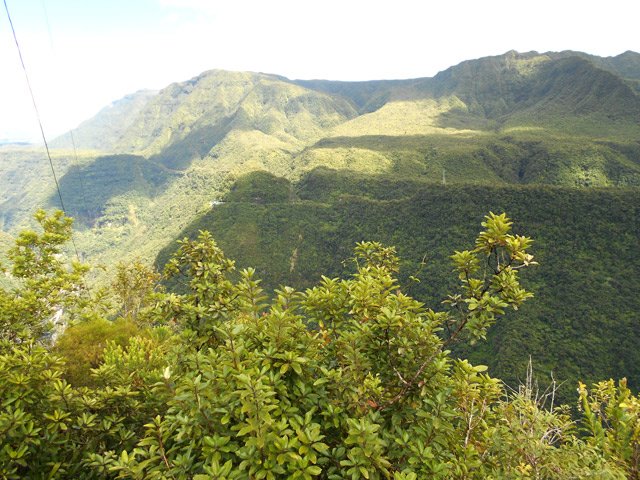 La randonnée débute au parking classique du tour du Grand Etang. Longer les eucalyptus qui bordent l'aire de loisirs puis marcher sur la piste caillouteuse qui rejoint la belle étendue d'eau (Photo 1). La piste monte doucement sur des cailloux dont beaucoup ont été arrachés par les sabots des chevaux. On trouve plus facilement à poser les semelles sur le côté plus herbeux. On s'approche rapidement des berges de l'étang (Photo 2). Les alentours du Puy de l'Etang sont entourés de zones marécageuses. Poursuivre par le large sentier qui contourne l'étang par le nord (Photo 3) et repérer le départ du très discret sentier partant sur la droite, juste en face d'un rein sur l'autre rive de l'étendue d'eau (Photo 4). Le début de la montée s'effectue dans les fougères près d'un pied biscornu de jamrosats (Photo 5). On marche à plat sur une vingtaine de mètres puis le ton est immédiatement donné par la première pente à plus de 75% qui chemine entre les bois de couleurs (Photo 6). Le sentier ne servant qu'aux braconniers, il est assez difficile à suivre mais, avec un peu d'habitude, on le devine instinctivement malgré le nombre des pieds de sabres (Photo 7). Les racines constituent souvent l'essentiel du sentier (Photo 8). Les trouées sont rares et la végétation touffue (Photo 9). L'ancien sentier est encore en bon état par endroits mais sur de courtes distances (Photo 10). La végétation est extrêmement touffue, ce qui permet de mieux repérer le passage (Photo 11). Les épiphytes, orchidées et fougères poussent à même les troncs comme dans toutes les contrées humides (Photo 12). On trouve quelques zones rocheuses qu'il faut contourner (Photo 13). Après une forte montée, on se retrouve près d'une très vieille échelle (Photo 14) qui confirme le bon itinéraire. Elle est rouillée et doit se monter avec attention en fixant bien les mains sur les côtés. Les sabres marrons sont de plus en plus nombreux et on rencontre assez souvent de beaux pieds de palmistes dont il ne faut surtout pas saisir les branches épineuses (Photo 15). La montée continue jusqu'à l'arête d'où l'on bénéficie des premiers points de vue sur les pitons qui dominent l'étang (Photo 17). Mais c'est surtout le magnifique panorama sur l'étang qui fait immédiatement oublier l'effort de la montée (Photo 18). On devine la vallée de la Rivière des Marsouins à travers la végétation (Photo 19). On aperçoit dans une trouée le pylône qui domine l'étang (Photo 20). Poursuivre sur la crête vers ce pylône. A un moment, la végétation est trop touffue ou envahie de fougères et il faut obliquer sur la gauche et redescendre un peu, où se trouvent encore de belles portions de sentier encore en bon état (Photo 21). Le contournement est plat mais il faut immédiatement remonter fortement. Une fois les pylônes atteints, on bénéficie des mêmes points de vue que plus bas (Photo 22). On voit la presque totalité du lac et le regard porte même jusqu'à la côte (Photo 23). De l'autre côté, on distingue correctement la forme caractéristique en tour de contrôle de l'usine de Takamaka (Photo 25). Derrière, à l'horizon, les Deux Mamelles dépassent de l'immense forêt entourant quelques anciens îlets abandonnés (Photo 27). Rien à voir avec les Deux ou Trois Mamelles de Maurice qui se voient de très loin ; celles-ci sont plutôt des mamelons ! Inutile de chercher à poursuivre car la végétation est trop dense à cette altitude et aucun sentier n'y a jamais été tracé. Le retour s'effectue donc par le même itinéraire en prenant garde à ne pas pousser des pierres moussues et instables sur le randonneur qui se trouve en-dessous.