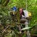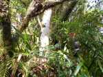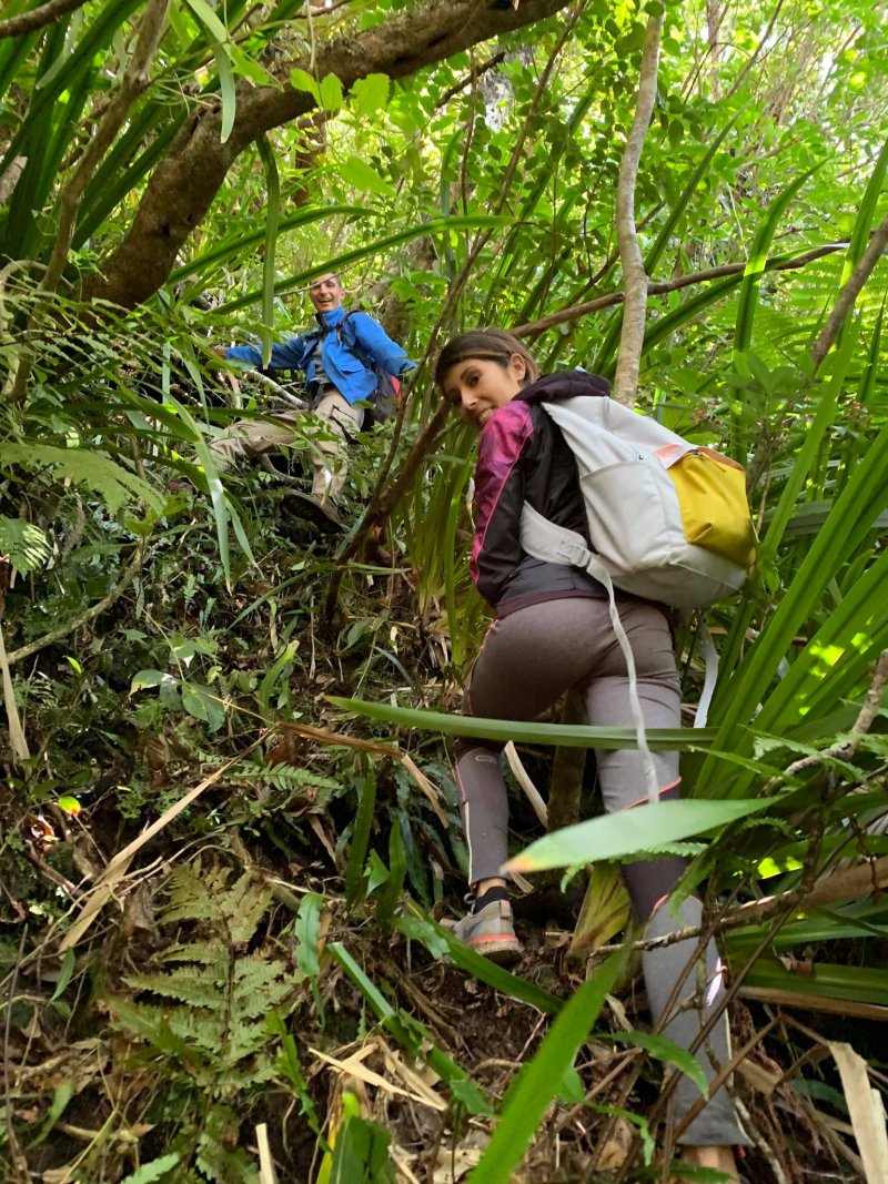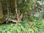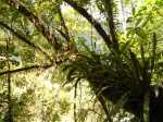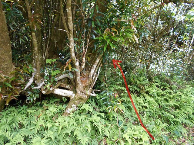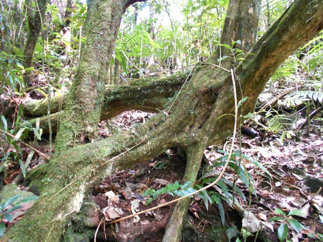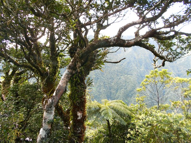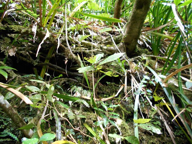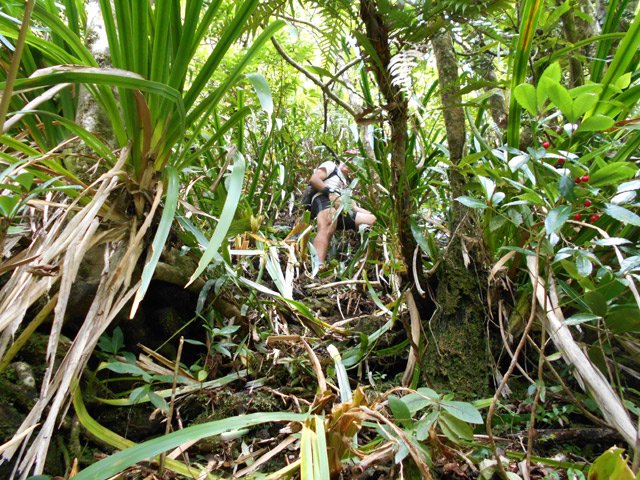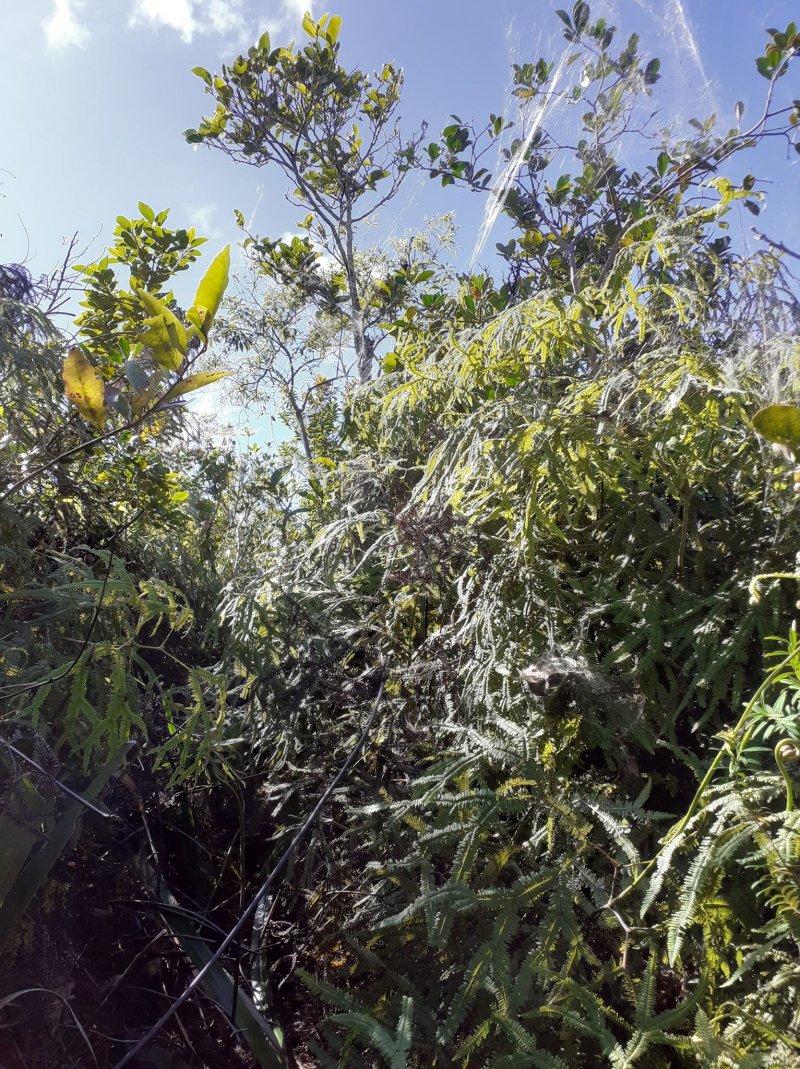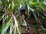 La randonnée débute au parking classique du tour du Grand Etang. Longer les eucalyptus qui bordent l'aire de loisirs puis marcher sur la piste caillouteuse qui rejoint la belle étendue d'eau (Photo 1). La piste monte doucement sur des cailloux dont beaucoup ont été arrachés par les sabots des chevaux. On trouve plus facilement à poser les semelles sur le côté plus herbeux. On s'approche rapidement des berges de l'étang (Photo 2). Les alentours du Puy de l'Etang sont entourés de zones marécageuses. Poursuivre par le large sentier qui contourne l'étang par le nord (Photo 3) et repérer le départ du très discret sentier partant sur la droite, juste en face d'un rein sur l'autre rive de l'étendue d'eau (Photo 4). Le début de la montée s'effectue dans les fougères près d'un pied biscornu de jamrosats (Photo 5). On marche à plat sur une vingtaine de mètres puis le ton est immédiatement donné par la première pente à plus de 75% qui chemine entre les bois de couleurs (Photo 6). Le sentier ne servant qu'aux braconniers, il est assez difficile à suivre mais, avec un peu d'habitude, on le devine instinctivement malgré le nombre des pieds de sabres (Photo 7). Les racines constituent souvent l'essentiel du sentier (Photo 8). Les trouées sont rares et la végétation touffue (Photo 9). L'ancien sentier est encore en bon état par endroits mais sur de courtes distances (Photo 10). La végétation est extrêmement touffue, ce qui permet de mieux repérer le passage (Photo 11). Les épiphytes, orchidées et fougères poussent à même les troncs comme dans toutes les contrées humides (Photo 12). On trouve quelques zones rocheuses qu'il faut contourner (Photo 13). Après une forte montée, on se retrouve près d'une très vieille échelle (Photo 14) qui confirme le bon itinéraire. Elle est rouillée et doit se monter avec attention en fixant bien les mains sur les côtés. Les sabres marrons sont de plus en plus nombreux et on rencontre assez souvent de beaux pieds de palmistes dont il ne faut surtout pas saisir les branches épineuses (Photo 15). La montée continue jusqu'à l'arête d'où l'on bénéficie des premiers points de vue sur les pitons qui dominent l'étang (Photo 17). Mais c'est surtout le magnifique panorama sur l'étang qui fait immédiatement oublier l'effort de la montée (Photo 18). On devine la vallée de la Rivière des Marsouins à travers la végétation (Photo 19). On aperçoit dans une trouée le pylône qui domine l'étang (Photo 20). Poursuivre sur la crête vers ce pylône. A un moment, la végétation est trop touffue ou envahie de fougères et il faut obliquer sur la gauche et redescendre un peu, où se trouvent encore de belles portions de sentier encore en bon état (Photo 21). Le contournement est plat mais il faut immédiatement remonter fortement. Une fois les pylônes atteints, on bénéficie des mêmes points de vue que plus bas (Photo 22). On voit la presque totalité du lac et le regard porte même jusqu'à la côte (Photo 23). De l'autre côté, on distingue correctement la forme caractéristique en tour de contrôle de l'usine de Takamaka (Photo 25). Derrière, à l'horizon, les Deux Mamelles dépassent de l'immense forêt entourant quelques anciens îlets abandonnés (Photo 27). Rien à voir avec les Deux ou Trois Mamelles de Maurice qui se voient de très loin ; celles-ci sont plutôt des mamelons ! Inutile de chercher à poursuivre car la végétation est trop dense à cette altitude et aucun sentier n'y a jamais été tracé. Le retour s'effectue donc par le même itinéraire en prenant garde à ne pas pousser des pierres moussues et instables sur le randonneur qui se trouve en-dessous.