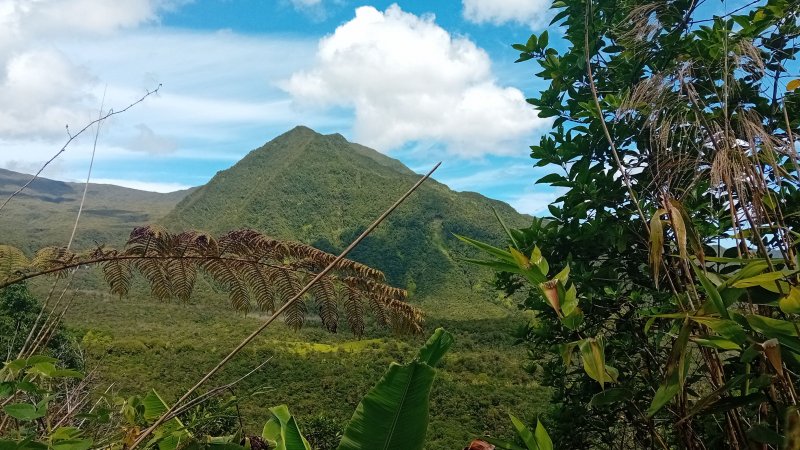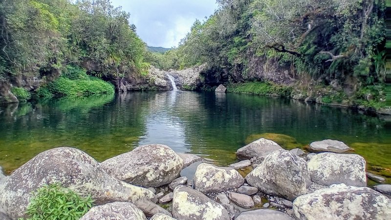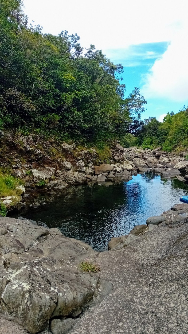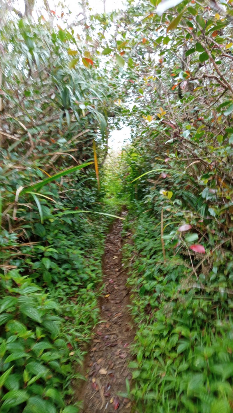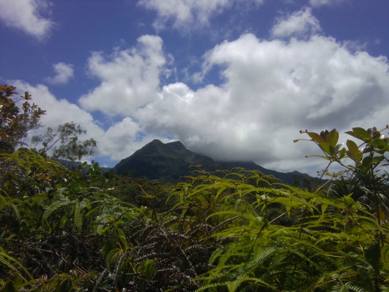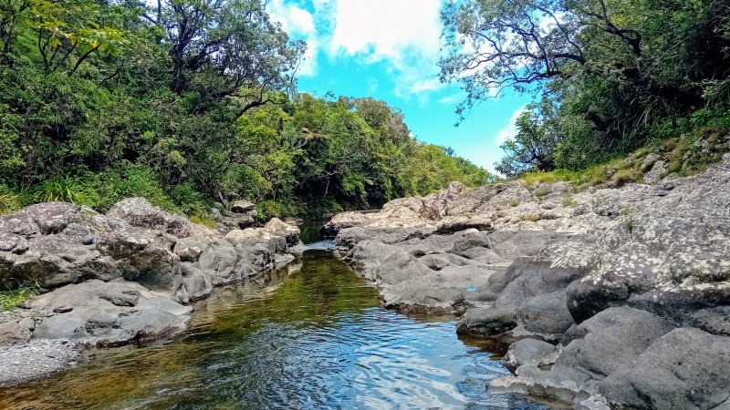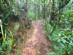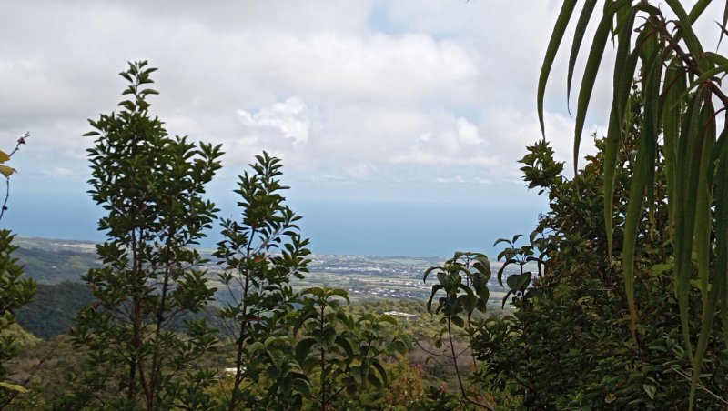 La météo, peu clémente pour cette boucle, en a diminué grandement les qualités. Situé entre la Cascade du Chien et l'Eden, l'itinéraire traverse une partie de la magnifique région couverte de végétation verdoyante du nord de la Forêt des Lianes. Les sentiers boueux une bonne partie de l'année indiquent qu'il est difficile de prévoir un circuit les jours de soleil généreux. La boucle emprunte tour à tour la route, puis la piste avant de se terminer par le sentier de la Caroline et celui moins connu de Terre Rouge. Quelques écarts minimes sont proposés pour s'approcher de bassins mais n'ont rien d'obligatoire puisque situés en marge de la boucle. Les goyaviers dominent très largement les autres espèces. Ils poussent par endroits tellement serrés qu'il est impossible de quitter le sentier. Attention ; le sentier Terre Rouge n'est pas exactement à la place indiquée par la carte IGN mais la petite pancarte plantée assez près de son début ôte tout doute. Par beau temps, on profite de quelques panoramas sur l'océan et la côte vers Bras Panon et Saint-André ou vers les mornes et pics du Bras des Lianes. Il est également intéressant de débuter la boucle aux premiers kiosques vers l'Eden afin de profiter de leurs tables en fin de boucle si c'est l'heure du casse-croûte.