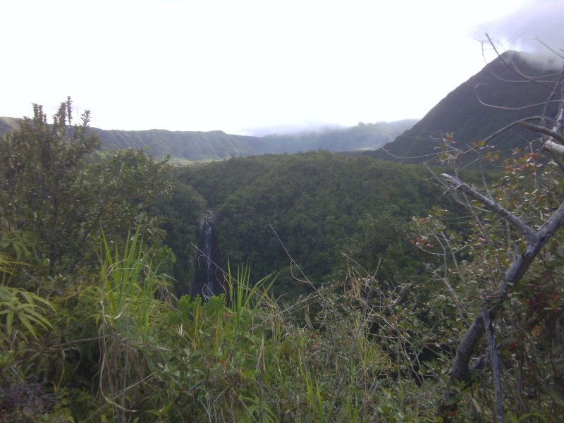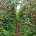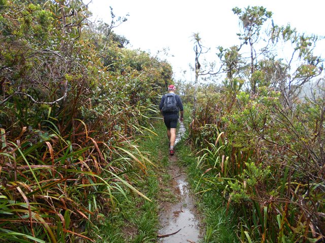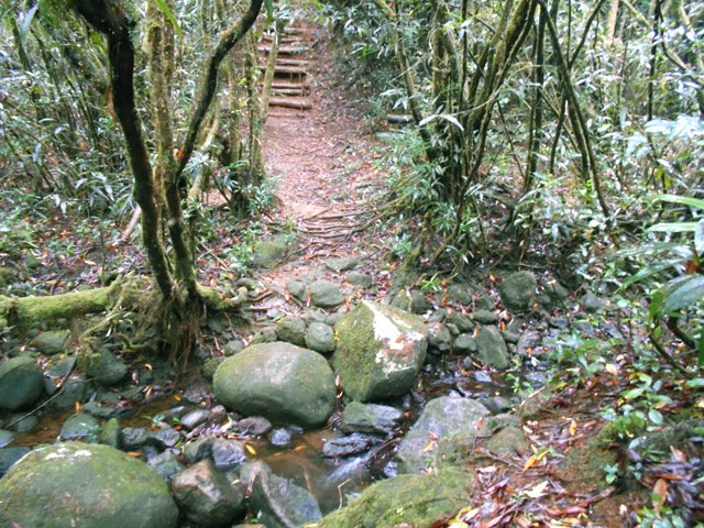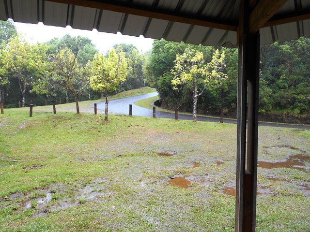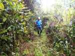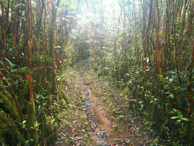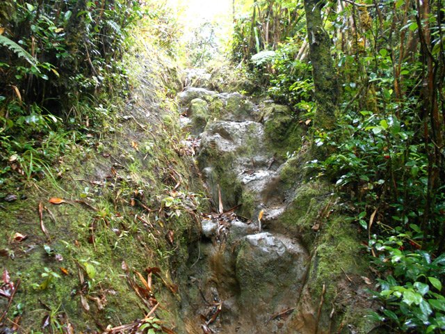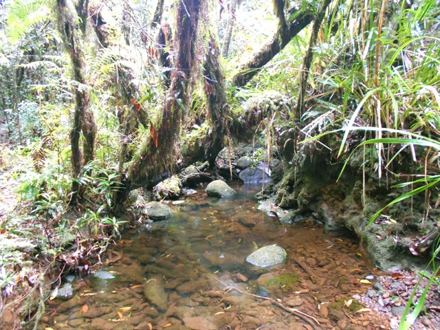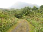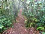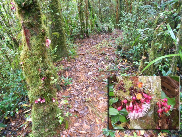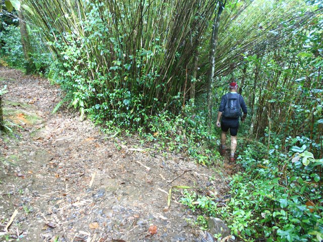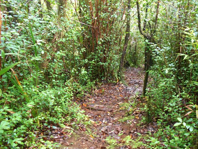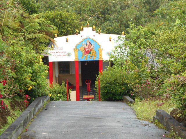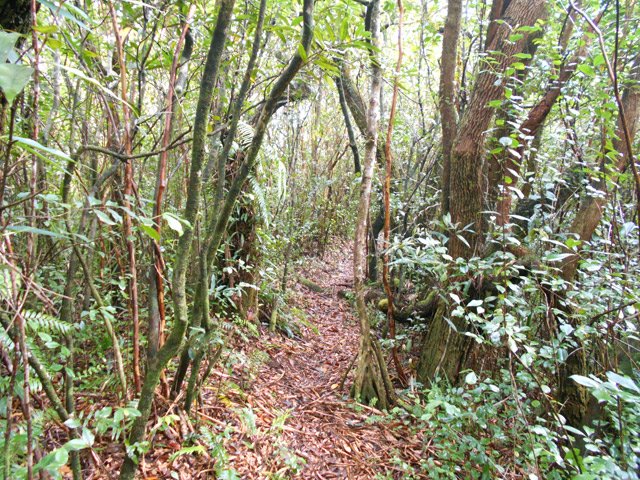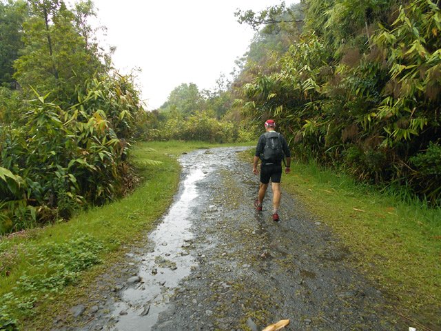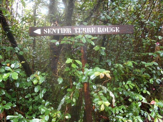 La randonnée débute à une piste sur la droite, à quelques pas avant le belvédère d'où l'on observe habituellement la Cascade du Chien. Ne pas hésiter à emprunter cette petite piste herbeuse et encombrée ça et là de câbles électriques. Après deux minutes, un point de vue permet de voir la chute tombant du Bras des Lianes dans sa presque totalité (Photo 1). Seul le bassin est difficile à distinguer. On pourrait même demander à l'IRT ou l'ONF d'y construire un véritable belvédère qui attirerait certainement plus de visiteurs que la modeste barrière plantée le long de la route. Le sentier qui se poursuit vers le fond de la vallée pour rejoindre le Bras Piton est trop encombré pour l'emprunter sereinement. C'est dommage car il représentait une belle aventure. Emprunter la route, passer devant le point de vue officiel et rejoindre la première piste sur la droite, fermée d'une barrière. Après le premier virage (Photo 2), repérer le sentier abrupt qui rejoint les rives du Bras des Lianes. On atteint sans danger le fond glissant de la ravine entre deux grands bassins. Le premier est alimenté par une petite chute toboggan (Photo 3), le second par quelques remous (Photo 4). Retrouver la piste et poursuivre jusqu'à un nouveau petit sentier qui permet de gagner le haut de la chute. On peut encore continuer vers un petit bâtiment technique et longer la rivière vers l'amont, à condition qu'il fasse beau et que le sol soit sec (Photo 5). Après avoir repris cette piste à l'envers et repassé la barrière il suffit de longer la route en direction des premiers kiosques (Photo 6) entourés de camphriers (Photo 7). La route effectue quelques lacets sur une pente faible, passe près du départ du sentier de la Forêt de Bélouve (Photo 8) et se poursuit en se transformant en piste (Photo 9). Aucun départ de sentier ne vient troubler la sérénité de la marche. Le premier qui se présente dans les fougères à gauche est le bon (Photo 10). Il débute par une longue série de marches de bonne qualité dans les goyaviers (Photo 14). Quelques bois de couleurs résistent encore à l'invasion des sabres bordant le sentier qui se poursuit par une section plate (Photo 12). Le Bras Patrick, qui a pris sa source 500 m plus haut n'est qu'une rigole rocheuse qui se franchit d'une enjambée (Photo 13). Il serpente ensuite en effectuant quelques petites montées et beaucoup de descentes, dont certaines un peu glissantes sur cette glaise qui donne l'impression de ne jamais sécher (Photo 15). Il est le plus souvent large et agréable mais certaines portions étroites et boueuses ralentissent un peu la marche (Photo 16). Les milliers de passages ont créé une rigole au milieu qui devient très glissante par temps de pluie. Un panneau indiquant l'arrivée proche du sentier de Terre Rouge rassure s'il en était besoin (Photo 17). Le sentier devient très agréable et les goyaviers ont presque disparu (Photo 18). Beaucoup de bois de couleurs poussent dans la région dont de belles surfaces de bois de perroquet (Photo 19). Quelques touffes de bambous bordent la descente et c'est près de l'une d'entre elles qu'il faut repérer le sentier de Terre Rouge qui part sur la gauche (Photo 20). La pente est parfois forte et le sol du même type que celui du sentier de la Caroline mais on retrouve hélas les goyaviers (Photo 21) avant de marcher sur des parties herbeuses (Photo 22). La forêt est très touffue et on distingue ça et là des goyaviers à l'attaque : rendez-vous dans 10 ans pour voir l'état de ce jeune bois de rempart (Photo 23). Les bois de pomme sont innombrables créant des petites taches roses de leurs fleurs qui poussent à même le tronc (Photo 24). La pente ne faiblit jamais principalement aux abords des petites ravines. On passe ainsi le Bras Ananas (Photo 25) puis la Ravine Terre Rouge sans difficulté (Photo 26). Certains passages sont assombris par la densité des goyaviers ou jamrosas. Après la Ravine Terre Rouge, une très forte pente se termine à un champ d'une dizaine de mètres de large avant de rejoindre la route de Bellevue les Hauts. Une petite pancarte précise que ce sentier (botanique) a été réalisé par la 304 Environnement du Collège Mille Roches en 2004. Hélas, il ne reste que de très rares pancartes pour le classer encore en sentier botanique. La boucle dans les bois prend fin à ce petit champ et le retour s'effectue alors sur la route qui serpente durant trois km de montée constante en faible pente. Elle traverse des champs, cultures (Photo 27), vergers, élevages, passe devant un temple tamoul (Photo 28), un stand de paint-ball avant de rejoindre la Cascade du Chien, fin de cette boucle.