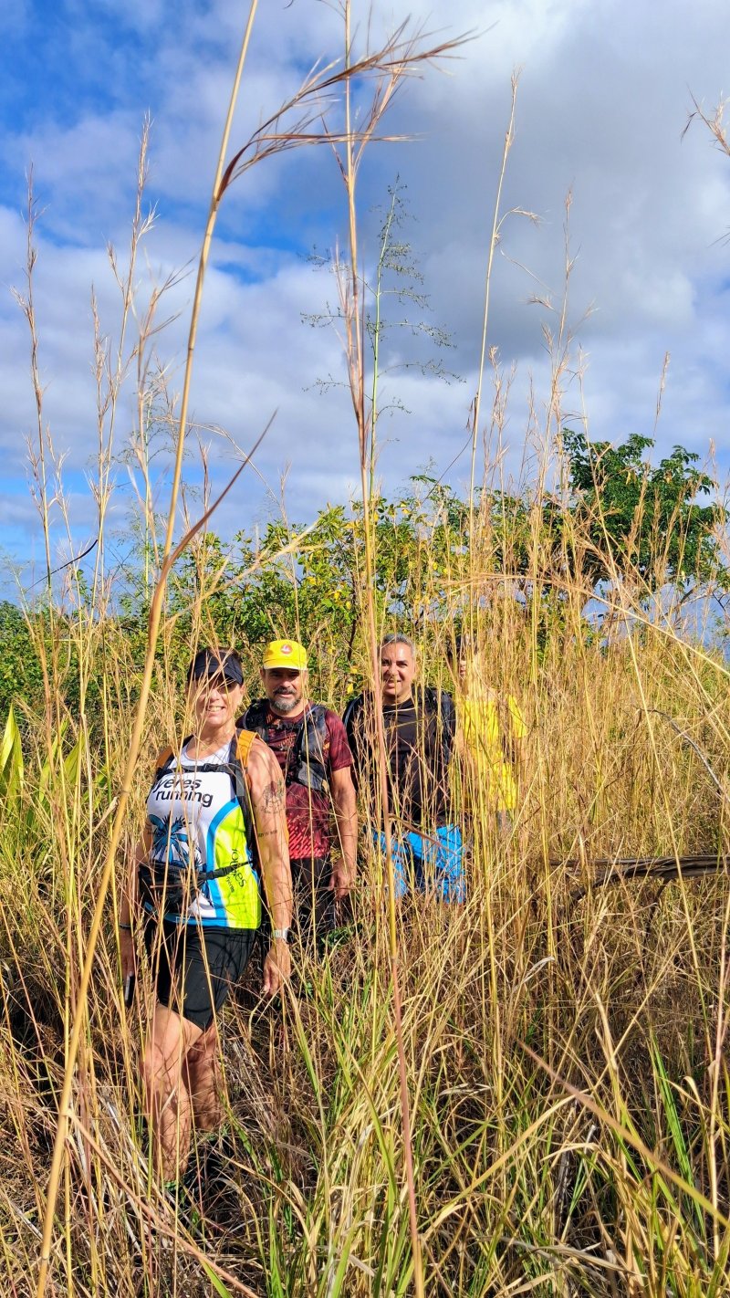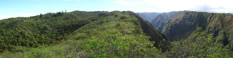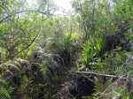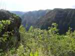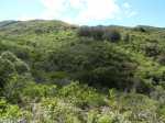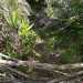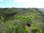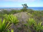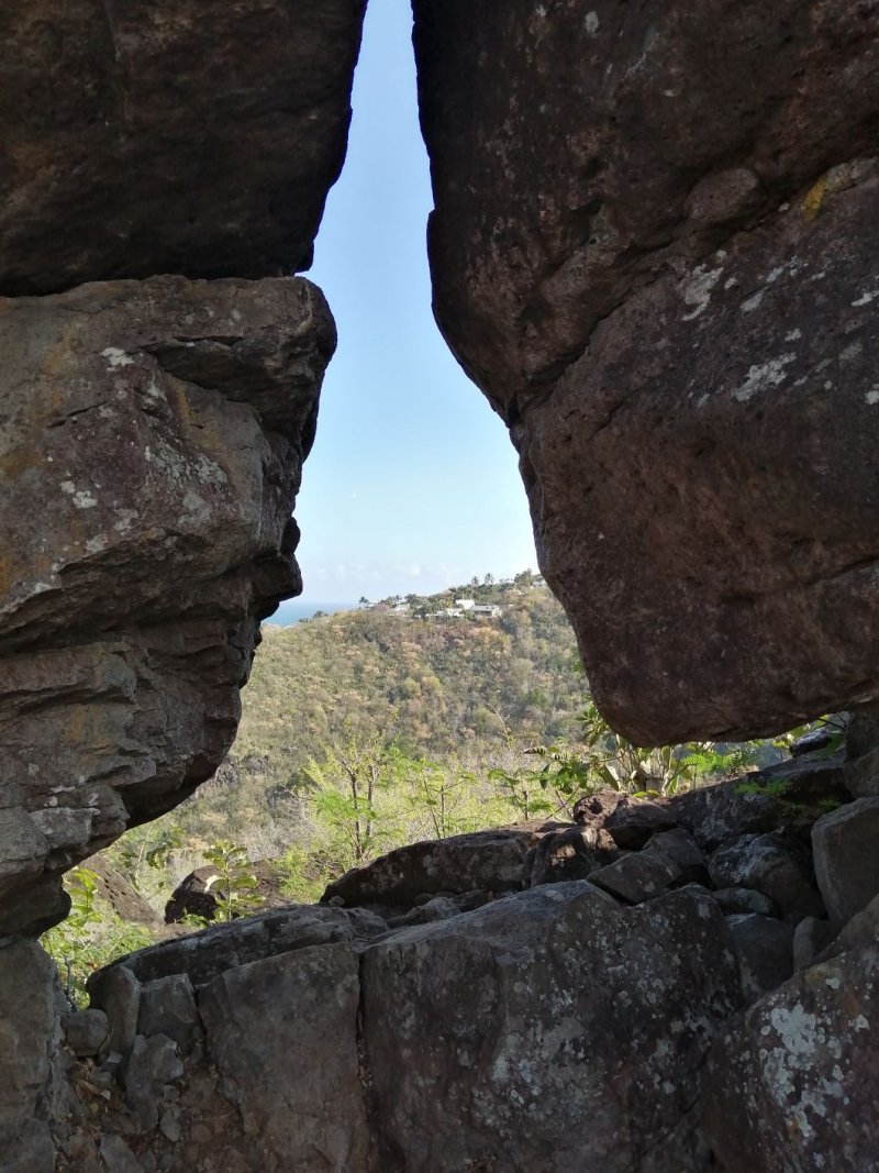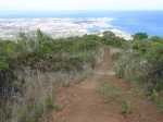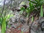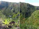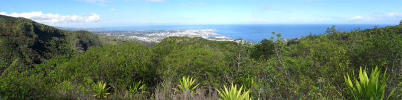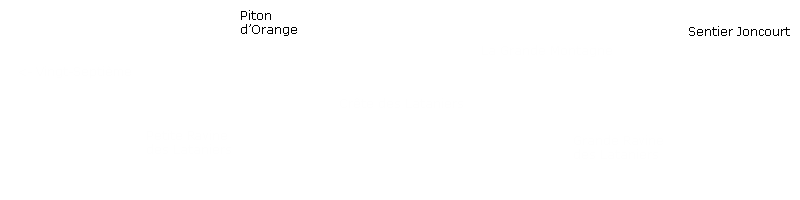 La randonnée débute à ce verger lontan appelé Rostonne et affiché un peu partout Rosthon (Photo 1). Cheminement à plat le long de la ravine, traversée de celle-ci, arrivée dans le verger ombragé sont déjà décrits dans la Randonnée familiale ou dans la Boucle un peu plus longue. Suivre la belle allée qui débute au panneau facile à trouver près du pont de la Grande Ravine des Lataniers à la fin de la Rue Evariste de Parny. Traverser à ravine au fond caillouteux et rejoindre les premiers manguiers qui envahissent le parc Rosthon (Photo 2). Prendre à droite et traverser le verger pour longer la Petite Ravine des Lataniers sur une piste herbeuse et agréable. Laisser à droite celle menant aux Lataniers (panneau) car elle a été défoncée après la construction de logements. Poursuivre jusqu'à la première piste à droite menant aux carrières. Traverser la totalité de l'ancien chantier (Photo 3), ne pas prendre la crête au pylône électrique mais bifurquer à gauche, suivre le bord du rempart artificiel et redescendre vers la Petite Ravine des Lataniers. Ne pas franchir le gué mais tourner à droite à un arbre aux branches écartées semblant donner la direction. Une forte pente très caillouteuse débute rapidement (Photo 4), suivie d'une autre encore plus forte (Photo 5) où il est très difficile de trouver de la terre entre les hautes marches constituées de roches. Après ces difficultés, on parvient à la crête à la rencontre du sentier venant des carrières. Prendre vers la gauche et poursuivre cette belle montée en pente douce qui rejoint plus haut les pylônes de la ligne haute tension. De beaux rochers à travers les tamarins décorent la crête. On retrouve à gauche le croisement du sentier de la boucle venant de la Petite Ravine. Poursuivre tout droit. Moins utilisé que les précédents, il devient plus étroit, plus herbeux et se rapproche de la vallée de la Grande Ravine des Lataniers (Photo 6). Les paysages sont très agréables, tant sur les pitons que vers la mer malgré le caractère très industrialisé du Port. Un sentier part sur la droite en direction du village qu'on aperçoit au fond de la vallée (Photo 7). Les randonneurs tentés par la descente se retrouveront assez vite devant une cabane rustique (Photo 8) en employant un sentier assez facile malgré la descente caillouteuse et les racines (Photo 9). Inutile de chercher à poursuivre sans danger car ce sentier engorgé ne sert plus et impose un demi-tour vers la crête. A partir du précédent croisement, c'est de l'aventure sans l'être vraiment car on ne perd jamais la trace de quelques chasseurs de guêpes passant toujours au même endroit (Photo 11). Suivre ce sentier sans jamais réfléchir car la crête ne dépasse pas les 10 mètres de largeur et on chemine toujours au sommet, bénéficiant ainsi de quelques vues sur la vallée de la Grande Ravine des Lataniers (Photo 12). La végétation est surtout composée de grandes herbes, d'arbustes rachitiques ou de chocas traversés par l'étroit sentier (Photo 13). Le sentier reste cependant visible dans ces zones plus touffues qui dominent la crête (Photo 14). Il frôle quelques roches plus grosses que les autres pour de nouvelles vues du la vallée (Photo 15) et se poursuit toujours sans difficulté (Photo 16). Il ne faut commencer à se poser des questions qu'à partir d'un gros manguier cancéreux couvert de fougères (Photo 18). Partir vers la gauche, écraser quelques fougères qui envahissent vite la trace et se retrouver dans un bois de goyaviers où les chocas ont presque envahi tout le sol (Photo 19). C'est la seule difficulté de la boucle de 10 km car il faut traverser une centaine de mètres, presque à plat, dans la végétation touffue. Suivre pour plus de sérénité les traces de coupe-coupe données aux chocas barrant le passage. On se retrouve ainsi sur un beau sentier dans le bois de filaos aperçu depuis le début de la crête (Photo 21). Ne prendre à droite sous aucun prétexte et bifurquer à gauche sur les aiguilles de filaos (Photo 20). Descendre vers la ravine, passer une rudimentaire barrière de branches posée là par la personne vivant plus haut, franchir le gué et poursuivre sur le sentier jusqu'à une ancienne piste bordée de fougères (Photo 23). A partir de ce point, c'en est fini de toutes les difficultés car il suffit de suivre les pistes étroites car envahies (Photo 24), larges avec beaux point de vue sur la Port (Photo 25), petites routes proches de propriétés agricoles ou maraîchères (Photo 26), route principale de la RD 41 (Photo 27) ou les raccourcis entre ses lacets bordés de superbes villas entourées de non moins jolis jardins. On parvient, après une douzaine de lacets en descente, à l'aire de loisirs de la Corniche. A partir de ce point dominant la vallée, plusieurs manières de rejoindre le point de départ sont possibles (voir les deux autres randonnées). L'itinéraire proposé descend par les citernes rouillées, la piste longeant la Petite Ravine, le gué (Photo 28) et le trajet pris à l'aller mais bien d'autres solutions sont possibles pour raccourcir ou rallonger ce retour au parking.