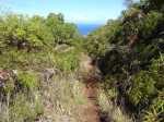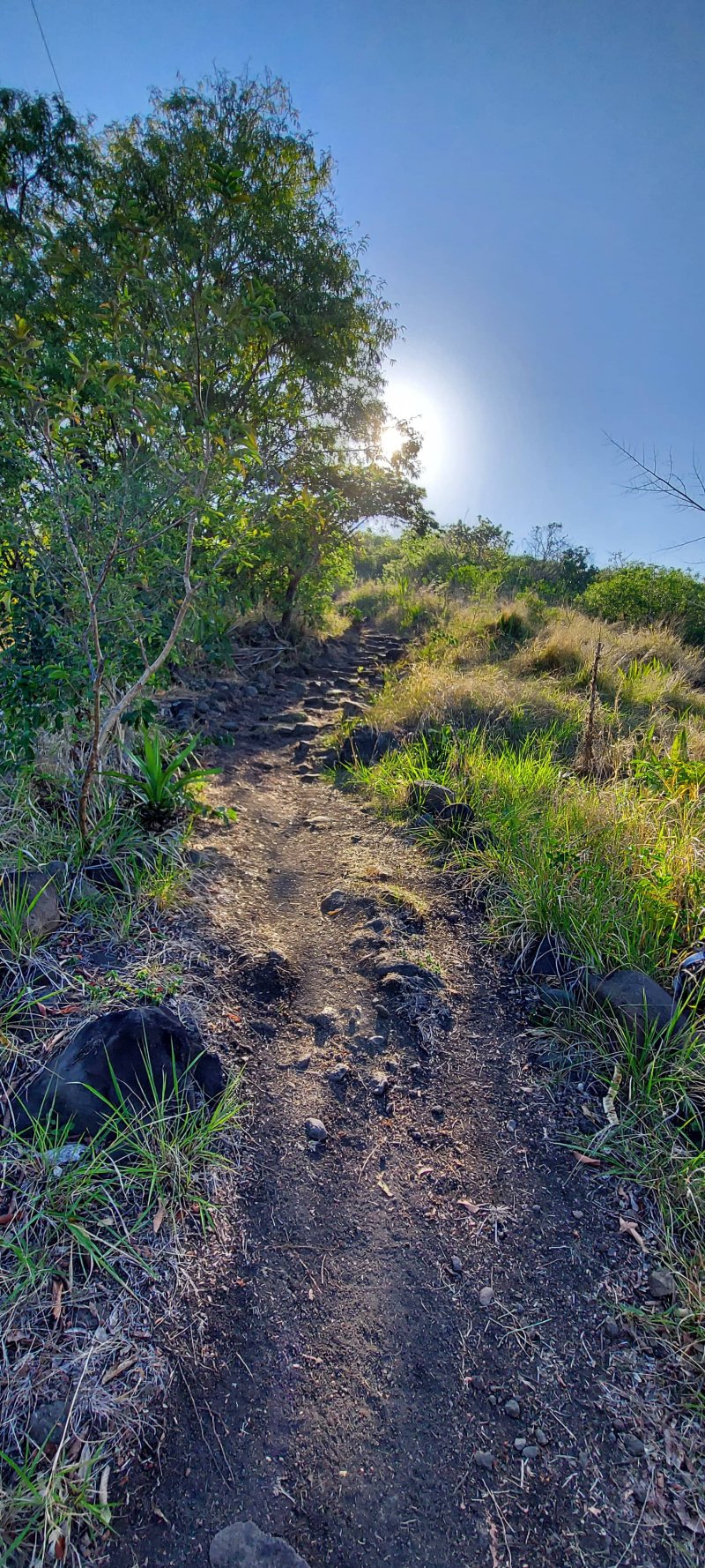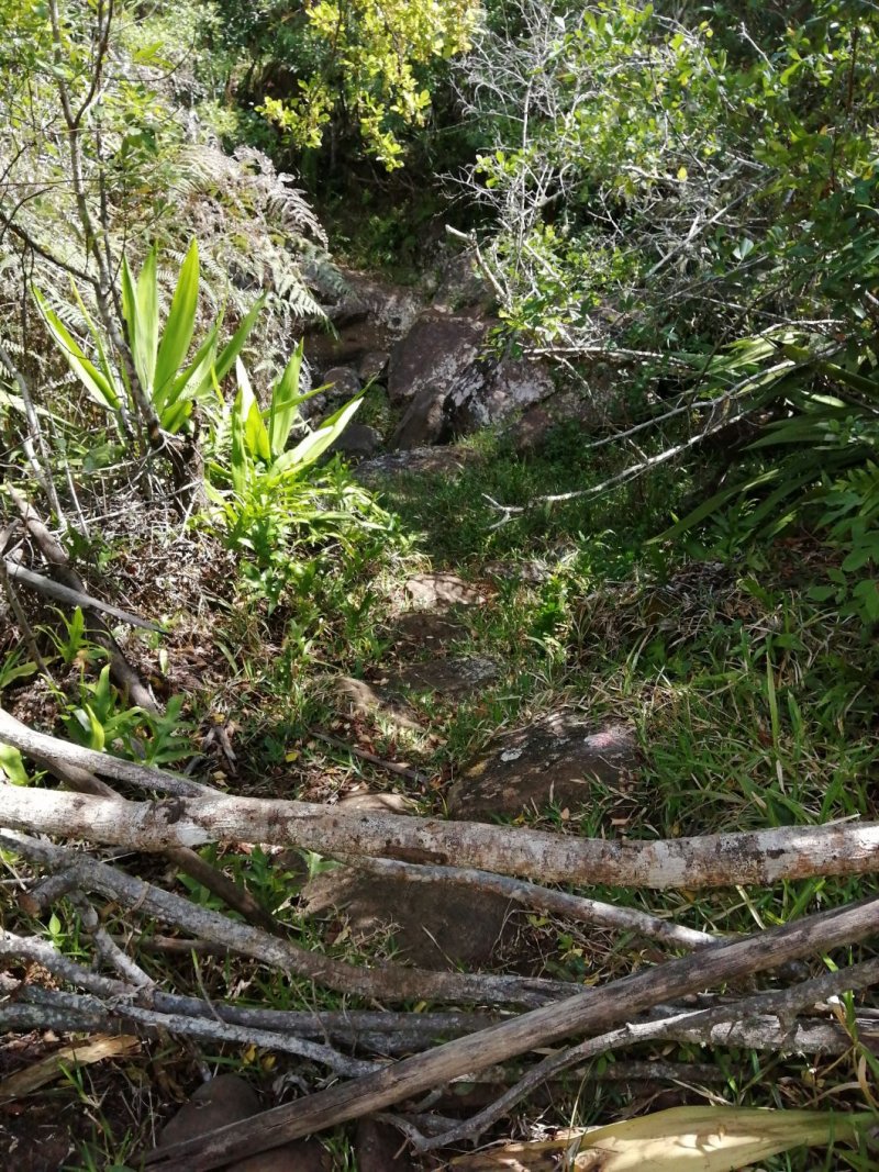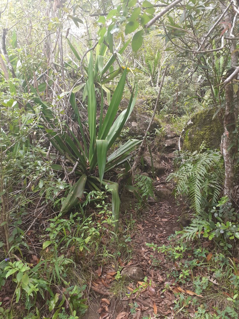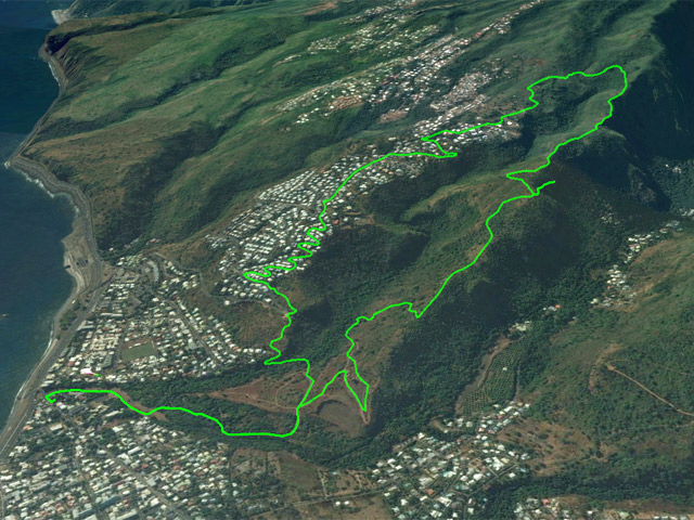 Une trace remarquée lors de la boucle utilisant une partie de la Crête des Lataniers a été le facteur déclenchant de recherche de cette nouvelle sortie dans la région du Verger Rosthon. L'équipe d'entretien des sentiers de la région, interrogée au sujet de cet itinéraire a précisé qu'il est prévu de le réhabiliter au même titre que ceux présentés sur d'autres circuits partant du verger. Le problème actuel semblerait provenir d'une personne vivant dans les hauts de la Petite Ravine des Lataniers. L'intéressé, rencontré lors de cette boucle semble un peu singulier, parle seul, très fort, et donne de loin l'impression que trois ou quatre personnes dialoguent en même temps dans sa case en tôle où il vaut mieux ne pas le rencontrer. Il faut absolument l'éviter car ses réactions semblent totalement imprévisibles et la meilleure solution consiste à passer son chemin sans chercher seulement à l'apercevoir. Pour cela, tourner immédiatement à gauche sous les filaos (voir § suivant) et ne remonter vers la droite sous aucun prétexte. Les randonneurs à l'esprit un peu aventurier effectueront cette boucle avec plaisir. Les autres attendront le nettoyage complet du sentier qui donne l'occasion de magnifiques panoramas sur les hauts des Ravines des Lataniers, sur le Port et la région de Saint-Paul. Le retour emprunte une assez longue portion de route mais traverse de très agréables lotissements par de longues descentes reposantes.