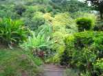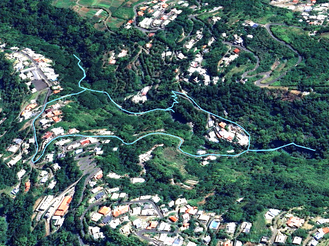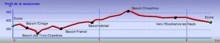 La randonnée débute un peu plus haut que l'école primaire de l'Espérance les Bas qui apparait sur la carte IGN. Sur la gauche de la route une longue bande verte et fleurie a été aménagée (Photo 1). Trouver, parmi les fleurs et objets vieillissants fabriqués en fascines de goyavier, l'étroit sentier qui débute par quelques marches et se poursuit entre deux grillages (Photo 2). C'est étroit mais les épaules et sac à dos passent très bien (Photo 3). Très vite, le sentier plonge vers la ravine par de courts lacets comportant des marches (Photo 4). La pente est raide et les rambardes posées en 2016 ont hélas disparu car les associations ou leurs travaux ne sont pas éternels. On rencontre un croisement de sentiers proche de grosses touffes de bambous. A 10 m, un énorme et magnifique camphrier centenaire mérite une première halte, à moins de la garder pour le retour (Photo 5). En regardant vers le haut, on voit les manguiers sous lesquels on vient de passer (Photo 6). Partir à gauche et entamer la descente. Depuis les lacets, on a déjà une vue sur la Ravine Sèche entourée de nombreux autres camphriers sur lesquels montent de belles lianes de pothos (Epipremnum pinnatum) (Photo 7). Poursuivre la descente jusqu'à un manguier et quelques bananiers (Photo 8). Repérer ce manguier qu'on retrouvera sous peu et prendre à gauche pour rejoindre le Bassin l'Orage, le premier bassin de la boucle. On l'aperçoit déjà dans la descente entouré des bananiers et on entend couler la cascade. La chute qui arrive d'un goulet rocheux est modeste. Elle alimente un beau bassin attirant les jeunes du quartier (Photo 9). Repérer le sentier discret qui chemine en rive gauche et permet de trouver plus bas le Bassin des Trois Chambres. Une jolie chute finit dans un bassin d'eau claire (Photo 10). Ce dernier se vide par un court toboggan en direction d'un étroit canyon très sauvage (Photo 11). Par beau temps, les amateurs de belles photos resteront longtemps à chercher le meilleur jeu de lumière. Poursuivre sur la trace en rive gauche jusqu'au bout du canyon et son nouveau bassin d'eau translucide (Photo 12). Le sentier se poursuit mais c'en est fini pour longtemps des beaux bassins. Pour aller à leur rencontre, remonter la ravine à partir du pont de la Grande Montée. Reprendre le même itinéraire jusqu'au manguier du Bassin l'Orage puis remonter les larges lacets bien marqués en direction des bambous et du camphrier séculaire (Photo 13). Au croisement, partir à gauche en direction de la ravine par une forte descente. Des serres occupent une partie de la rive droite. Longer simplement le cours d'eau vers l'amont en marchant sur les gros galets qui en tapissent le fond ou sur les berges rocheuses (Photo 14). On parvient assez vite à des petits toboggans coulant sur les plaques basaltiques (Photo 15). Contourner un minuscule bassin par la gauche (Photo 16). Quelques mètres plus haut, on parvient au Bassin Franck qui porterait le nom d'un habitant du coin venu y finir ses jours (Photo 17). Un étroit sentier abrupt quitte le lieu en rive gauche et permet de rejoindre le haut à travers de nouveaux manguiers (Photo 18). Reprendre le cheminement au plus près de l'eau et retrouver sans peine le Bassin Zéclair (Photo 19). La chute de près de 10 m est jolie et le bassin très profond. Il est bordé d'une aire de pique-nique comportant barbecue et réserve de bois pour de bons moments à passer près de l'eau (Photo 20). Il y a, hélas, autant de plastique que de bois mais le brûler donnerait mauvais goût aux saucisses ! Il est impossible de poursuivre en remontant le cours d'eau. On est alors obligé de quitter le lieu par un escalier de béton puis de terre comportant de très hautes marches de plus en plus envahies de plantes (Photo 21). L'effort est intense mais de très courte durée avant de retrouver le Chemin Bras Sec. Pendant la montée, les points de vue sont rares mais on devine à un moment la cascade Zéclair un peu plus bas (Photo 22). Prendre à droite et marcher jusqu'au pont. Repérer une aire de pique-nique avec une table mais pas de kiosque (Photo 23). Traverser l'aire et descendre les escaliers menant sous le pont. La remontée est à peu près du même type que la précédente à travers roches et gros galets (Photo 24). Sur la droite, une grande étendue de chouchous bien arrosée couvre le rempart (Photo 25). Le Bassin Chouchou est tout près. Le filet d'eau de la cascade est plus faible qu'en aval et le grand bassin peut se prêter à la baignade (Photo 26). La boucle se termine ici. Une fois revenu au pont, partir à gauche puis poursuivre la boucle par la route jusqu'à l'école. Profiter des beaux points de vue sur le haut de la rivière que l'on vient de remonter longuement (Photo 27) ou en direction de la mer (Photo 28).