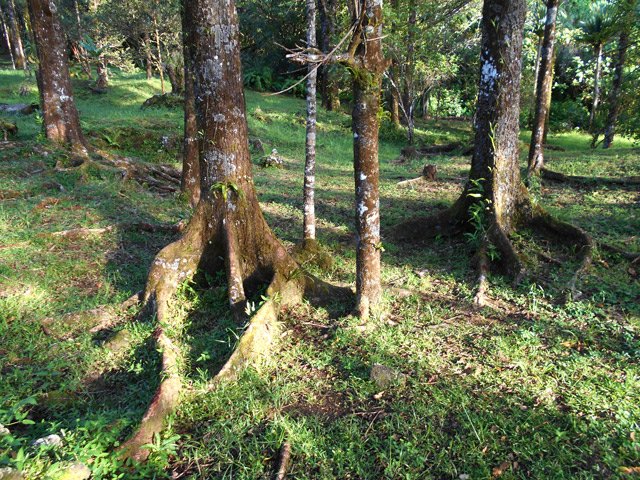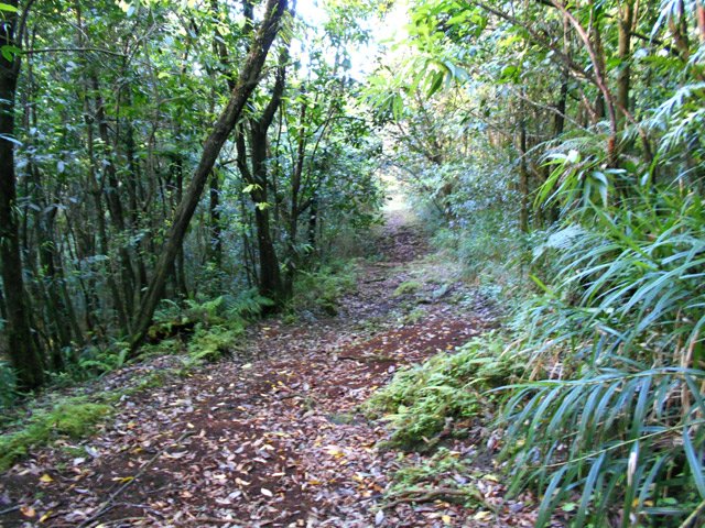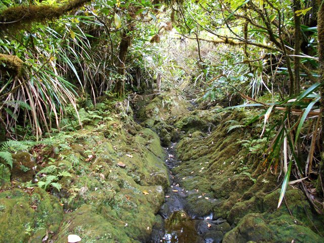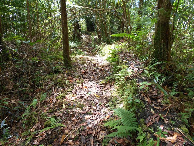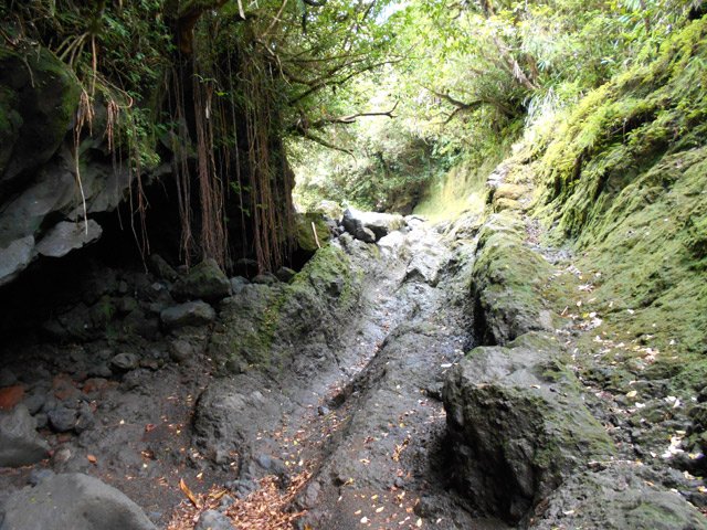 La randonnée débute dans le village de Bois Blanc qui dispose de très peu de places de stationnement. Une aire de repos avec un kiosque et une table est située en rive gauche de la Ravine de Bois Blanc près du pont. Laisser le véhicule sur le terrain herbeux et marcher en direction de la Route Forestière qui pénètre dans l'espace naturel sensible de Bois Blanc. Cette route étroite, déjà utilisée pour le tour de la Forêt de Bois Blanc ou le tour du Piton Indivis est toujours aussi agréable (Photo 1). Sans chercher, on peut pourtant l'éviter en utilisant les nombreux raccourcis qui coupent les lacets en passant au plus près des grands nattes (Photo 2) ou autres bois de couleurs plantés dans l'aire. Plus haut, la piste devient herbeuse et ombragée (Photo 3). Repérer au passage le sentier d'interprétation qu'on utilisera au retour puis poursuivre jusqu'à un croisement de pistes. Celle de droite, moins bien entretenue (Photo 4) s'enfonce dans la végétation touffue et effectue une boucle agréable qui se poursuit par un sentier large et en bon état (Photo 5), traverse des zones recouvertes de fougères et d'orchidées bambou (Photo 6) avant de rejoindre la piste laissée récemment par un étroit sentier. Bifurquer à droite à la petite clairière et poursuivre sur la RF 18 de Bois Blanc qui est régulièrement coupée à chaque passage de ravine par des fossés bétonnés recouverts de grosses grilles rouillées. On passe ainsi la Ravine Ferdinand puis une demi-douzaine d'autres ravines plus ou moins importantes avant d'arriver au gué de la Ravine de Bois Blanc. La piste se poursuit en direction de la Ravine de la Mare. Prendre à droite et débuter la remontée de la ravine au fond recouvert de larges plaques basaltiques grises (Photo 7). Contrairement à d'autres ravines, le manque de végétation lui a conservé sont aspect gris alors que les autres, moussues, sont souvent vertes et glissantes. La marche est facile car on peut très souvent éviter le fond et ses galets. Les cassés, dont certains très profonds, se succèdent à un rythme régulier. Chaque fois, un accès facile, une rampe ou des roches sur les côtés permettent de franchir l'obstacle sans danger. Un seul cassé, presque le plus petit d'entre eux, est délicat à escalader (voir § ci-dessous) et nécessite de passer dans les sous-bois de la rive gauche. On contourne ainsi tranquillement le Piton Nelson en prenant toujours à gauche à chaque confluent. Un gros éboulis nettement visible sur les photos satellites (Photo 15) montre l'impressionnante épaisseur de scories séculaires qui sont parties avec la végétation qui les recouvraient. L'éboulis a laissé de beaux vestiges gris et colorés de tons chauds, ocres ou jaunes (Photo 16). La montée se poursuit, toujours entrecoupée de cassés jusqu'à arriver à un plus vertical que les autres (Photo 19) où, même en cherchant bien, aucune marche, aucune aspérité ou aucun moyen ne permet de passer sans lancer une corde. Il est donc temps de faire demi-tour pour les uns ou de poursuivre pour certains autres qui aiment un peu fouiner et n'abandonnent pas au premier obstacle. Pour cela, longer cette falaise verticale en prenant le fond des confluents de plusieurs ravines qui se réunissent dans ce canyon. La vallée devient plus étroite jusqu'à une haute cascade en pente oblique assez facile à monter mais plus délicate à redescendre. Au-dessus, la ravine se rétrécit encore, devient moussue, s'envahit de sabres et fougères (Photo 20). Entreprendre la descente jusqu'à la Piste Forestière 18. En fonction de la fatigue il est possible de prendre à droite vers la Ravine de la Mare ou du Piton Indivis ou, comme ici, à gauche sur l'itinéraire emprunté en montée. Après avoir passé les grilles métalliques, traversé un véritable tunnel de jamrosats et descendu un peu la piste herbeuse, emprunter sur la droite le sentier d'interprétation qui longe une murette (Photo 24) en proposant des pancartes botaniques vieillissantes. Poursuivre sur le sentier de découverte de la coulée de 1977, traverser la Ravine Constantin puis la Ravine de Bois Blanc laissée plus haut. Après la ravine, on se retrouve très vite dans les cultures et vergers longeant la piste de l'Indivis (Photo 25) qui se termine à la route. Prendre à gauche vers la pont et la fin de la boucle. Juste avant d'arriver, une pancarte portant le nom de Sentier Macoral attire le regard (Photo 26). Il n'en faut pas plus à un randonneur pour aller y voir de plus près. Cet étroit passage, testé pour l'occasion, longe les cases où on est accueilli par de nombreux chiens bruyants. A la fin, il plonge discrètement vers la ravine de Bois Blanc mais il est difficile de trouver une échappatoire de l'autre côté. Profiter de cet écart pour monter au barrage détruit en amont avant de retrouver le parking de l'aire de repos en remontant en aval à quelques mètres du pont.