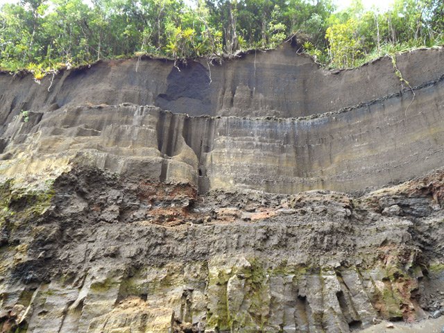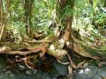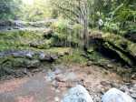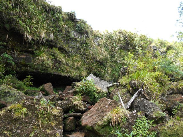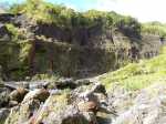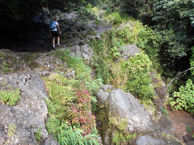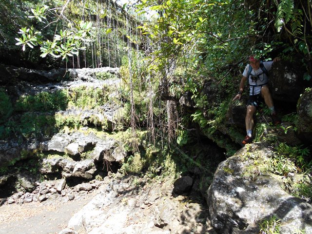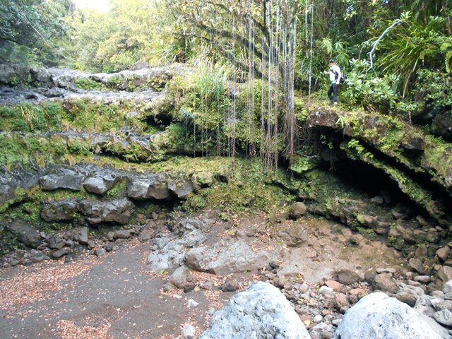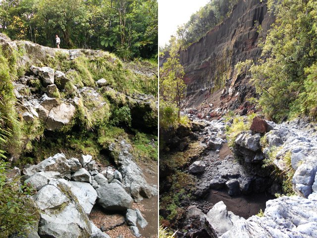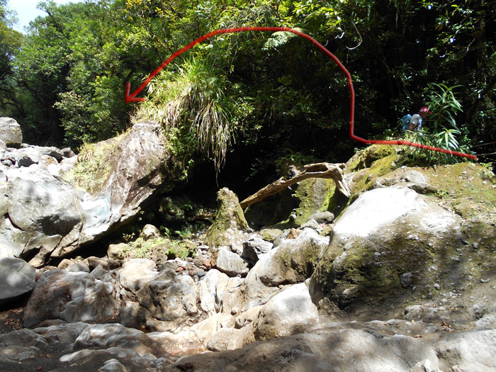 Un cassé de la montée qui ne paye pas de mine est pourtant plus délicat à franchir que les autres de la sortie. La hauteur est faible mais la chute de moins de deux mètres est constituée de basalte lisse qui laisse peu de prise aux mains et aux semelles. Repérer sur la droite en montant un tronc de bois maigre apporté par les eaux (attention, il disparaîtra au prochain cyclone). Se rapprocher de ce tronc puis de la falaise derrière lui et repérer une racine qui dépasse. Elle servira à mettre les mains et ainsi poursuivre vers l'amont par un passage un peu vertigineux, étroit et très vertical mais peu dangereux si on prend bien soin de maintenir fermement le tronc. Ne pas chercher à monter ailleurs car la falaise est verticale et assez longue. On marche moins de 10 mètres sous les arbres assez espacés pour ne pas gêner.