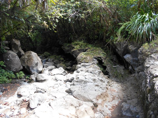 Nouvel échec-mon commentaire du 10/01/17- pour rejoindre le piton Nelson car dès le départ, ravine de Bois Blanc en crue ! On tente malgré tout de jeter un coup d'oeil à partir du sentier Macoral; on reste en rive dr et on monte tranquille à travers des champs de vanille par un petit sentier ; puis on se risque sur les bords de la ravine car plus on monte moins il y a d'eau d'eau! on se dit que le fort débit doit être souterrain puis on arrive alors sur la piste décrite par randopitons à l'endroit où elle coupe la ravine de Bois Blanc pour grimper vers le piton Nelson. On s'arrête là vu l'heure, ravis d'avoir parcouru toute la partie aval de cette ravine avec plusieurs cassés, bassins grandioses. On rejoint Bois Blanc pour découvrir que au même endroit où 5 heures avant ,la ravine était en crue, elle ne coule plus!! Ahurissant! Preuve époustouflante des dangers d'une ravine en crue car imaginons le contraire: on parcourt la ravine sèche et le torrent d'eau et de boue vous surprend!!!! Belle leçon à retenir par coeur......