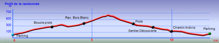 Se rendre à Sainte-Rose ou Saint-Philippe et gagner le village de Bois Blanc - Se garer à une petite aire de repos près du pont sur la Ravine de Bois Blanc - Marcher vers Sainte-Rose et bifurquer sur la route forestière à circulation réglementée de Bois Blanc - Remonter toute cette route et ses rassourcis et poursuivre par les piste qui la prolongent - Effectuer une boucle par la droite sur une ancienne piste avant de traverser la Ravine Ferdinand - Poursuivre sur la piste jusqu'à la Ravine de Bois Blanc - Emprunter le fond basaltique de la ravine et monter sur 2 kilomètres jusqu'à un cassé qui empêche de poursuivre sans matériel - Faire demi-tour par le même itinéraire jusqu'à la piste de Bois Blanc et en direction de la route bétonnée employée dans la montée - Tourner à droite sur le Sentier d'interprétation de Bois Blanc et poursuivre sur celui de la coulée de 1977 - Traverser la ravine Ferdinand puis celle de Bois Blanc et retrouver le Chemin Indivis dans les cultures - Prendre à gauche et rejoindre la RN2 puis le parking.