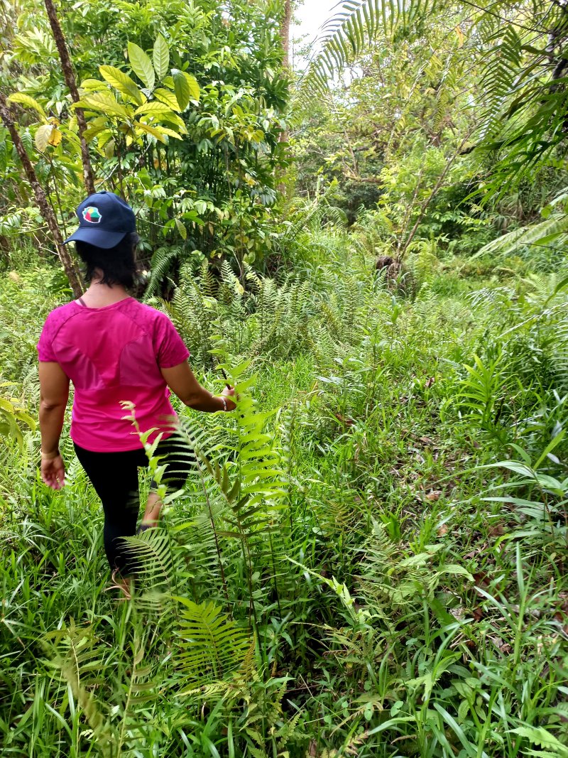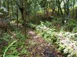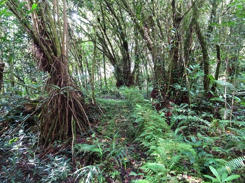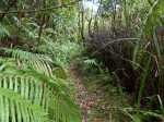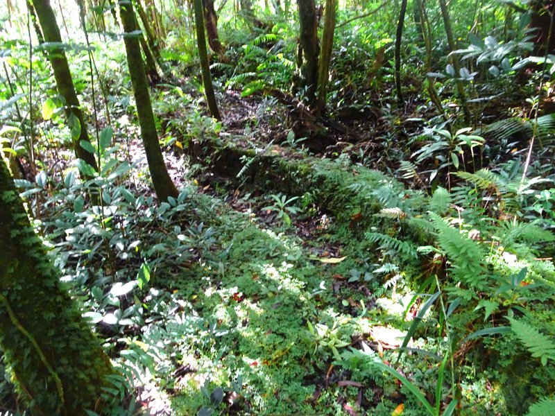 Un grand merci à la trace GPS ! Heureusement aussi qu'il était là aussi pour la suite du sentier pour redescendre. En effet, c'était une avancée quasiment à l'aveugle dans les herbes assez hautes vu la saison chaude (et extrêmement humide dans ce coin !) qui ont recouvert le sentier et empêchent de le distinguer. Seule la murette en pierres (Photos 8, 9) est encore un peu visible, nous l'avons longé en suivant à peu près la trace GPS (2 indicateurs en valent mieux qu'un). Pour reprendre le sentier sur l'autre rive de la Ravine Ferdinand, pas évident de voir le sentier. Conseil : essayer de bien suivre la trace GPS et descendre légèrement en contre-bas (6 ou 7 mètres je dirais), on le distingue par la végétation plus claire et l'accès plus facile.