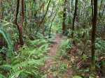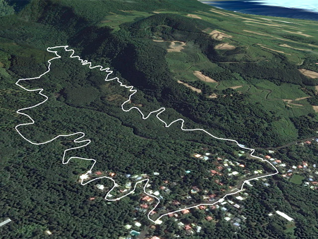 La randonnée débute à la petite aire de pique-nique implantée au cœur du village près du pont sur la Ravine de Bois Blanc. La piste commence à quelques mètres de là en marchant vers Sainte-Rose et en bifurquant sur la gauche. Elle est accessible sur autorisation et serait sinon très fréquentée en raison de la beauté du lieu. Une barrière, le plus souvent levée marque le début de l'espace naturel kilomètres (Photo 1). La montée est faible et régulière sur deux kilomètres sous les grands nattes et quelques autres essences (Photo 2) . Quelques raccourcis sont laissés aux plus sportifs car la pente qui relie les lacets de la route sont en pente assez forte. L'endroit est bien entretenu, la route propre, la pente faible et de larges clairières rendent le lieu reposant kilomètres (Photo 3). La route se transforme en piste herbeuse avant la fin de la montée (Photo 4). Elle se rapproche très près du rempart et de la petite ravine qui le longe. Certaines zones non boisées sont couvertes de fougères parmi lesquelles poussent de hautes orchidées bambous kilomètres (Photo 5). Après les derniers lacets courts, on remarque sur la gauche un panneau délabré souhaitant la bienvenue aux marcheurs (Photo 6). Le sentier pénètre aussitôt en sous-bois et longe une petite murette construite à l'époque avec goût mais depuis recouverte de fougères et de mousse (Photo 7). Les parties plates du sentier retiennent l'eau et le rendent boueux par endroits kilomètres (Photo 8). Des vestiges de cette murette sont en meilleur état par moments kilomètres (Photo 9). La parcours traverse quelques clairières où pourrissent tranquillement des racines kilomètres (Photo 10). Des pancartes moussues et de plus en plus difficiles à lire sont plantées près de certaines variétés de plantes kilomètres (Photo 11). Le sentier, étroit et parfois un peu boueux passe au plus près de cette murette avant d'arriver à une clairière ou des flèches dirigent vers une petite plantation de cacaoyers. Le sentier semble s'arrêter là mais on le retrouve sans difficulté si on retourne à la murette avant d'entamer une légère descente. Sur la droite, un autre panneau, tout aussi délabré que le premier, souhaite cette fois la bienvenue aux marcheurs sur la coulée de 1977 (Photo 12). De cette coulée, il ne reste rien de visible dans les bois de goyaviers qui l'ont recouverte kilomètres (Photo 13). Les fougères semblent se plaire beaucoup si on en juge par la longueur de leurs frondes mais elles en gênent pas la progression kilomètres (Photo 15). On longe la Ravine Ferdinand qu'on devine à travers la végétation puis on la coupe un peu plus loin par un gué à sec (Photo 17). Difficile de trouver des traces nettes de la coulée en raison de l'envahissement du sentier par de nombreuses racines (Photo 18). Si elle comporte de belles portions plus en hauteur, elle ne mérite pas ici qu'on tente une exploration. La forêt devient un peu moins touffue (Photo 19). La Ravine de Bois Blanc est plus imposante avec son large lit basaltique entrecoupé de cassés dangereux si on s'approche de trop près (Photo 20). Contrairement à la précédente, il est possible, par temps sec d'en remonter une partie pour donner un petit goût d'aventure à cette boucle banale kilomètres (Photo 21). On parvient en quelques minutes aux premières cultures, vergers et cocoteraies kilomètres (Photo 22). Il suffit alors de bifurquer sur la gauche pour suivre le Chemin Indivis à travers les cultures. Le cheminement sur l'herbe puis sur le béton est très facile et on rejoint la route nationale sans aucune difficulté après avoir longé quelques habitations kilomètres (Photo 25). Le véhicule est à environ 500 mètres en longeant la route où il faut tout de même prendre garde à la circulation.