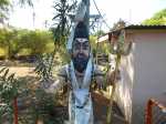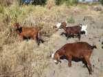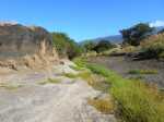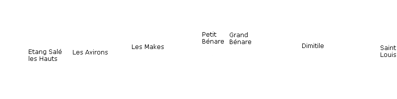 La randonnée débute sous le pont de la RN1 près du radier de la Ravine du Gol. Une piste poussiéreuse passe entre la longue bretelle de sortie vers l'usine (Photo 1) et la rive droite de la ravine. En s'approchant de la mer, elle est pleine d'eau (Photo 2) et ressemble aux étangs qu'on rencontrera plus tard. Les tilapias fuient par dizaines dès qu'on s'approche des berges. Quelques vachettes passent ici le plus clair de leur temps (Photo 3) à ruminer en attendant les fortes chaleurs de la journée. Ralentir le pas près des berges des étangs pour y voir évoluer les poules d'eaux, échassiers ou migrateurs à la saison. Après avoir marché dans l'herbe entre les principales étendues d'eau, on rejoint une piste dans les premières cannes à sucre. A l'approche de la station de lagunage, bifurquer à droite en échappant à la meute de chiens plus bruyants que dangereux et regagner le tunnel sous la route nationale. Attention, à certaines saisons, ce tunnel peut être envahi d'eau sur des hauteurs raisonnables qui recouvrent le sentier bétonné permettant de le franchir. Poursuivre par cette longue allée étroite bordée de très hauts cocotiers (Photo 7) en profitant de larges panoramas vers les cirques et les hauteurs du Dimitile. On pourrait partir sur la droite pour rejoindre l'usine mais la circulation assez importante incite à poursuivre en face et emprunter plus loin une piste vers la droite. Cette piste, bouchée d'un grand tas d'ordures (Photo 8) plus dissuasif que la barrière qu'on aperçoit à l'arrière impose de reprendre sur la droite pour gagner l'usine. Prendre à gauche une nouvelle piste caillouteuse et sableuse (Photo 9) pour rejoindre les premières maisons du Gol les Hauts. A la fin de cette piste puis de la route qui la prolonge, un petit sentier permet de se rapprocher de l'église du village. S'il est bouché par la végétation, emprunter la Rue des Albizias pour s'en approcher. La coquette petite église (Photo 11) comporte également une grotte artificielle abritant une Vierge. Prendre la Rue Mendès France puis la Rue de Prétoria (Photo 12) pour descendre vers le stade qu'on longe par la droite. La Rue Bory de Saint-Vincent puis une courte portion de la Rue du Général de Gaulle terminent la partie goudronnée de la boucle. On ne peut manquer le pont-canal, une demi-canalisation métallique traversant la Ravine du Gol sur de hauts piliers (Photo 13). Des petites sentes partent dans tous les sens. Deux d'entre elles permettent de retrouver le fond de la ravine ; la première, à gauche en visant le grand arbre, l'autre en partant en rive droite pour passer quelques blocs rocheux. Une fois dans le lit de la rivière à sec, plus besoin de réfléchir. Marcher sur les galets ou les sentiers créés par les multiples passages et franchir le pont détruit et reconstitué par une partie métallique (Photo 15). Les points de vue sur le Dimitile font oublier un instant la sécheresse du lieu (Photo 16). Un petit détour amène à un modeste temple malabar (Photo 17) avant de revenir au fond de la ravine. Le fond est souvent couvert d'herbes (Photo 18) dans lesquelles broutent quelques chèvres. Plus loin, on longe des petites falaises (Photo 21) ou un bassin d'eau croupissante (Photo 22). La ravine se rétrécit et se couvre de hauts papyrus où le sol est plus difficile à deviner. La recherche du meilleur passage (Photo 23) se termine à une passerelle en ruine en assez bon état malgré l'absence de plancher (Photo 24). La végétation jusqu'au véhicule devient trop dense. Partir sur la droite à la passerelle et rejoindre une friche comportant des traces d'incendie (et bien sûr des ordures). La route est à moins de 100 mètres et on frôle l'usine du Gol (Photo 25). Quand on devine le véhicule sous le pont, traverser la route et marcher en direction d'un terrain d'entraînement de karting et repérer sur la droite le mur du cimetière des Ames Perdues. On comprend vite pourquoi il porte ce nom en voyant toutes ces croix symboliques sans dates ni noms (voir § ci-dessous pour plus d'explications - Photo 27).