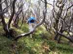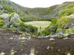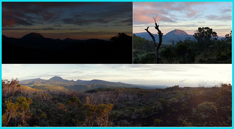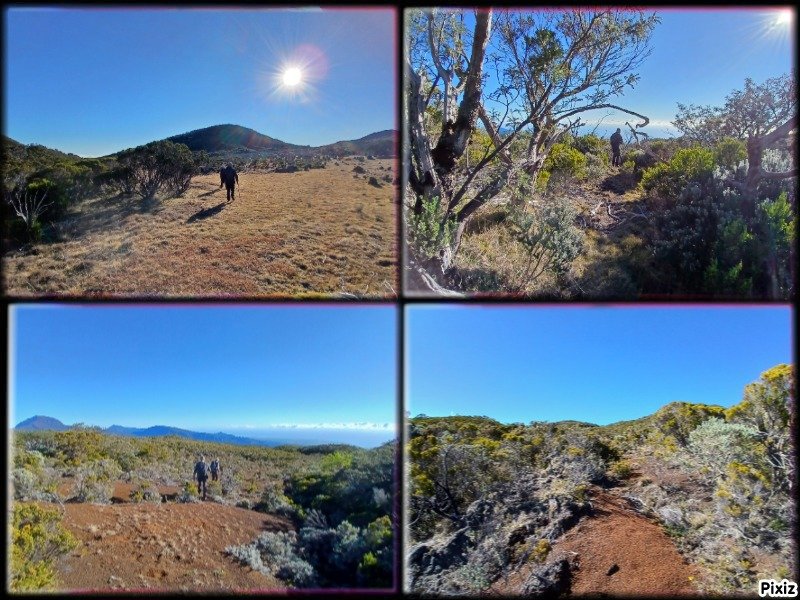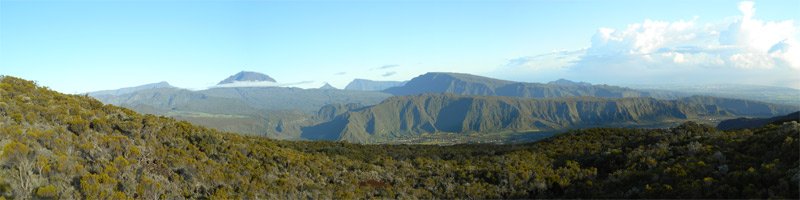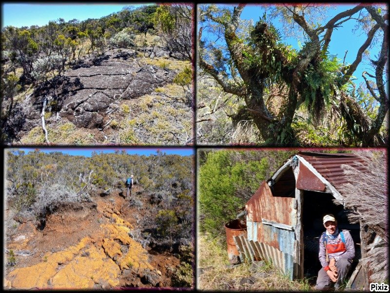 La randonnée débute au Piton de Sable dont le fond recouvert d'eau donne de beaux clichés de jour lorsque le Piton des Neiges s'y reflète. Le matin, très tôt, ce sont les nuages et le pylône du Piton Textor qui miroitent (Photo 1). Attention, il n'y a pas d'eau toute l'année mais on est assuré d'en voir après les forts épisodes pluvieux. Après cette balade semi-aquatique, rejoindre la route forestière du Volcan par n'importe quel itinéraire, comme sur la carte ci-dessous, pour bien débuter ce hors sentier de près de 10 km. Prendre la direction du Piton de Caille en filant plein nord sur des sentiers existants ou déjà en traversant la savane entourant le Piton Textor. Le centre du cratère du Piton de Caille, déjà escaladé lors d'une autre randonnée, s'atteint par un petit sentier de vaches rencontré en marchant sur le Sentier du Piton Textor. La pente est faible et le cheminement s'effectue un peu penché en raison des branches basses. La prairie qui en couvre le fond incite au bivouac malgré l'absence d'eau (Photo 2). Poursuivre vers le nord et cherchant le meilleur passage entre les plantes (Photo 3) et en repérant au plus vite la petite ravine qui grandit au fur et à mesure de la descente vers le cassé du Grand Bras Piton. On randonne sans difficulté en longeant la ravine ou ses abords dans les zones dénudées ou couvertes de petites plantes, principalement les branles verts (Photo 4). Les panoramas sur la Plaine des Palmistes et les grands massifs de la Réunion deviennent de plus en plus larges, du Piton des Neiges jusqu'au Mazerin (Photo 5). Plus on approche du cassé, plus il faut suivre le fond étroit de la petite ravine où les amateurs de natures mortes se régaleront des belles trouvailles (Photo 6). On parvient ainsi à une profonde vallée de 300 mètres de profondeur où l'on aperçoit le lit chaotique du Grand Bras Piton. Attention à la chute car la falaise est vertigineuse mais la vallée est magnifique (Photo 7). Pour rejoindre le Grand Bras Piton, rivière principale de la zone, il faut revenir sur ses pas et obliquer sur la gauche dès que le sol dénudé revient. Ne pas hésiter à descendre cette ravine basaltique offrant tous les 10 mètres une petite merveille de la nature. Attention tout de même lors des franchissements de plus en plus difficiles vers le cassé qui ne sont pas obligatoires. Le sentier, ou plutôt le passage, s'effectue par moments sur de belles plaques de lave jaunies par les oxydes (Photo 9). Repartir en remontant la ravine, le plus souvent dans le fond (Photo 10). On remarque sur la gauche des poteaux et une clôture barbelée qui semble sortie de nulle part (Photo 12). Rejoindre cette longue enfilade de poteaux réguliers et la suivre au plus près. Il faut parfois s'en éloigner d'une dizaine de mètres pour contourner une touffe de plantes, mais on la retrouve très vite. On arrive près d'une petite case en tôle (Photo 14) entourée de beaux tamarins (Photo 13) avant de rejoindre à nouveau le fond de la ravine (Photo 16). Remonter un peu sur le basalte puis obliquer sur la gauche pour entamer une rude montée vers le sommet du Piton des Treize Cantons. Il y a partout des sentiers de vaches et le but consiste à atteindre le haut par le chemin le plus court pour les sportifs ou le plus sinueux si la fatigue se fait. Le fond se trouve facilement après cette petite grimpette. On retrouve une nouvelle prairie qui tapisse le fond du cratère, fort heureusement délaissée de toute plante invasive (Photo 17). On a de ce bord de piton de magnifiques vues sur la Plaine des Palmistes (Photo 18). Le cheminement reprend dans les branles (Photo 19) pour se retrouver nez à nez avec cette longue clôture barbelée. Reprendre donc le chemin en longeant toujours au plus près sur une forte descente (Photo 20) bordée de magnifiques tamarins des Hauts aussi biscornus les uns que les autres (Photo 21). Même les arbres morts sont superbes. La clôture fait de nombreux zigzags et il suffit de la suivre sans réfléchir. Elle se termine à la Route Forestière du Piton de l'Eau. Traverser la RF, retrouver le sentier du Piton de l'Eau et le franchir pour garder à l'esprit le hors sentier total. Viser le petit piton, bien visible dans la végétation (Photo 22. Comme précédemment, chercher les meilleurs passages pour franchir le col entre deux nouveaux pitons. On retrouve sans surprise le Grand Bras Piton dont un affluent propose un petit coin très sauvage près d'un cassé de cascade (Photo 23). Ne pas hésiter à l'atteindre. On devine même une grotte en partie cachée par des tamarins maigrichons et de grands branles verts (Photo 24). A partir de là, on aperçoit certains virages de la route du volcan et des véhicules qui servent de repères. Marcher sur les meilleurs passages, souvent recouverts de lapillis (Photo 25) entre la route et le sentier du Piton de l'Eau. De minuscules ravines creusées dans le tuf orangé créent ce beaux paysages (Photo 26). Le pylône du Textor sert également de repère s'il n'y a pas de brouillard (Photo 27). Les balises rouges et blanches rencontrées en fin de ce long hors sentier indiquent qu'on a retrouvé le GRR2 qui remonte à l'Oratoire Sainte-Thérèse. Suivre le GR jusqu'à la route et au parking du Piton de Sable.