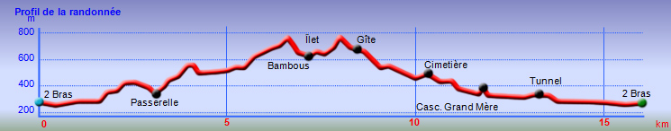 La randonnée débute à Deux Bras. La balade est facile le long de la rivière. Il faut très vite passer quelques gués en ayant tout d'abord marché sur des pistes de qualité ou des zones caillouteuses. A la Porte (Photo 1), prendre totalement à gauche l'escalier en pierre qui monte raide pour franchir une zone verticale bien protégée du vide (Photo 2). La grimpette se poursuit sur les cailloux (Photo 3) et quelques parties plus sableuses. Plus tard, on aperçoit sur la gauche la passerelle sur la Bras d'Oussy qu'on rejoint par quelques lacets courts. Le coup d’œil vers le bas est toujours impressionnant. La montée vers l'Îlet Bois Rouge est à flanc de falaise bien protégée du vide par des câbles et une passerelle (Photo 4). Avant de poursuivre pour grimper le bas du Piton Tortue, il faut se retourner pour un dernier regard vers la passerelle et la profonde vallée (Photo 5). La montée des flancs du Piton Tortue est régulière sur marches et terre bordés d'herbes jaunissantes (Photo 6). La végétation est assez pauvre jusqu'au col (Photo 7). A partir du col, on se sent enfin dans Mafate avec les premiers paysages sur le Piton des Calumets, le Maïdo ou le Sentier de la Canalisation des Orangers. Grand Place se rejoint tout d'abord par une longue ligne droite presque à plat à l'ombre des bois d'olives, benjoins ou autres essences récemment plantées. La fin, sur marches de pierre et murettes sur le côté est un peu plus difficile. On parvient enfin à Grand Place en profitant de magnifiques panoramas sur Cayenne et les montagnes qui l'entourent (Photo 9). La montée vers l'Îlet Moutou va bientôt pouvoir commencer. Prendre pour repère la boutique du facteur de Mafate et garder pour la fin la visite à sa statue. Marcher en direction de l'Îlet à Bourse. 15 mètres exactement avant l'embranchement vers le Plateau de Gousse (poteaux de l'ONF), repérer une discrète ravine et une petite canalisation claire. Le sentier débute ici. Il est en très bon état sans doute en raison des manguiers qui poussent dans le coin. Le regard porte tout droit sur ce sentier qui remonte vers le Piton Canal mais il faut vite le délaisser pour chercher à gauche le petit cairn sous un pied de jamblon (Photo 11). Filer entre quelques chocas et suivre sans hésiter ce sentier encore correct malgré les années d'oubli. Il passe sous les filaos ombragés en traversant chocas, fougères, galaberts, hautes herbes et surtout beaucoup de pieds de vétiver (Photo 12). On atteint sans effort le col pour une vue inédite et grandiose sur la vallée du Bras d'Oussy, le Piton Cabris et l'Îlet Moutou (Photo 13). Une fois les manguiers au feuillage vert foncé repérés sur le petit plateau à moins de 500 mètres de vol de tec tec, entamer la descente en ne manquant pas les premiers mètres. Les traces vers la gauche mènent à l'arête friable. Le sentier part sur la droite par quelques chocas (Photo 14) et descend calmement vers la ravine en traversant le même type de végétation que lors de la montée, les filaos exceptés. Après l'avoir traversée et poursuivi sur les flancs du coteau, on arrive sans transition à une ruine de cabane en pierre (Photo 17) surmontée de quelques planches. La visite de l'îlet peut débuter. En flânant sur les lieux on passe ainsi du vieux puits à la plantation de manguiers en passant par d'énormes bambous ou longanis. Pas de trace de cultures depuis longtemps recouvertes. Une case en tôle siège encore et semble en bon état. Le matelas à ressorts n'a pas entendu de ronflements depuis fort longtemps. La petite clairière près de cette cabane est l'endroit idéal pour planter la tente pour la nuit à condition d'avoir tout prévu car la boutique du facteur est à près d 'une heure et les mangues ne tombent qu'en fin d'année. Après cet émouvant pèlerinage, regagner le col par le même sentier puis le gîte. Reprendre le chemin inverse mais varier l'itinéraire soit par une descente à la Rivière des Galets ou comme ici par le sentier intermédiaire qui frôle le bas du cimetière. Sa découverte ne prend que quelques minutes pour rajouter à l'émotion de la visite à l'Îlet Moutou. La descente vers la Rivière des Galets est une promenade qui se termine par quelques lacets. Franchir le gué mais ne pas hésiter à remonter durant 10 minutes la Ravine Grand Mère pour rejoindre la cascade qui se précipite de ses 15 mètres dans un grand bassin d'eau fraîche (Photo 22). Il faut sauter de rochers en galets mais toujours sans danger. La dernière partie longe tout le temps la rivière sur un sentier souvent en rive gauche, alternant sable gris et cailloux. On frôle l'impressionnant canyon du Bras d'Oussy (Photo 23) avant de franchir le tunnel (Photo 24) et de profiter des vues sur le barrage (Photo 25). Très vite, on se retrouve sur le sentier employé le matin qui rejoint par pistes et gués le parking des taxis et la DZ des hélicoptères.