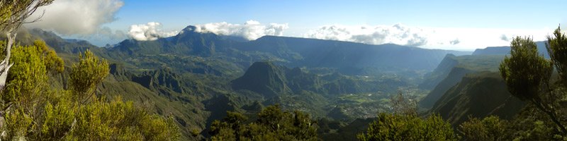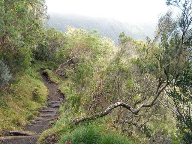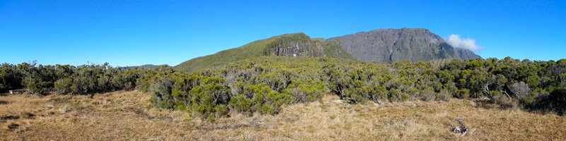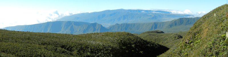 Cette troisième étape du tour du Piton des Neiges est la plus difficile en raison de la montée constante vers le Gîte de la Caverne Dufour sur un sentier le plus souvent boueux. La grimpée n'en finit jamais mais on longe heureusement le rempart par moments pour profiter de panoramas sur le Cirque de Salazie et plus haut vers la Fournaise et la Plaine des Cafres. Il faut compter une quinzaine d'échelles en aluminium qui aident au franchissement des parties les plus verticales. L'arrivée au gîte est un soulagement mais il faut tout de même songer à la descente qui est également interminable. L'aller-retour au sommet n'a pas été intégré à cette boucle qui est censée ne jamais s'écarter du GRR1. Et ce n'en est pas terminé du GR en arrivant au Bloc car il repart allègrement vers le Plateau des Chênes. Comme la boucle est presque terminée au sentier de découverte, prendre un peu de temps pour admirer les panoramas sur Cilaos depuis le haut de la Roche Merveilleuse ou effectuer quelques écarts sur le sentier botanique.