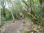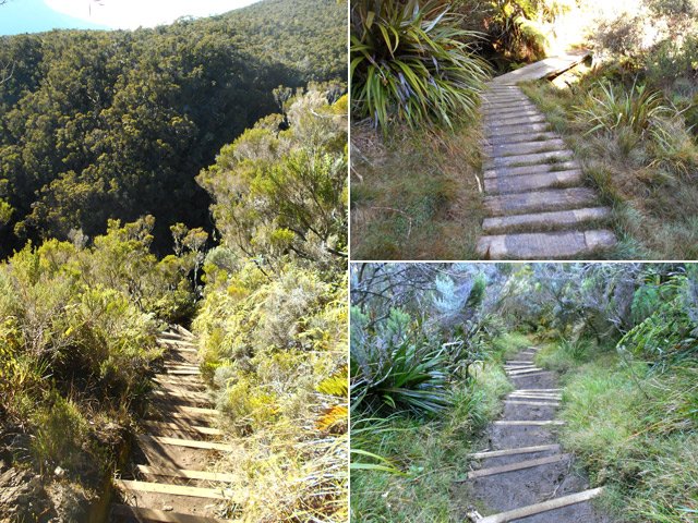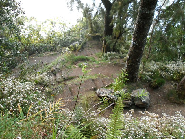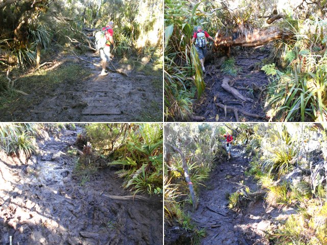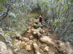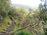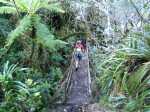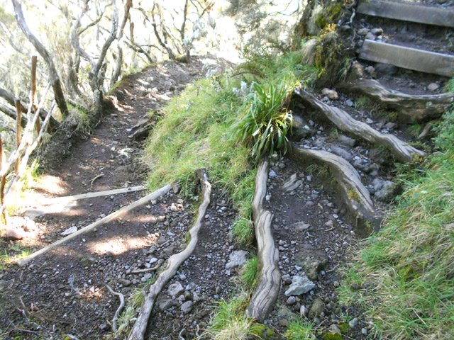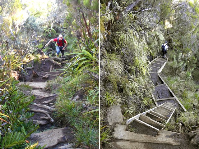 La randonnée débute à Hell Bourg à la mairie du village. Avant de partir, profiter du petit bassin entouré de fleurs et surmonté de la statue dénudée du monument aux Morts, l'Ame de la France, troisième exemplaire de l’œuvre ; la deuxième ayant été détruite à la dynamite par la curé du village, choqué sans doute d'autant d'impudeur dans ce lieu si reculé de la civilisation. En haut de la rue, la montée débute tranquillement près des cases, entre filaos et bambous sur des marches et sentiers bétonnés jusqu'à une zone de repos. Traverser la route et poursuivre sous les filaos et les chouchous en montée faible. Les marches bétonnées disparaissent et sont remplacées par de la pierre. Plus on monte et plus les panoramas s'agrandissent sur le cirque, les villages et le Piton d'Anchain (Photo 1). Le sentier, bordé de courts bambous, est très souvent façonné par l'homme. Il comporte des murettes, des câbles de sécurité et des marches régulières et bien sûr de fortes pentes qui amènent rapidement vers le gîte. Une bonne partie de la montée est constituée de longues portions bétonnées très faciles à grimper. Les lacets sont nombreux (Photo 2) avant d'arriver aux vestiges du téléphérique et de sa Vierge qui veille, dans le brouillard le plus souvent. Une dernière forte pente rejoint les filaos et la rambarde du gîte près du belvédère qu'on peut délaisser pour une fois tant les panoramas seront nombreux par la suite. Pourtant, une visite au petit musée du téléphérique ne prend que quelques minutes. Traverser les installations d'hébergement pour rejoindre la piste qui débute près du circuit pour personnes à mobilité réduite. Cette portion sur piste sera la seule agréable de la journée car la piste est presque plate et bordée de fougères et bois de couleurs (Photo 3). Après une boucle vers la droite, la piste se termine au pylône et installations près d'un nouveau belvédère pour voir arriver le soleil sur le cirque. Sans aucune transition le parcours se poursuit par un sentier qui pénètre immédiatement dans la boue et les racines (Photo 4). L'étroitesse surprend après la piste mais le sentier s'élargit par la suite. Si le sentier donne déjà des inquiétudes, la forêt, en revanche, est de toute beauté. On longe des fougères, sabres, de gros troncs de tamarins souvent tortueux dans les branches desquels les rayons du soleil matinal créent de magnifiques couleurs. Les marches sont très hautes et les premières courtes descentes débutent pour franchir les multiples ravines de la matinée (Photo 5). Ces obstacles ne sont jamais compliqués mais ils rajoutent du dénivelé à celui, très impressionnant de la journée. Après une montée constante dans cet univers de racines et cailloux entrecoupés de boue, on s'approche du bord pour bénéficier de larges panoramas sur le cirque. De petites sentes sont été créées de toutes parts pour éviter les larges flaques de boue et en ne marchant pas trop vite, on peut très bien terminer la montée sans remplir les chaussures de boue nauséabonde (Photo 8). Plus haut, la végétation est petit à petit remplacée par des branles couverts de barbes de Jupiter. Les cailloux et la boue ne diminuent pas mais des planchers permettent par moments de marcher plus sereinement (Photo 9). D'un seul coup, le sentier devient un long escalier refait à neuf en 2016. Espérons que les travaux se poursuivront jusqu'au gîte ! L'enfer ne devient pas le paradis mais la montée est enfin agréable sur ces marches en bois. Une forte descente amène au Bras de Caverne suivie d'une très forte montée. A la fin des marches, on se retrouve sur un plateau pour des points de vue grandioses sur la Forêt de Terre Plate, le Cimendef et les autres grands sommets du cirque (Photo 14). Des planchers recouverts de grillage sont de plus en plus nombreux et très utiles pour la boue et les zones marécageuses. Une clairière, un peu plus loin, permet des belles vues sur le Cap Anglais et le Gros Morne et montre hélas le reste à parcourir pour parvenir au gîte (Photo 12). La montée reprend jusqu'à une descente scabreuse vers le croisement du sentier descendant à Hell Bourg par Terre Plate. Reprendre la montée après un coup d’œil à la croix et à l'autel qui domine le cirque puis plus loin à la Caverne Mussard (Photo 13). A partir de la caverne, la description est aisée : végétation qui diminue graduellement, pente souvent forte, marches hautes et des millions de cailloux qu'il faut toujours surveiller du regard (Photo 17). Lever tout de même les yeux vers le chemin parcouru vers Bélouve (Photo 16) ou à gauche vers la Fournaise et la Plaine des Cafres. On aperçoit enfin le gîte au loin et, comme il est à hauteur d’œil, on se dit que c'est enfin terminé. Hélas, c'est sans compter sur les trois ravines qu'il faudra franchir par des descentes d'une vingtaine de mètres avant d'arriver enfin aux bâtiments (Photo 18). La jonction avec le col est facile et la descente peut enfin commencer. Profiter des panoramas sur Cilaos (Photo 19) et débuter sur le sentier par les premiers lacets. La descente est également facile à décrire : Pendant deux heures, emprunter des dizaines de lacets avec des marches hautes en bois (Photo 21) ou plus rarement en planche sur des pentes très fortes. Peu de panoramas (Photo 22), encore moins de zones plates. Une seule portion permet une halte au kiosque près de la source au Plateau du Petit Matarum après avoir franchi la Ravine des Prunes (Photo 24). On arrive en deux heures au Bloc, les genoux en feu. L'arrêt de bus près du parking est tentant après cette journée difficile mais le GRR1 n'est pas totalement terminé. Prendre à droite la route vers Cilaos et marcher sur cette courte portion de route qui passe près d'une zone de pique-nique et du pont sur le Bras de Benjoin. Plus loin, la route de la Roche Merveilleuse débute sur la droite ainsi