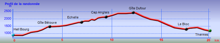 Quitter Hell-Bourg en direction du Gîte de Bélouve - Remonter jusqu'au gîte puis suivre la piste jusqu'aux antennes - Poursuivre le long du rempart vers Cap Anglais puis vers le Gîte de la Caverne Dufour - Entamer la descente vers Cilaos - Au Bloc, suivre la route jusqu'à la petite route de la Roche Merveilleuse et bifurquer immédiatement sur le sentier de droite - Remonter vers le sentier de Découverte, traverser la piste de la Roche Merveilleuse puis continuer jusqu'au croisement emprunté il y a deux jours - Prendre à gauche en direction des Thermes de Cilaos, fin de la boucle.