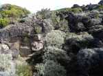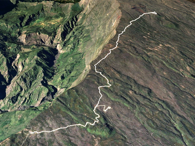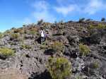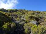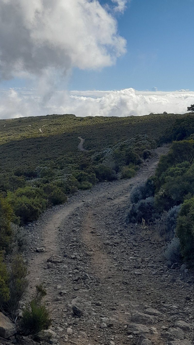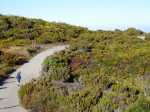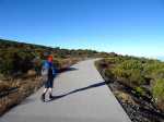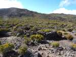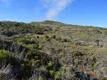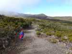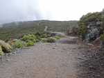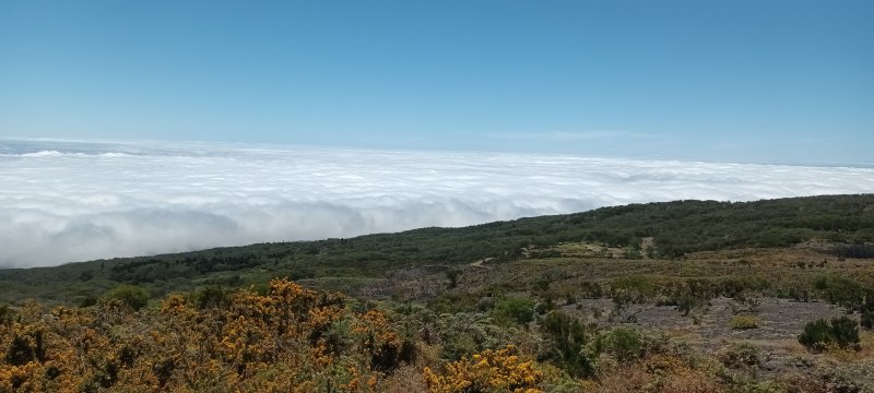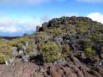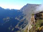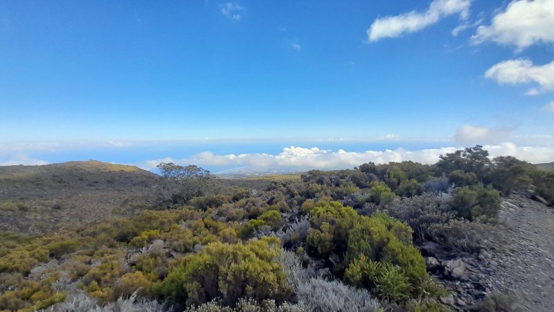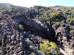 La randonnée débute au classique parking du Maïdo encombré de voitures du matin très tôt jusqu'au soir dès que la météo est clémente. Parcourir le belvédère de 200 mètres prend moins d'un quart d'heure et donne l'occasion de profiter des premiers rayons de soleil vers le Gros Morne et le Grand Bénare (Photo 1) ou vers les Orangers et la Roche Ecrite (Photo 2). Le spectacle est toujours aussi beau et impressionnant même au dixième passage. Rejoindre ensuite le parking et trouver facilement la piste bétonnée (Photo 3) indiquée par un panneau marqué de sigles abscons (Piste DFCI de l'OPAR qui se traduit par Piste de Défense des Forêts Contre l'Incendie de l'Observatoire de Physique de l'Atmosphère de la Réunion). En effet, le sentier qui reliait le Maïdo est devenu une longue piste pouvant être utilisée à tout moment par les camions des pompiers. C'est dommage pour les amateurs de sentiers classiques mais c'est très pratique dès qu'un inconscient est responsable d'incendies sur des hectares de plantes endémiques rares. Sur les 5500 mètres de piste, il n'y a jamais à se poser de question sur l'itinéraire. Marcher tranquillement en profitant des points de vue sur la mer (Photo 5) ou en devinant le nom des plantes rencontrées (Photo 13). On voit de loin le mirador de gué contre les incendies (Photo 4) et on le rejoint très vite après une route le plus souvent en descente(Photo 6). Les bâtiments de l'observatoire ont été bâtis pour s'intégrer au mieux dans le paysage des hauteurs de l'Ouest (Photo 7). Les vestiges des incendies passés sont fréquents mais diminuent, heureusement. Les graines de tamarins aiment bien un coup de chaud pour germer mais hélas, les ajoncs d'Europe ont parfois pris la place quand les premières feuilles veulent sortir. La piste se déroule doucement en direction du Piton de la Glacière qui sert de repère (Photo 12). Le sol devient plus caillouteux et le restera jusqu'à la Glacière (Photo 14). A l'approche du Piton de la Glacière, on devine au loin les marques blanches du sentier vers le Grand Bénare. Quelques panneaux vieillissants et illisibles marquent l'emplacement de la caverne recouverte d'une haute couche de basalte gardant au frais l'endroit (Photo 19) qui comporte souvent un bassin et une petite cascade en fonction de la saison. Les cavités qui conservent des traces de maçonnerie s'observent par les trous (Photo 20) protégés de chaînes. Lire les explications encore déchiffrables près des ouvertures et reprendre le chemin de retour en effectuant ou non un petit détour vers le Piton de la Glacière. Rien d'insurmontable que l'escalade de ce monticule (Photo 22) qui comporte à son pied une muraille arrondie qui pourrait accepter une tente de 2 personnes (Photo 24). Le retour s'effectuant principalement en descente, on a parfois sous les yeux plusieurs kilomètres de piste caillouteuse pour imaginer le trajet qui sera plus facile qu'à l'aller (Photo 25).