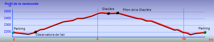 Depuis la construction de l'Observatoire de l'Air du Maïdo, une piste bétonnée de très bonne qualité part du parking du Maïdo jusqu'aux bâtiments. Elle se prolonge sans être bétonnée jusqu'à la Glacière. Cette montée en pente douce permet à tout un chacun de voir de plus près cette grotte servant de réserve de glace à l'époque de Madame Desbassyns qui aimait offrir des sorbets à ses invités. Si les esclaves désignés pour rapporter cette glace stockée à quelques mètres de profondeur effectuaient 60 kilomètres dans la journée, les marcheurs désirant se rapprocher de la grotte auront moins de 6 km à effectuer sur un terrain presque plat. La marche est une balade sur les deux premiers kilomètres et s'intensifie peu après avec quelques pentes légères et un sol souvent caillouteux. Si, par manque d'entraînement, on ne peut pas voir Mafate par le Grand Bord, ne pas manquer les panoramas sur l'océan et quelques villes du littoral. Ne pas manquer non plus cette magnifique vue sur le Cirque de Mafate en débutant la randonnée par une courte visite au belvédère à quelques dizaines de mètres du parking. Il est préférable de profiter du panorama avant de partir plutôt qu'au retour en raison de l'installation précoce des nuages. La végétation semble très bien reprendre après les incendies de 2010 et 2011. Repérer les jeunes plants de tamarins des hauts qui poussent pleins d'espoir en bordure de piste. De nombreuses autres plantes égayent cette sortie facile et instructive. Un petit détour au mirador ne prend que quelques minutes pour d'autres panoramas sur la côte.
