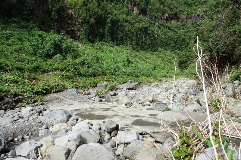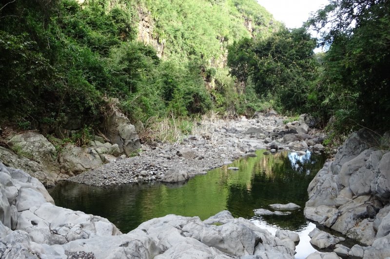 Il s'agit ce jour , non pas d'effectuer la rando ci proposée, mais de partir du même point-le radier de la ravine du Gol-pour remonter la ravine Bellevue séparée de quelques mètres seulement! Rando originale gentiment proposée par orando974 ,qui permet en 1h30 de découvrir une petite source et un grand bassin verdâtre qui n'apparaissent pas sur la carte IGN mais visible avec Google Earth. Remontée assez facile-d'une ravine aride-du moins en ce moment- qui pourrait faire à mon avis, l'objet d'une fiche.Au bout, des remparts qui semblent infranchissables; la jonction avec la ravine Maison Rouge semble donc bien improbable! On peut bien sûr coupler avec la rando Maison Rouge si on est un peu plus gourmand. Mais la ravine Goyaves, également proche, , mérite à elle seule de bonnes heures car c'est la plus belle.NB: la carte randopitons "Régions" place St Louis dans la zone Ouest mais il faut ouvrir la zone Sud pour y trouver les randos concernant " Bois d'Olives et Saint Louis". Petit détail pas grave -JPG est bien sûr pardonné-mais qui évite de chercher un peu comme je l'ai fait.....