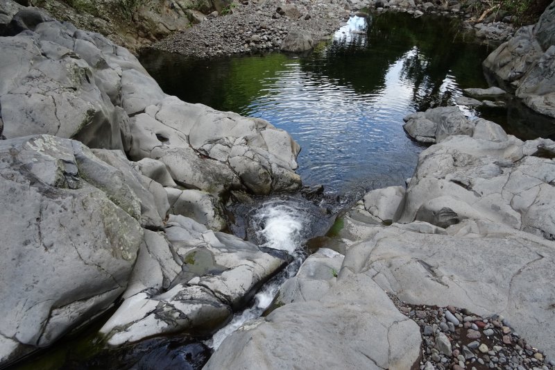 D'abord merci à Michel Re pour son commentaire du 10/06 qui nous a donné "l'eau à la bouche". Donc retourné avec orando974 le 30/06. Ce n'est plus du tout la rando proposée par le site ni pour le commentaire ni pour les photos!! Merci surtout au cyclone Fakir: ravine sèche et large sans liane papillon! qui permet de poursuivre jusqu'aux 2 cassés réunis en 1 par la nature-cote 163 IGN- : trouvé la source Barrage -rive g et un captage-rive dr -non mentionné sur les cartes- (d'ailleurs de beaux restes d'un barrage en pierre expliquent le nom) ;d' autant jolis bassins d'eau bien claire... L'intérêt de la rando passe alors à 2 coeurs, c'est du moins notre avis et il faut alors au total 4h 30 .Ravine qui "se remonte" bien, presque plate ! et sans aucune difficulté jusqu'au bout. Les lianes papillons ont été repoussées au pied des falaises. Partout ces falaises grandioses presque verticales avec au bout une grosse canalisation qui traverse de part en part la ravine. Un éleveur de cabris nous a dit qu'un sentier montait dans le rempart-rive g- au niveau de cette canalisation, pas vu et pas testé car nous étions alors presque à l'arrivée-sûrement raide et pas très visible!! ?-Voilà encore un autre challenge qui éviterait un aller retour. L'arrivée en haut du rempart devrait se situer au niveau de la chapelle Ste Thérèse. Ps: c'est sous le ciment, à l'arrivée aux cassés que passe la grosse canalisation: c'est la dernière photo de Michel Ré prise 3 semaines avant nous:même débit de l'eau dans les bassins et cascades.