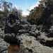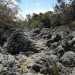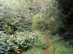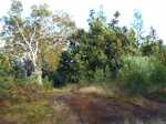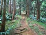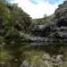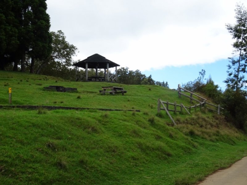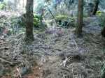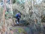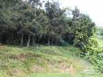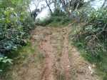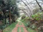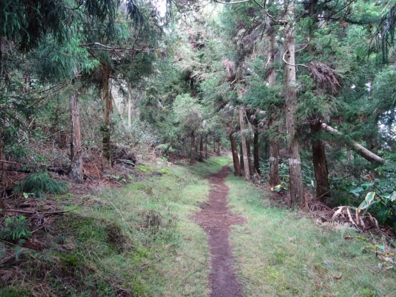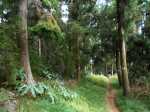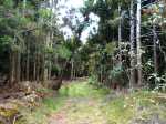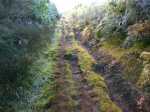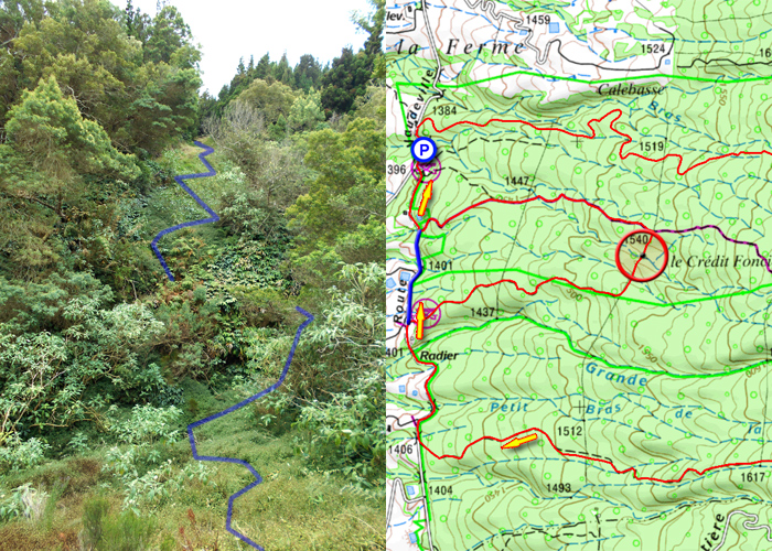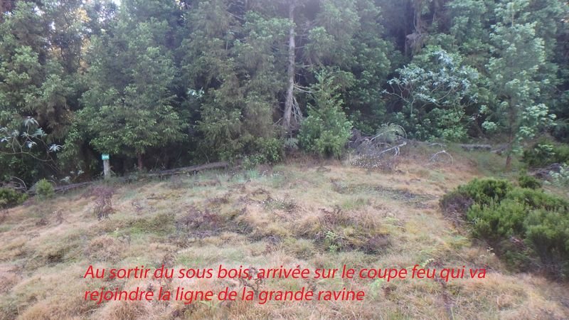 En fin de boucle, pour voir de plus près la piste qui remonte entre les kiosques et en la suivant jusqu'à la fin, on se retrouve sur une ligne domaniale. En partant sur la gauche vers la Ligne de la Grande Ravine, on est obligé de traverser deux ravines. Si la première est aisée et ne pose aucun problème, la seconde est impressionnante (point rouge). Il faut descendre d'une trentaine de mètres en lacets dans les jouvences qui ont recouvert le sentier. Cette descente passe encore en prenant garde. La traversée de la ravine est étroite et assez facile, toujours sur les jouvences qui cachent le sol. En revanche, on utilise un acacia noir tombé au sol sur les trois premiers mètres de la remontée. Il faut faire TRES attention à la chute car le tronc est glissant. En cas de doute en haut de la butte, faire demi-tour et retraverser la forêt de cryptomerias. Si on décide de ne pas effectuer cet écart, ne pas partir entre les kiosques et filer tout droit sur la route (itinéraire bleu).