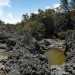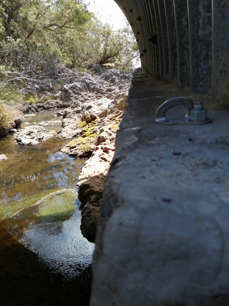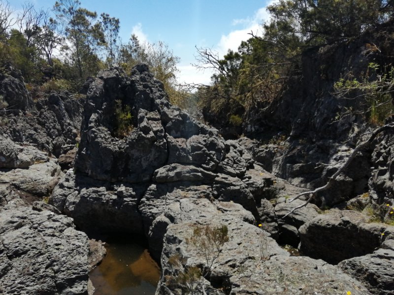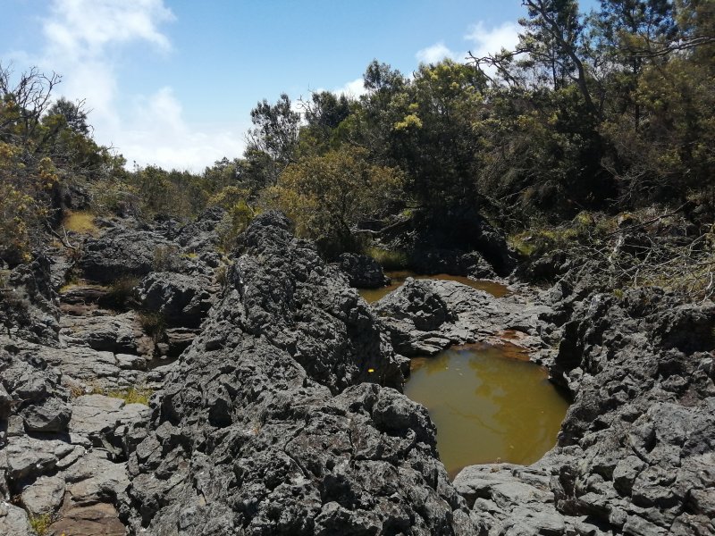 Vue de loin, cette boucle ressemble à celle faisant le tour du Crédit Foncier mais en y regardant de plus près, quelques difficultés supplémentaires viennent ralentir le rythme. On croise tout au long du parcours des lignes domaniales qui n'ont pas trop souffert malgré leur abandon visible. Ces lignes grises sur la carte sont en réalité de larges pistes rectilignes censées servir de coupe-feu au moment où elles ont été construites. Abandonnées et couvertes de végétation, le feu se joue de ces obstacles comme l'ont montré les incendies volontaires déclenchés en 2010 et 2011. Si la ligne domaniale est rectiligne, ce n'est pas le cas du sol qui monte et descend au gré des ravines franchies. Si certaines sont un jeu d'enfant, d'autres sont impossibles à traverser comme la Grande Ravine offrant des à-pics de 20 mètres, des bassins tout aussi profonds et de larges plaques de basalte lisses et dangereuses. La première, utilisée durant la montée ne pose guère de problème mais il en est tout autrement pour la dernière (voir § ci-dessous). Chacun fait donc ce qui lui plait sur ce circuit (qui a été reconnu avec maints aller-retours infructueux) et prend ses responsabilités.