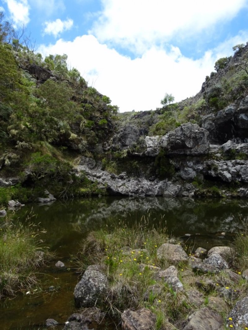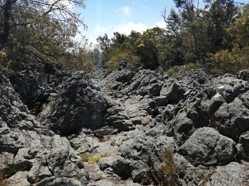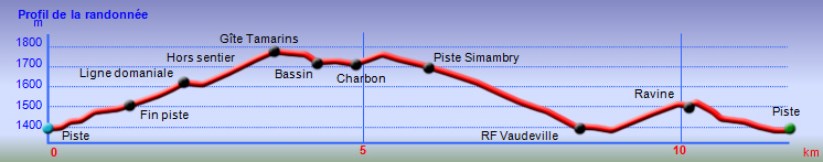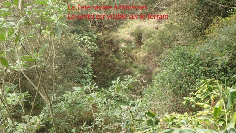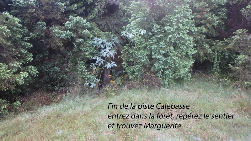 La randonnée débute à la pancarte indiquant la Piste Calebasse (Photo 1), du nom du quartier et de la ravine à sec qu'on longera bientôt. La pente est faible et régulière sous les vieux cryptomerias jaunissants (Photo 3). Certaines parties sont terreuses, d'autres herbeuses. Les fougères, bringeliers et acacias noirs envahissent doucement les sous-bois éclairés (Photo 2). Rien n'arrive à pousser dans les sous-bois sombres car les branchettes tombées rajoutent de l'acidité au sol où seules les mousses et longoses arrivent à s'installer. On coupe deux lignes domaniales qui se terminent à des à-pics insondables. Si on poursuit sur la Piste Calebasse, elle se termine sans avertissement. Un sentier part vers la droite ; un autre tout droit. Partir sur ce dernier sans hésitation au départ puis en cherchant des yeux les traces de pas un peu plus loin. On passe au plus près du crâne de Marguerite (Photo 4) qu'on a sans doute cherché longuement le jour de sa disparition. Il ne faut pas marcher trop vite et surveiller son GPS car d'autres sentes débutent et ne finissent pas toujours. Les branchettes de cryptomérias poussées sur le côté (Photo 5) sont une indication quand le sentier n'est pas trop repérable. Ailleurs, la marche arrive même à être rapide (Photo 6). Pour ne pas s'égarer, marcher en rive gauche du Bras Calebasse et ne pas le perdre de vue. Ce sentier discret se termine à une ligne domaniale. Comme le franchissement vers la gauche est impossible pour rejoindre la piste de Montvert, prendre à droite et franchir des ravines discrètes durant 500 mètres en direction de la ligne électrique qu'on voit au loin. Quand on se retourne pour voir le chemin accompli, on remarque que les bringeliers envahissent presque toute la surface de la ligne (Photo 7). La Ligne de la Grande Ravine est une autoroute comparée à ce qui vient de se faire (Photo 8). La montée est également constante et jamais forte. On devine bientôt les barrières du côté du gîte (Photo 10) qui demande un détour d'une centaine de mètres pour voir ses portes toujours fermées (Photo 11). Emprunter la route bétonnée, refaite à neuf récemment, pour une courte pause à plat. La Grande Ravine est toujours aussi sauvage et le projet de la descendre à pied a été vite abandonné en raison du danger. Après avoir franchi les ponts de deux nouvelles ravines rocheuses, tourner à droite et suivre des sentiers de vaches ou des pistes d'extraction de bois en marchant le plus droit possible dans les friches (Photo 12). A la première piste, tourner à droite et rejoindre le bassin sur la Grande Ravine (Photo 14). Il a souvent de l'eau mais sa cascade est épisodique car liée à la météo. Ces quelques mètres permettent de comprendre pourquoi la descente de la ravine est très sportive. Reprendre la piste puis tourner à gauche à la première bifurcation pour rejoindre le chantier de charbon de bois (Photo 15). Terminer à la RF des Tamarins pour une transition ombragée (Photo 16) vers la Piste Simambry (Photo 17). C'est parti pour une longue descente dans la terre, l'herbe ou les feuilles de tamarins en longeant parfois au plus près le sentier destiné aux VTT. Certains passages dangereux donnent une idée de la grande maîtrise de ces sportifs (Photo 20). A la RF Vaudeville, prendre à droite et longer les prairies (Photo 21) en direction du point de départ. Des troupeaux vivent ici paisiblement en profitant, sans les apprécier, des larges panoramas sur les villes balnéaires de la côte ouest (Photo 22). La jonction est courte et facile par cette route très peu fréquentée. Les amateurs de petits coins particuliers partiront sur la droite entre les kiosques de pique-nique rencontrés sur la droite. Cette piste, comme les autres, monte calmement, tantôt terre (Photo 23), tantôt herbe (Photo 24). Cette piste se termine aussi à une ligne domaniale. Prendre à gauche et rejoindre la Ligne de la Grande Ravine en utilisant cette ligne domaniale. La première ravine se passe assez facilement mais la seconde demande de la maitrise, de l'entraînement et de l'instinct pour retrouver le très ancien sentier recouvert de jouvences. Voir le § ci-dessous pour d'autres détails. Une fois cet obstacle franchi, la descente de la Ligne de la Grande Ravine est une balade sur un sentier étroit, fréquenté, ombragé et charmant par endroits (Photo 25). Il se termine à la RF Vaudeville (Photo 28) à cinq minutes de la Piste Calebasse, fin de cette boucle sportive.