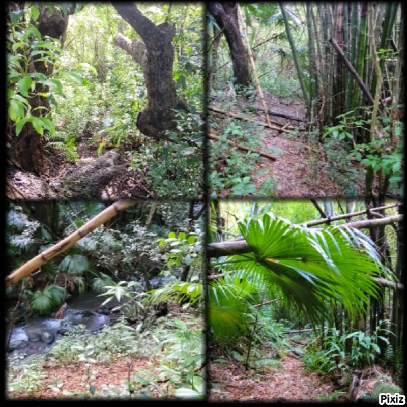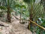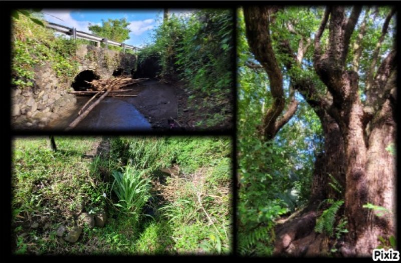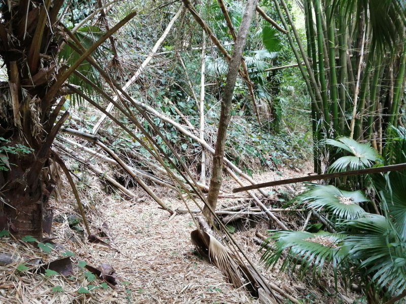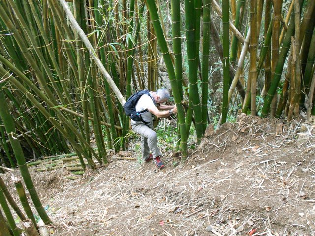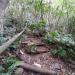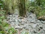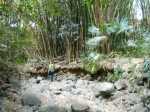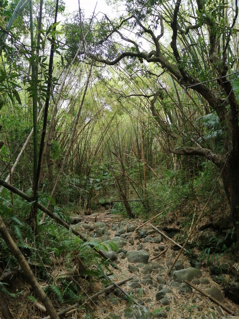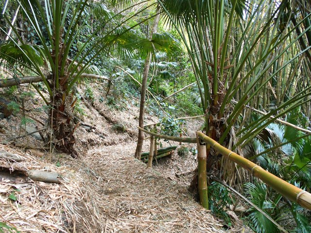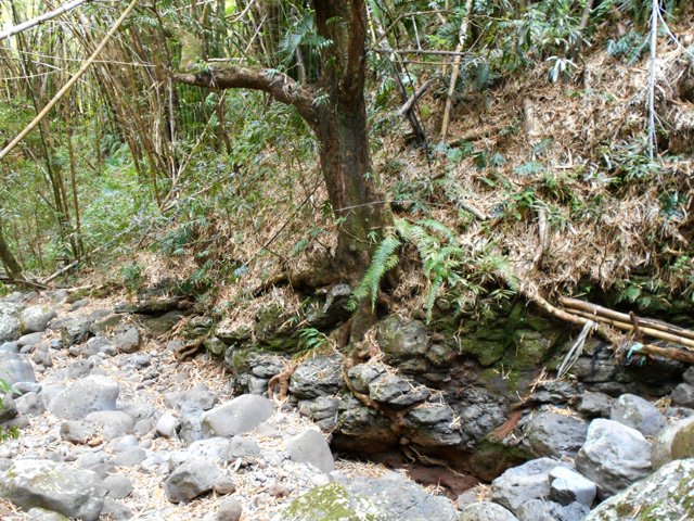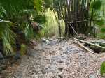 En septembre 2017, le sentier n'étant pas terminé, nous avons rejoint le pont (Photo 25) en poursuivant par la ravine au fond recouvert de galets (Photo 23). La longue boucle par les cannes étant encore assez aléatoire, reprendre le chemin inverse jusqu'à la hauteur du cimetière et remonter plein sud pour connaître le tracé du futur sentier. La dernière pente, vers les champs de la Ressource, s'effectue presque acrobatiquement (Photo 26) et ce sera plus aisé lorsque les marches soutenues de bambous seront installées sur la très forte pente. A partir des bambous, reprendre à nouveau en sens inverse pour regagner le cimetière des Jésuites.