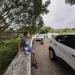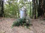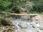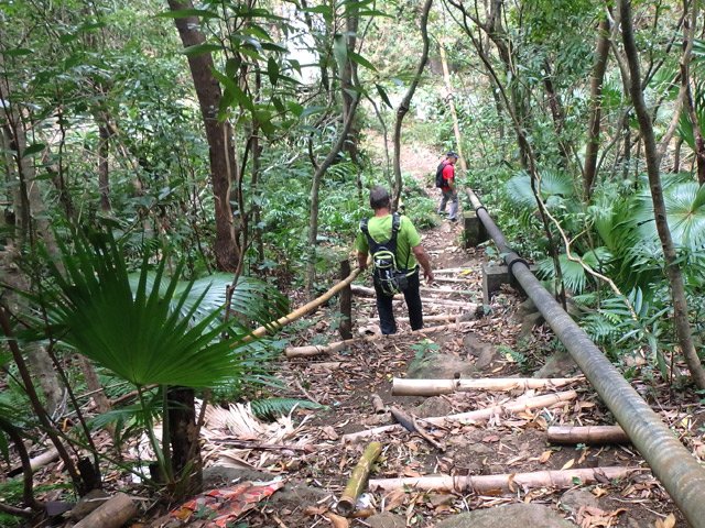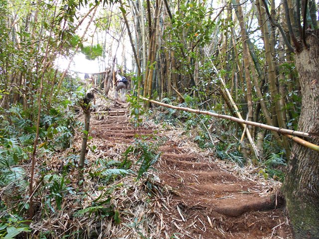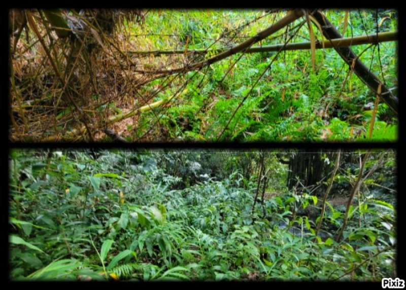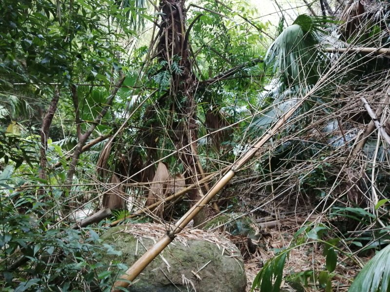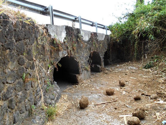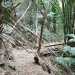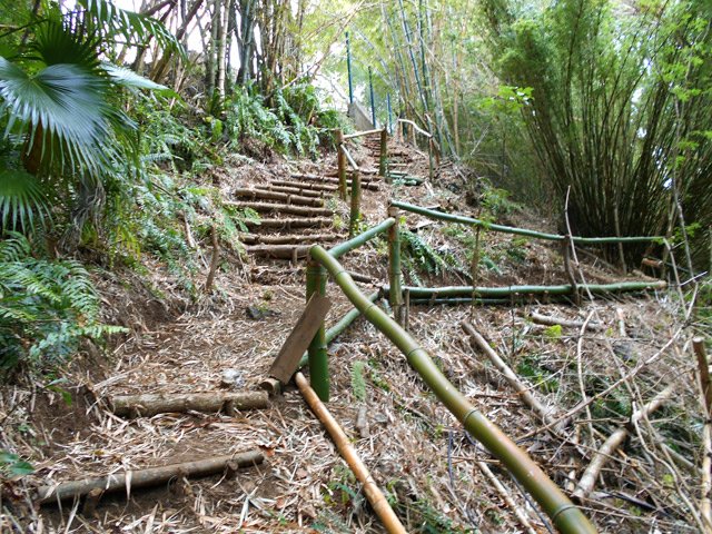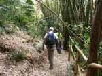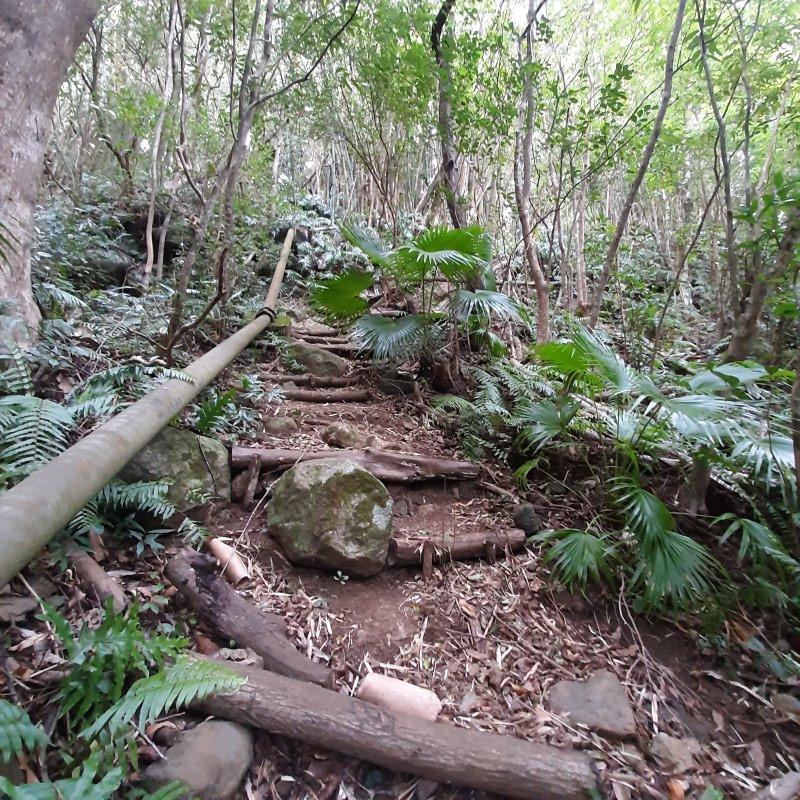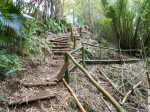 En septembre 2017, le sentier n'étant pas terminé, nous avons rejoint le pont (Photo 25) en poursuivant par la ravine au fond recouvert de galets (Photo 23). La longue boucle par les cannes étant encore assez aléatoire, reprendre le chemin inverse jusqu'à la hauteur du cimetière et remonter plein sud pour connaître le tracé du futur sentier. La dernière pente, vers les champs de la Ressource, s'effectue presque acrobatiquement (Photo 26) et ce sera plus aisé lorsque les marches soutenues de bambous seront installées sur la très forte pente. A partir des bambous, reprendre à nouveau en sens inverse pour regagner le cimetière des Jésuites.