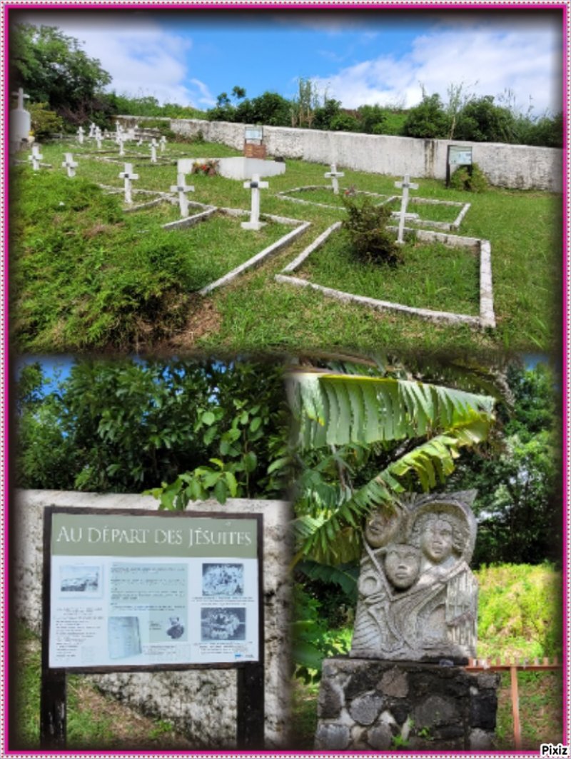 Ce lieu de repos éternel est un don de la famille Desbassyns au 19è siècle. Les jésuites, venus sur l'île de Bourbon en 1844 pour préparer leur implantation à Madagascar, créent une école pour les garçons ramenés des îles avoisinantes (Madagascar, Sainte-Marie, Nosy-Be, Mayotte …). Le cimetière abrite les dépouilles de 27 jésuites, une sœur de Saint-Joseph de Cluny et Marie Rivière, une créole de la Ressource. Dans le coin du cimetière on peut voir la très modeste tombe du Marquis de Gaudin de Lagrange près de celle de sa fille, la poétesse Ann Mary Ombline Gaudin de Lagrange, petite nièce d'Auguste de Villèle, connue pour avoir publié "La Grande Case", "Reflets d'âme" ou "Poèmes pour l'Île Bourbon", morte et enterrée à 41 ans. Plus émouvant, 80 jeunes pensionnaires sont enterrés à même le sol à l'emplacement de la stèle et du pied de ravenale.