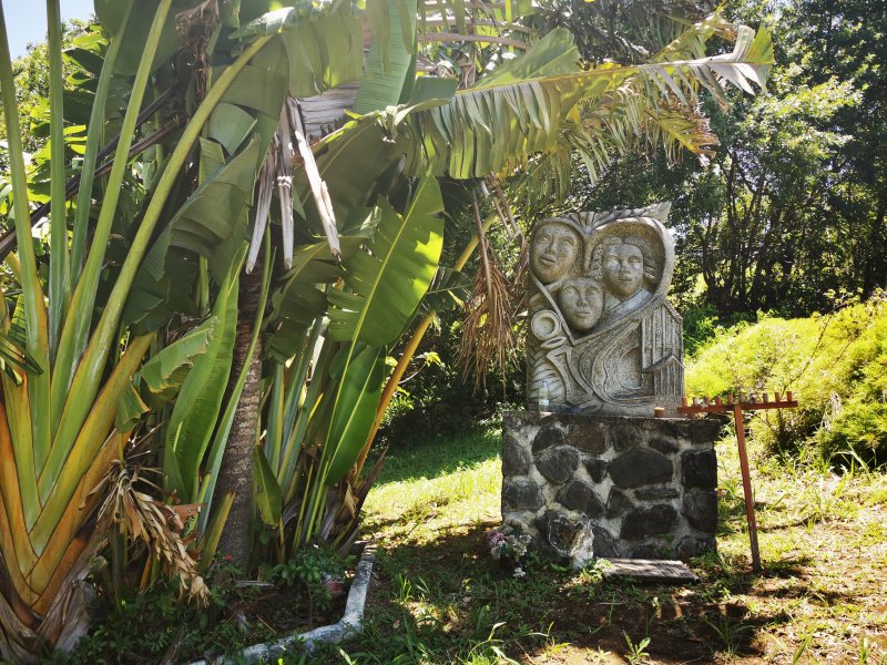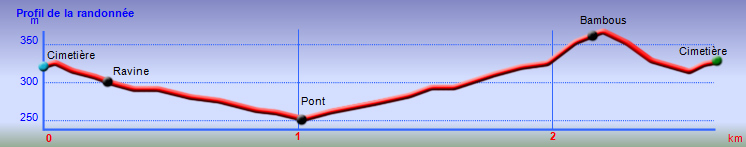 La randonnée débute au parking du cimetière, très facile à trouver grâce aux panneaux depuis l'église de la Ressource. Une fois au cimetière, ne pas manquer la lecture des renseignements (Photo 1), la visite des tombes de la famille Gaudin de Lagrange dans le coin sud-ouest (Photo 3) et celles des Jésuites constituées de petites murettes peintes en blanc (Photo 2). Le sentier est très facile à trouver à gauche en entrant dans le cimetière. Il file vers le tronc remarquable d'un camphrier (Photo 8) et passe entre deux de ses branches (Photo 9) pour débuter la descente vers la ravine. Les premiers palmiers et pieds de canneliers font leur apparition. Écraser une feuille entre les doigts afin d'apprécier la différence avec l'odeur du camphrier. Le sentier est bien tracé en légère descente (Photo 10). Aucune difficulté pour rejoindre le bord de la ravine où les bambous ont même poussé au milieu du lit (Photo 12). Quelques manguiers carottes survivent ici depuis des décennies (Photo 13), les racines dénudées par les rares crues. Après une centaine de mètres, les premiers travaux ont changé la physionomie du vieux sentier. Les bambous omniprésents servent pour la construction de balustrades décoratives (Photo 14) et les marches permettant de rejoindre le centre de rééducation sont également travaillées grâce au bambou (Photo 16). Le sentier longe le centre et l'on peut facilement rejoindre l'église pour en apprécier l'architecture mi-pyramide mi-cube ou voir la fresque peinte derrière l'autel. Près du centre de rééducation, avant de redescendre vers la Ravine des Figues, on frôle la tombe du Père Gurry. On connait peu de choses de cet ecclésiastique venu des Indes et chargé des engagés au début du 19è siècle mais on s'étonne de la forme inhabituelle de l'édifice. Sans vouloir lui manquer de respect ou tenir des propos sacrilèges, on s'attend à voir des tuyaux de refroidissement partir du sommet pointu de la tombe pour distiller le géranium ou le camphre très présent en ce lieu ! (Photo 18). Il gît pour l'éternité sous un énorme eucalyptus (Photo 17) entouré de bambous. Le sentier redescend alors vers la ravine et repart vers l'aval (Photo 19). Une passerelle en bambou n'est pas assez sûre pour tenter la traversée (Photo 20) mais le lit de la ravine se passe sans encombre. Un peu plus loin, le sentier remonte vers la Ressource pour un retour possible vers le cimetière par la gauche et le village.