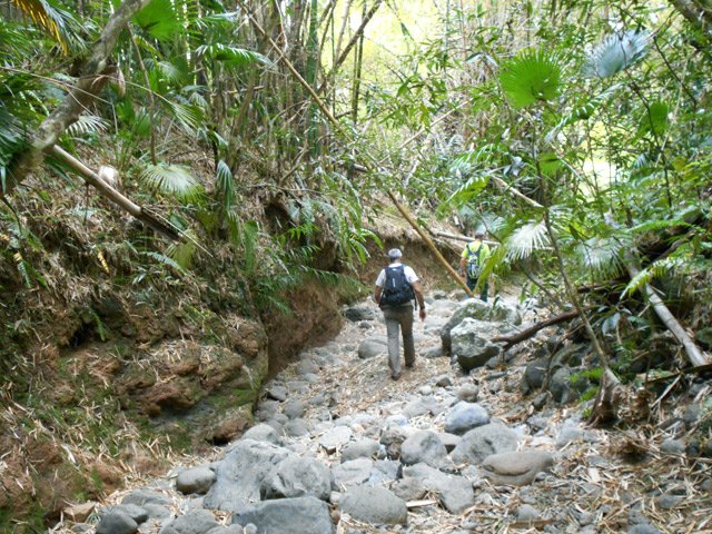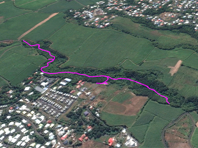 Nous avons effectué une boucle qui remontait vers Beaumont par les cannes à sucre mais elle n'est pas présentée car il a fallu traverser 50 mètres de végétation en rive droite de la Ravine des Figues sur une pente touffue et surtout glissante.