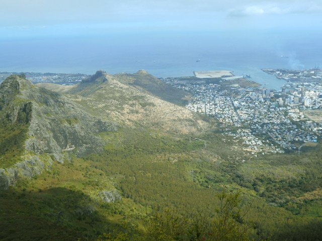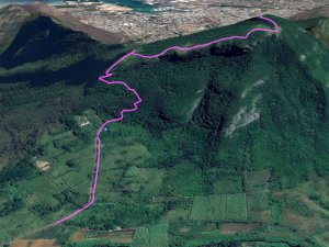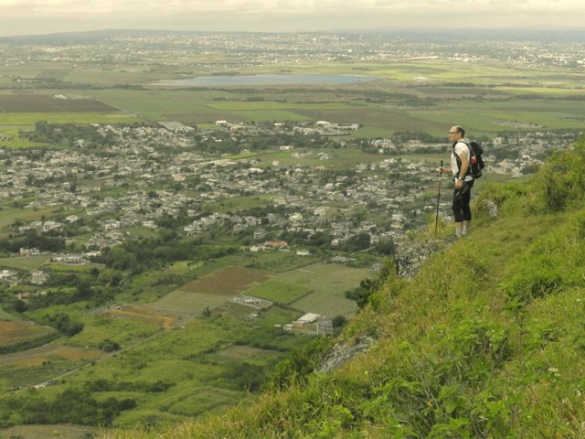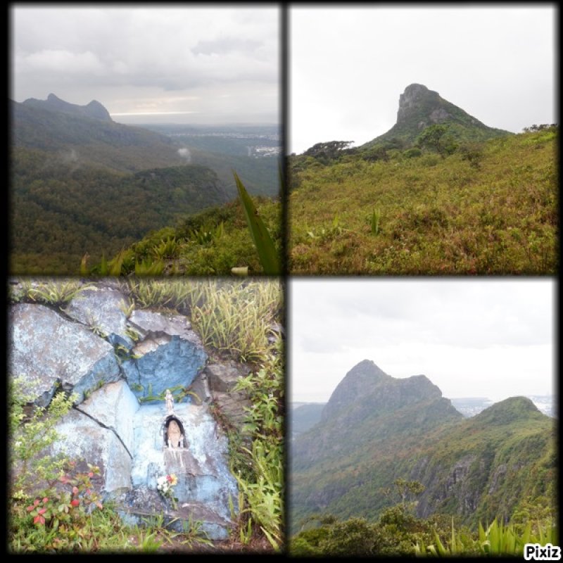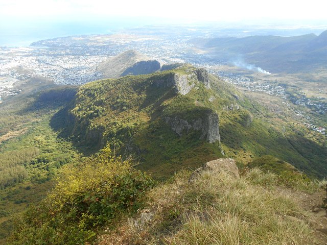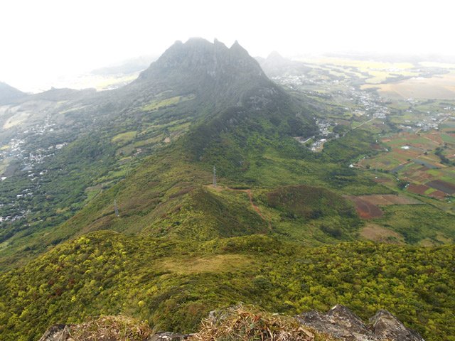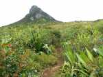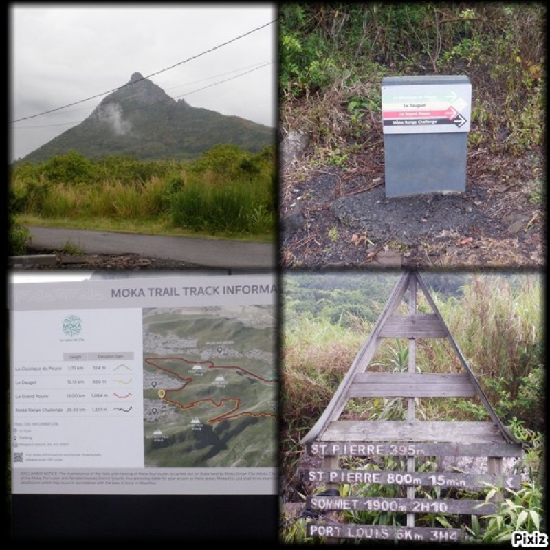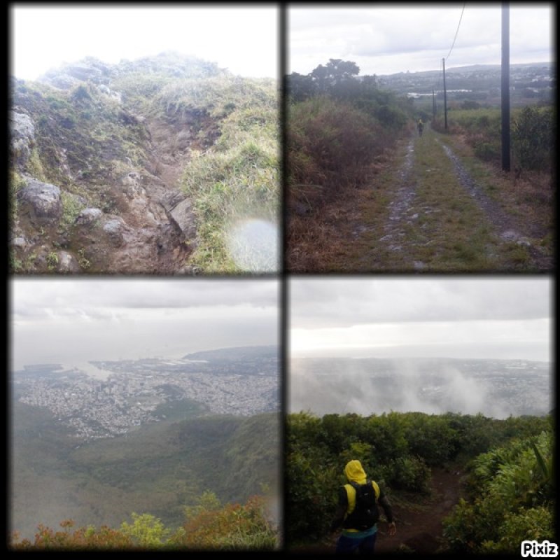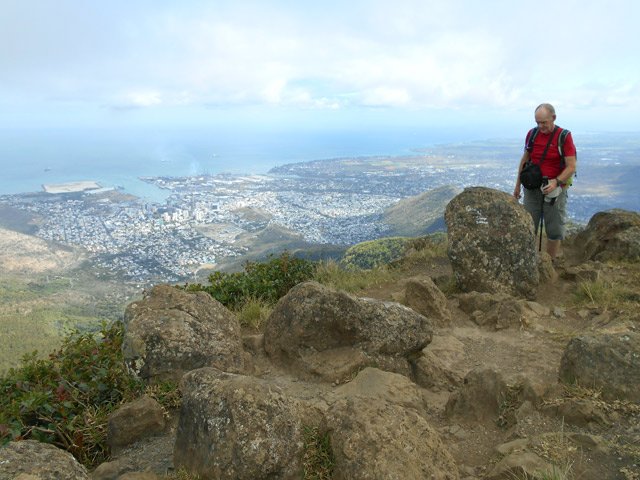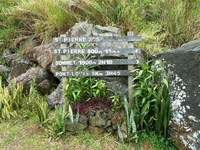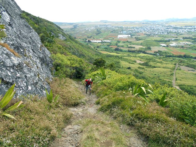 La randonnée débute par une large piste qui passe près de quelques cases (Photo 1). La pente est douce et sans difficulté. Sur la gauche, un panneau en bois indique quelques directions et temps de marche, en prévoyant 2h10 pour le Pouce (Photo 3). Prendre un peu à droite et longer une piste très caillouteuse qui débute près de grands eucalyptus avant de pénétrer sous le couvert des jamrosas qui créent une ombre agréable (Photo 5). Plus loin, la piste se rétrécit et se transforme en sentier constitué essentiellement de gros cailloux qui mettent à mal les chevilles (Photo 6). La végétation se raréfie très vite et le sentier effectue un lacet vers la droite. On longe alors une haute barre rocheuse infranchissable qui comporte des barres en bois fixées horizontalement sans qu'on en devine la raison (Photo 7). Les singes aperçus plus loin dans la vallée n'ont nul besoin de ces barres pour passer les rochers et elles sont trop fragiles pour ralentir d'éventuelles chutes de pierre. Le sentier, toujours aussi caillouteux, commence à grimper de plus en plus (Photo 8). Après quelques lacets, on parvient à un minuscule oratoire bleu au début d'un petit plateau. Profiter des panoramas sur l'île avant qu'ils s'élargissent jusqu'aux 360 ° du sommet. Les cailloux disparaissent enfin pour être remplacés par de l'herbe et de la terre. Une bifurcation sur la gauche permet de rejoindre Port Louis. Le sentier se poursuit sur la droite dans les goyaviers (Photo 13), longoses et magnifiques palmiers. Il serpente sans difficulté par une pente raisonnable et parfois un peu glissante. Les longoses se multiplient et remplacent les goyaviers, chacun luttant pour l'envahissement des flancs escarpés du Pouce (Photo 14). On parvient à un nouveau petit plateau où les panoramas ont encore grandi. Le Pouce, droit devant, affiche son sommet qui semble proche (Photo 15). La pente, à vue d'œil, est extrêmement raide sur les derniers 30 mètres. Cette partie est déconseillée aux personnes sujettes au vertige. L'ascension débute dans une forêt de goyaviers puis de bois de couleurs de petite taille en raison des vents violents qui balaient les cimes à longueur d'année. Le sentier comporte de très hautes marches qui, liées à la verticalité des lieux, créent la seule véritable difficulté de la sortie (Photo 19). Ici, pas d'à-pic vertigineux mais un profond sillon creusé par les milliers de passages, beaucoup plus sécurisant que les roches lisses rencontrées sur d'autres pics (Photo 20). Les mains sont nécessaires pour assurer la sécurité car on trouve très rarement des câbles de mains courantes à Maurice. Le sommet de quelques mètres carrés comporte de grosses roches et un peu de place pour les randonneurs essoufflés (Photo 21). Port Louis occupe une large part du panorama côté océan (Photo 23) et tout le tour du Pouce est occupé par les pitons alentour, un spectacle garanti. Attention, le vent peut être violent. Après s'être régalé du spectacle, la descente peut débuter par le même itinéraire (Photo 25) en prenant garde lors de certaines portions pentues où il est préférable de s'asseoir avant de poser les pieds. Arrivés au plateau près des bois de couleurs, le reste de la descente est un plaisir.