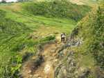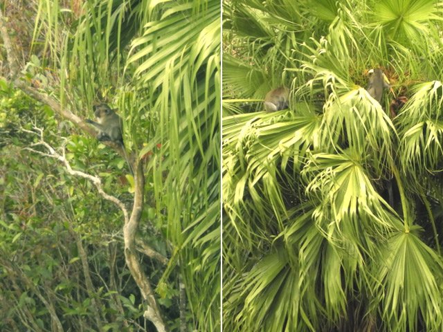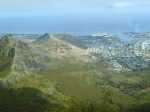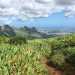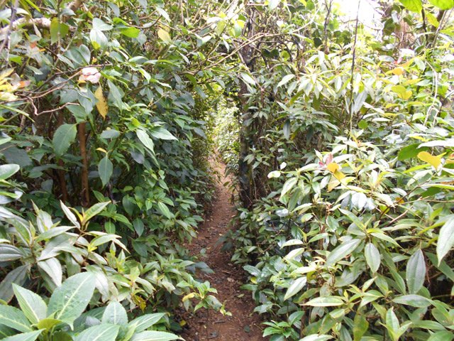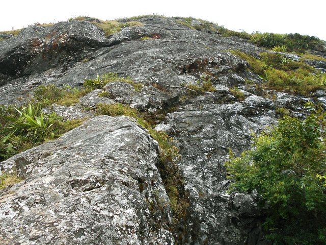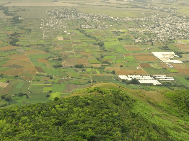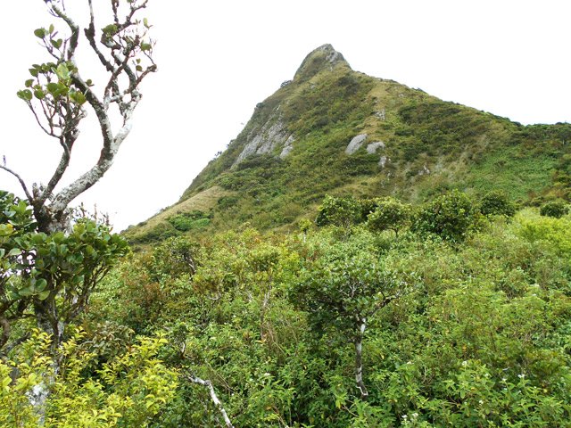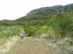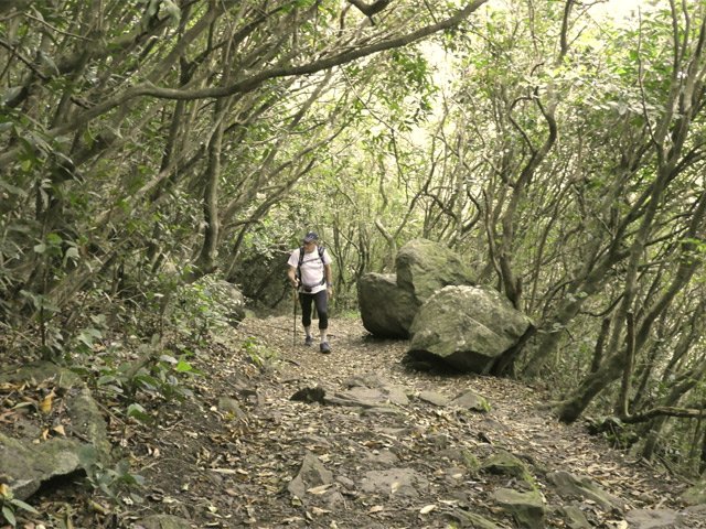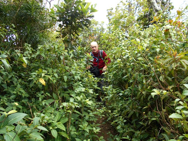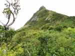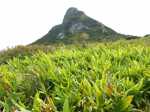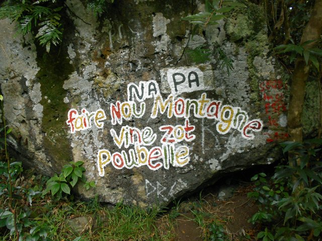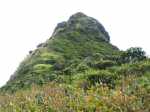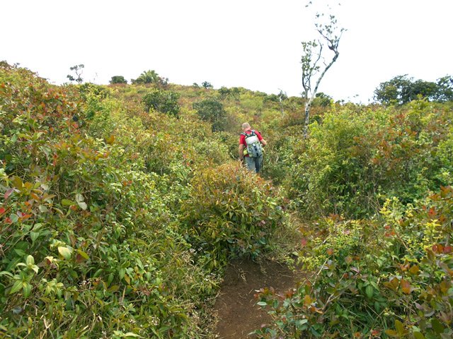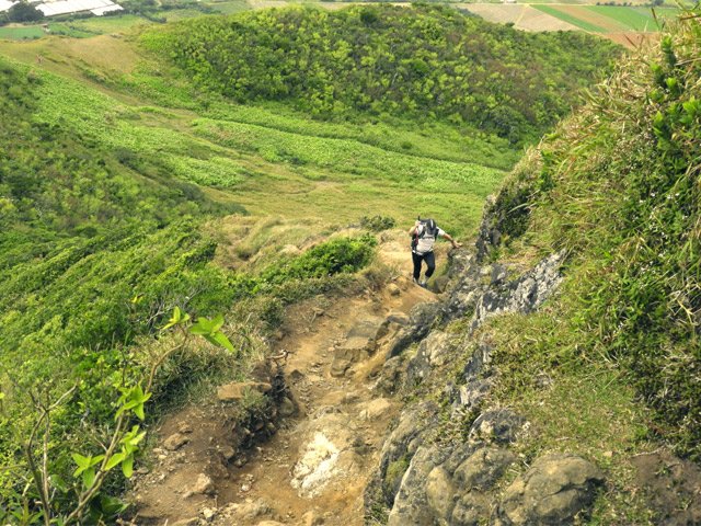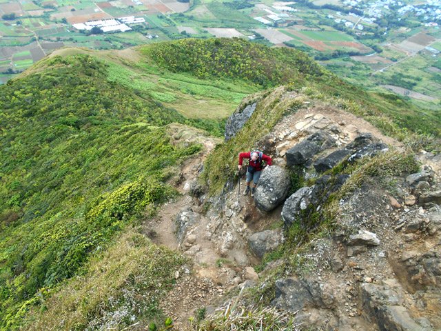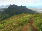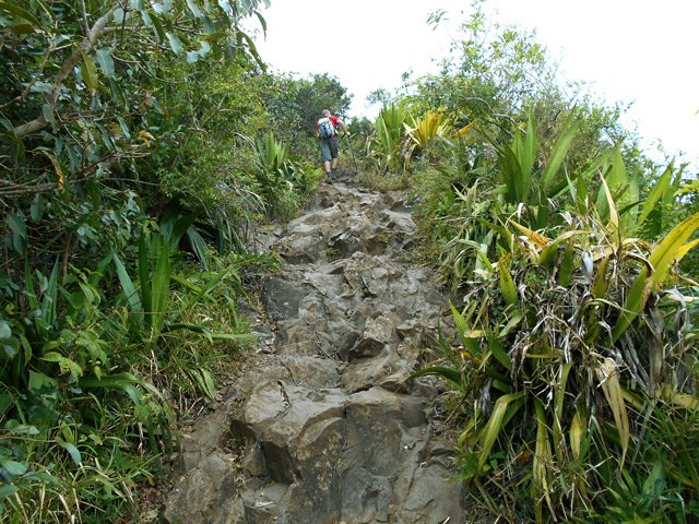 La randonnée débute par une large piste qui passe près de quelques cases (Photo 1). La pente est douce et sans difficulté. Sur la gauche, un panneau en bois indique quelques directions et temps de marche, en prévoyant 2h10 pour le Pouce (Photo 3). Prendre un peu à droite et longer une piste très caillouteuse qui débute près de grands eucalyptus avant de pénétrer sous le couvert des jamrosas qui créent une ombre agréable (Photo 5). Plus loin, la piste se rétrécit et se transforme en sentier constitué essentiellement de gros cailloux qui mettent à mal les chevilles (Photo 6). La végétation se raréfie très vite et le sentier effectue un lacet vers la droite. On longe alors une haute barre rocheuse infranchissable qui comporte des barres en bois fixées horizontalement sans qu'on en devine la raison (Photo 7). Les singes aperçus plus loin dans la vallée n'ont nul besoin de ces barres pour passer les rochers et elles sont trop fragiles pour ralentir d'éventuelles chutes de pierre. Le sentier, toujours aussi caillouteux, commence à grimper de plus en plus (Photo 8). Après quelques lacets, on parvient à un minuscule oratoire bleu au début d'un petit plateau. Profiter des panoramas sur l'île avant qu'ils s'élargissent jusqu'aux 360 ° du sommet. Les cailloux disparaissent enfin pour être remplacés par de l'herbe et de la terre. Une bifurcation sur la gauche permet de rejoindre Port Louis. Le sentier se poursuit sur la droite dans les goyaviers (Photo 13), longoses et magnifiques palmiers. Il serpente sans difficulté par une pente raisonnable et parfois un peu glissante. Les longoses se multiplient et remplacent les goyaviers, chacun luttant pour l'envahissement des flancs escarpés du Pouce (Photo 14). On parvient à un nouveau petit plateau où les panoramas ont encore grandi. Le Pouce, droit devant, affiche son sommet qui semble proche (Photo 15). La pente, à vue d'œil, est extrêmement raide sur les derniers 30 mètres. Cette partie est déconseillée aux personnes sujettes au vertige. L'ascension débute dans une forêt de goyaviers puis de bois de couleurs de petite taille en raison des vents violents qui balaient les cimes à longueur d'année. Le sentier comporte de très hautes marches qui, liées à la verticalité des lieux, créent la seule véritable difficulté de la sortie (Photo 19). Ici, pas d'à-pic vertigineux mais un profond sillon creusé par les milliers de passages, beaucoup plus sécurisant que les roches lisses rencontrées sur d'autres pics (Photo 20). Les mains sont nécessaires pour assurer la sécurité car on trouve très rarement des câbles de mains courantes à Maurice. Le sommet de quelques mètres carrés comporte de grosses roches et un peu de place pour les randonneurs essoufflés (Photo 21). Port Louis occupe une large part du panorama côté océan (Photo 23) et tout le tour du Pouce est occupé par les pitons alentour, un spectacle garanti. Attention, le vent peut être violent. Après s'être régalé du spectacle, la descente peut débuter par le même itinéraire (Photo 25) en prenant garde lors de certaines portions pentues où il est préférable de s'asseoir avant de poser les pieds. Arrivés au plateau près des bois de couleurs, le reste de la descente est un plaisir.