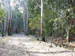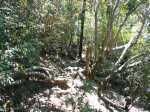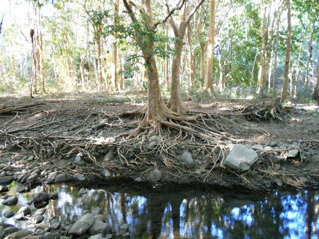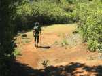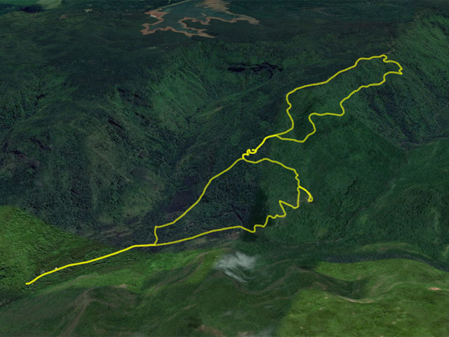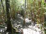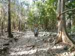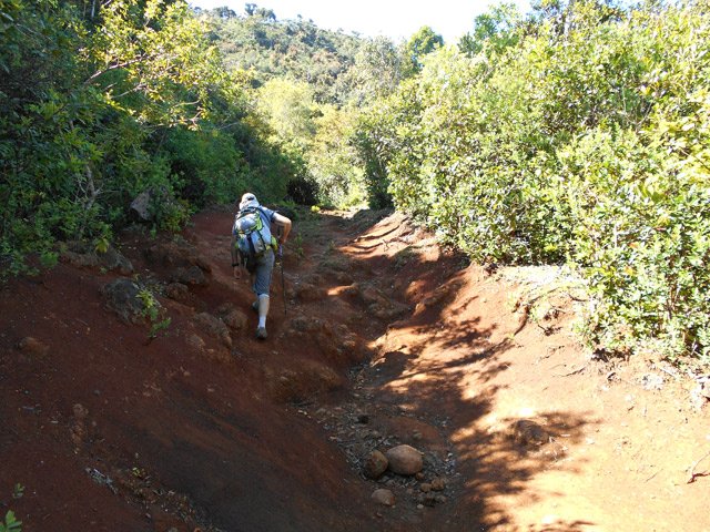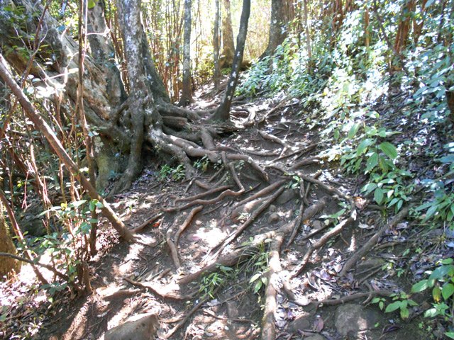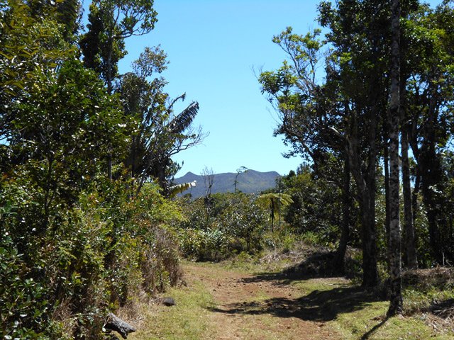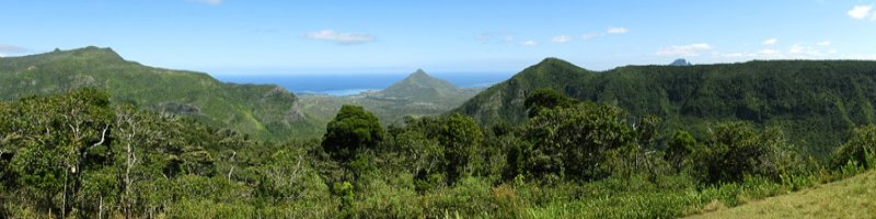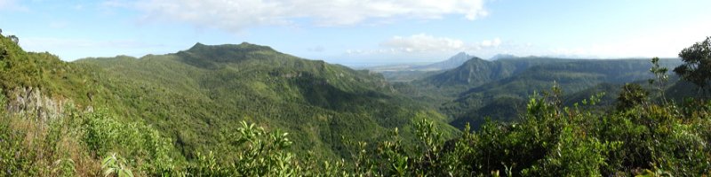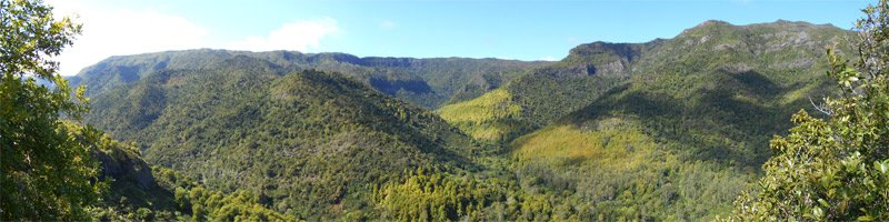 La randonnée débute au centre d'information situé à la fin de la route étroite qui longe la Rivière Noire. Aucun problème pour stationner. Remonter la rivière en remarquant les énormes racines dénudées par les crues de la Rivière (Photo 2). La piste est large et peut être utilisée par les 4x4 du parc, il n'y a donc aucune difficulté pour la suivre (Photo 3). Le sous-bois est vierge de toute plante envahissante, ce qui permet de voir très loin au-delà des arbres énormes (Photo 4). De grosses termitières entourent certains troncs et les galeries construites sur l'écorce permettent aux insectes de relier le sol à leur habitat. La pente de la piste est très faible jusqu'au premier embranchement. Prendre la voie de droite et marcher en direction de la Rivière Noire qu'on franchit sur un radier (Photo 5). Plus loin, un kiosque borde la piste et de magnifiques roches fendillées par l'érosion supportent parfois un arbre qui est venu pousser en son sommet (Photo 6). La pente s'intensifie et les premiers lacets débutent. Les cailloux de la piste sont remplacés par des bandes de roulement bétonnées et facilitent la marche qui devient régulièrement de plus en plus difficile (Photo 7). Au détour d'un lacet, un premier viewpoint permet de superbes vues sur la vallée de la Rivière mais ce n'est rien comparés à ceux qui seront répartis sur la suite du parcours. La montée reprend sur la terre ou les pierres jusqu'à un embranchement. Partir à droite vers le Plateau Remousse pour admirer le parc dans son ensemble depuis une large clairière survolée par les roussettes (Photo 8). Revenir sur ses pas et reprendre la piste en repartant à droite vers Macchabee dans les goyaviers. La piste est en assez mauvais état sur une courte distance puis elle s'améliore ensuite. Les goyaviers ont remplacé presque toute la végétation indigène ou endémique. Laisser à gauche le sentier du prochain croisement vers Machabee Viewpoint. Un autre point de vue aménagé dans un lacet (Photo 12) donne sur la Tourelle du Tamarin et l'océan (Photo 11). Poursuivre sur la piste, bifurquer à gauche en direction du point de vue de Macchabee en délaissant la piste qu'on retrouvera au retour. Le sentier commence par une très forte montée sur racines et terre humide (Photo 15). C'en est fini des pistes plus ou moins pentues et l'effort devient important. Le sentier alterne racines, pierres, marches artificielles, hautes marches naturelles (Photo 16), parties boueuses et raidillons (Photo 17). De beaux bois de couleurs surgissent des goyaviers mais on remarque, hélas, de plus en plus de troncs nus, signe d'une mort certaine. Une dernière volée de marches amène au fameux kiosque du Machabee Viewpoint. L'effort est aussitôt oublié pour la pause à l'ombre ou l'observation du paysage qui porte du Piton de la Petite Rivière Noire à l'océan. La rivière coule 500 mètres plus bas dans une magnifique vallée. On retrouve une piste à l'usage des agents du parc qui viennent éradiquer les goyaviers (Photo 18). Elle est large, très agréable et reposante. Un panneau, des pancartes et un banc de bois sont situés à un nouveau carrefour. Le sentier qui pénètre dans le sous-bois permet de rejoindre le haut de la Mare à Joncs Waterfall, une très haute cascade difficile à distinguer. On délaisse ce sentier pour poursuivre vers le Pétrin information center situé à quelques kilomètres de là. Après environ 500 mètres de piste terreuse ou empierrée, une bande de roulement bétonnée descend vers un croisement de sentiers. Bifurquer à droite vers le point de départ indiqué sur le panneau à 8 kilomètres, par le Colophane Trail. La piste descend agréablement (Photo 20) et effectue quelques lacets avant de se rétrécir. C'est le début des labours. Tout au long de cette piste qu'on suivra durant plus de 3 km, les cochons sauvages, qu'on entend parfois grogner, ont creusé chaque arpent de terre pour en extraire les vers, racines ou bulbes qui constituent leur nourriture (Photo 21). Heureusement, le sentier, trop dur à force de passages, est épargné. Plus loin, ce seront les pierres déterrées qui gêneront le passage. La pente est faible le plus souvent et cette promenade à flanc de montagne est très agréable, surtout pendant la traversée de magnifiques paysages ou la découverte de larges panoramas sur l'horizon (Photo 22). On se retrouve au croisement vers le Machabee Viewpoint repéré à la montée et l'on poursuit sur la piste utilisée également lors de la montée. Guetter le prochain croisement de sentier après le point de vue situé dans le virage et entamer la descente par une portion du Pilgrims Trail. Le sentier ombragé est bordé sur la droite par un grillage vieillissant (Photo 25). La pente est forte sur les racines. Plus on descend, plus la pente devient abrupte et envahie de gros cailloux rendant la progression assez technique. Quand il n'y a pas de pierres, c'est la terre glissante qui impose de bien regarder où poser le pied. A la fin de cette descente d'anthologie, le terrain s'aplanit dans un bois de grands eucalyptus. Le prochain croisement, qu'on délaisse, mène au pied de la cascade de la Mare à Joncs. Poursuivre et retrouver rapidement la piste empruntée en début de boucle, en aval du kiosque et de la Black River. On retrouve les grands arbres et leurs termitières puis les locaux du parc, fin de cette boucle sportive.