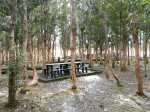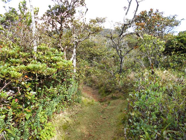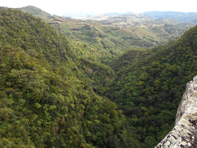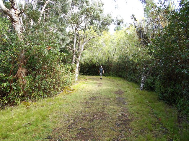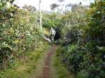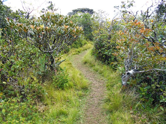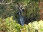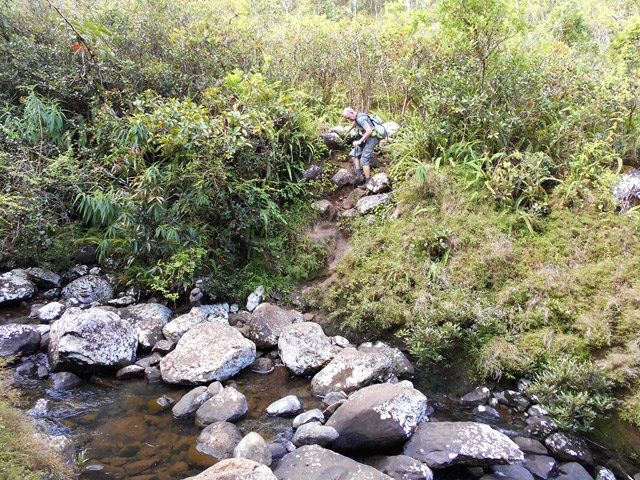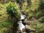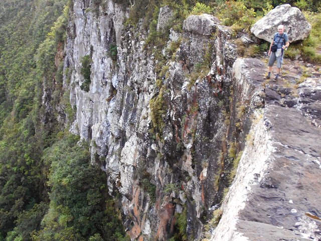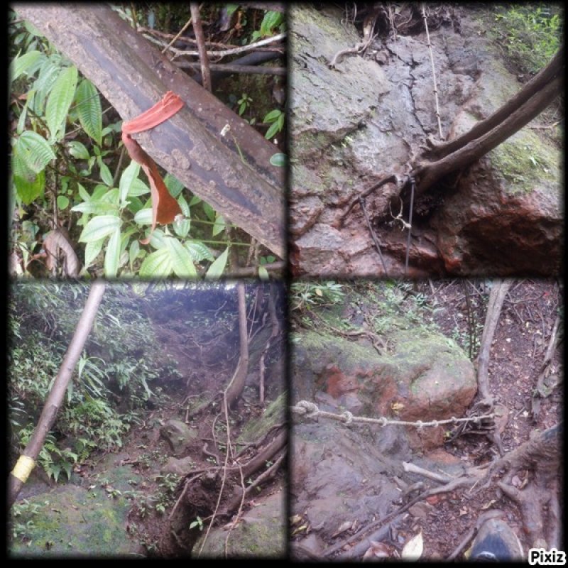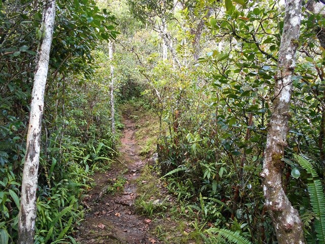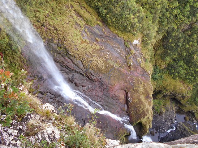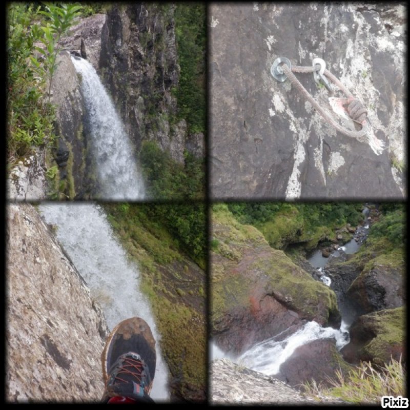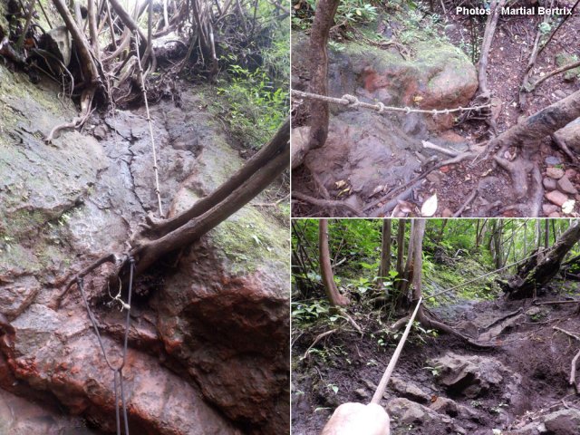 La randonnée débute à la piste située au pied du Piton Cocotte en roulant de Chamouny à Pétrin. Le randonneur peint en jaune annonçant un circuit pédestre est à terre mais il reste très compréhensible. Les 100 premiers mètres peuvent rebuter en raison de la boue ou des ordures jetées çà et là mais tout est oublié en découvrant la piste verdoyante (Photo 1). Le sol est plat pour une marche agréable sans l'herbe (Photo 2). Sur le côté, de magnifiques niaoulis poussent entre les pins et les eucalyptus (Photo 3). On traverse d'immenses plantations de pins, de cryptomerias et d'eucalyptus qu'on ne quittera pas jusqu'à la fin de la piste (Photo 4). Les goyaviers bordent également le parcours qui semble convenir aux singes qu'on aperçoit jouer parfois mais qui ont vite fait de fuir à la vue du randonneur (Photo 6). On coupe plusieurs petites ravines (Photo 7) avant de parvenir à une immense aire de pique-nique ou des dizaines de tables sont dispersées sous les niaoulis procurant une ombre agréable (Photo 8). Franchir un petit pont de bois au-dessus d'un minuscule ruisseau assez calme (Photo 9). En aval de la zone coule une rivière qui se jette par la Cascade Alexandra dans un précipice tout proche (Photo 10). On peut l'admirer en franchissant des passerelles au-dessus de l'eau ou en montant sur un promontoire surélevé offrant un large panorama sur la vallée et l'océan (Photo 11). Un sentier débutant près d'un petit cours d'eau remonte en rive gauche. On le traverse plus loin près d'une autre petite chute. il débute aussitôt après ce ruisseau et grimpe un peu à l'ombre des pins sur un terrain couvert de racines. Un peu plus loin, on chemine sur un magnifique sentier à plat, recouvert d'herbe courte et bordé de superbes bois de couleurs très variés (Photo 12). Les goyaviers prennent hélas rapidement possession des lieux (Photo 13). On pense que tout le sentier sera ainsi jusqu'à la cascade des 500 Pieds (Photo 14). On a quelque vues plongeantes sur la vallée arborée. Le plaisir est de courte durée car, sans transition, une descente s'amorce sur de grosses pierres humides où il faut se méfier de la glissade et se maintenir aux arbustes (Photo 15). Plus bas c'est la terre rouge lisse, la boue et les racines qui prennent le relais (Photo 16). La descente est parfois très forte et on arrive rapidement à une crête qui domine deux cours d'eau. La descente continue dans les mêmes conditions avant de se terminer à la Rivière des Galets (Photo 17). La rivière est étroite et un cairn marque le meilleur endroit pour la traversée (Photo 18). Le gué se franchit sans avoir à mouiller les chaussures qui ont quand même besoin d'être nettoyées de la boue (Photo 19). Après une forte pente pour sortir du lit, la descente reprend. On entend de plus en plus le bruit de la chute d'eau et on arrive rapidement sur le haut de la cascade (Photo 20). Le spectacle est grandiose vers la partie boisée de l'aval de la rivière ! On peut voir la première chute en escaladant les rochers en rive droite (Photo 21). Si l'on s'approche du bord on domine un vertigineux à-pic sans fond où plonge la cascade (de l'Exemple, des Galets ou de 500 Pieds). La falaise est verticale au départ puis se brise sur de nouvelles falaises rougeoyantes (Photo 22). PRUDENCE autour de la chute car les rochers sont lisses et le précipice proche (Photo 23 et 25). La magnifique vallée verdoyante est sauvage et l'on ne se lasse pas du spectacle (Photo 24). En cherchant en rive gauche, on aperçoit le sentier permettant d'entamer une difficile descente de la falaise. Les parties verticales se succèdent, facilitées par des cordes judicieusement placées aux nombreuses racines et troncs poussant à travers les roches glissantes (Photo 26). L'effort est soutenu, la prudence est de mise à chaque instant. Une fois parvenu 150 m plus bas, l'effort n'est pas terminé car on s'est éloigné de la cascade durant la descente. Marcher une centaine de mètres en direction des cascades qu'on devine au bruit. La récompense est à la rivière lorsqu'on parvient au pied de la chute pour en admirer les paliers repérés au sommet (Photo 27). Il est possible de s'approcher du pied de la plus haute en effectuant une courte escalade, là où se situait une échelle qui a depuis disparu (Photo 28). Reprendre le chemin inverse. La remontée vers le bord de la falaise est assez violent mais de courte durée sur la terre rouge lisse. On apprécie encore d'avantage la présence de ces cordes attachées aux arbres. Une fois au sommet, il ne reste plus qu'à parcourir à l'envers le sentier pris à l'aller puis rejoindre l'aire de pique-nique afin de profiter d'un casse-croûte bien mérité. Le retour par la piste est à nouveau un plaisir pour les yeux et les pieds où il est recommandé de marcher en silence pour surprendre les singes s'épouillant au milieu du chemin.