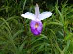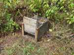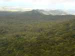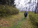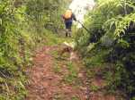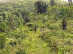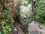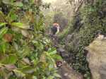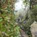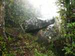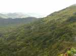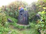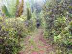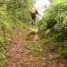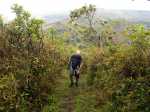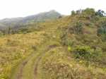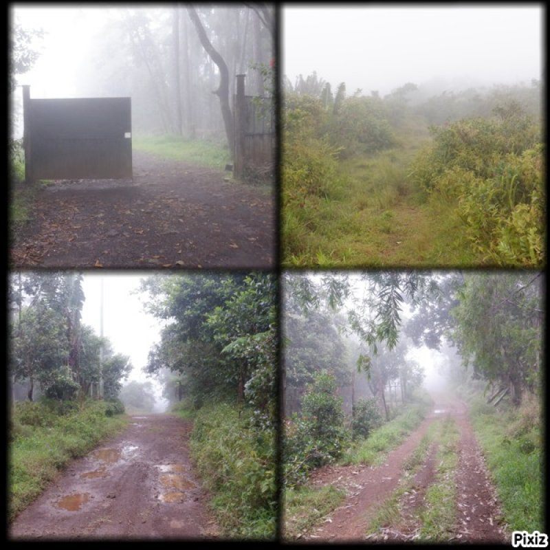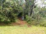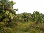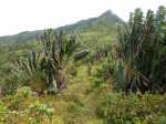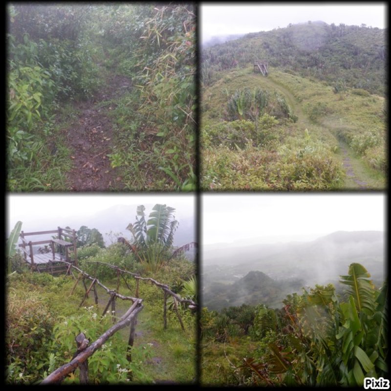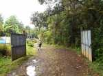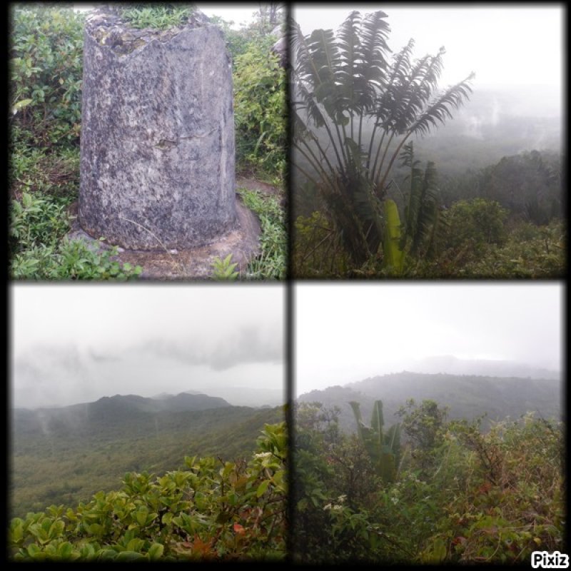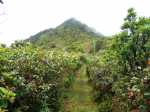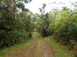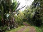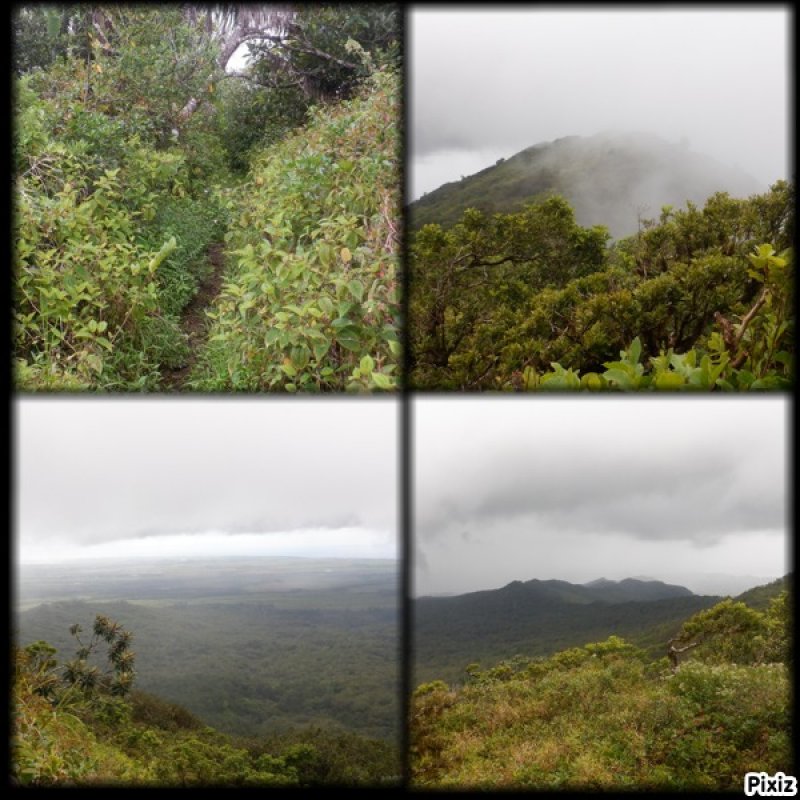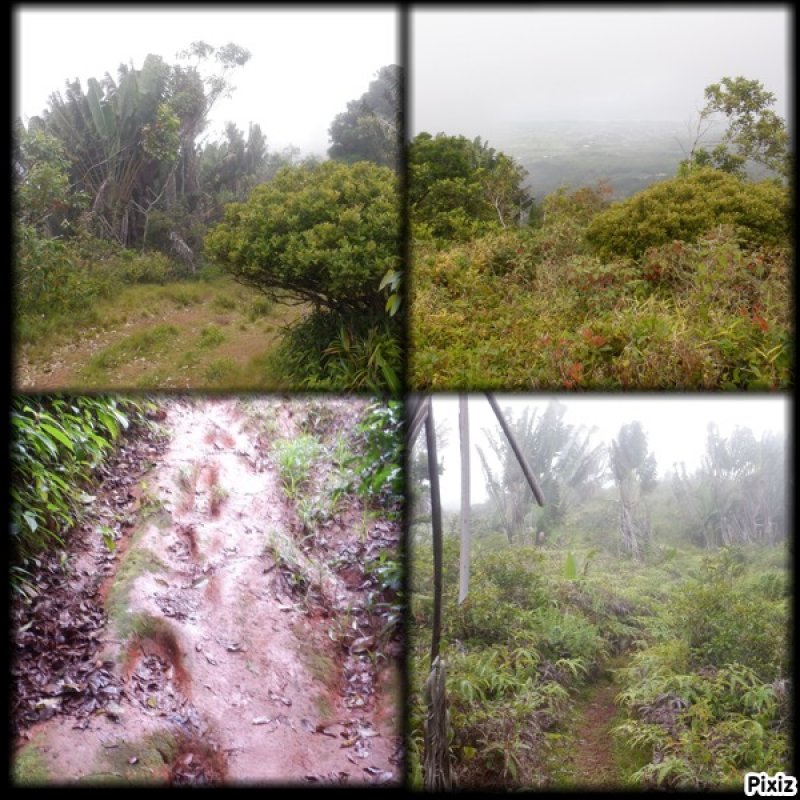 La randonnée débute à ce portail ouvert, comportant des gonds un peu délabrés laissant à penser qu'on le ferme rarement (Photo 2). La piste empierrée passe près d'une modeste case sur la gauche avant d'en rencontrer une autre sur la droite 400 mètres plus loin. La piste est large et suit un grillage entourant des bois divers. Des pièges sont régulièrement installés (Photo 5), vraisemblablement pour capturer les pigeons des mares (Photo 4). On frôle un autre grillage qui protège une haute antenne relais. La piste est agréable car recouverte d'herbe (Photo 6). Elle effectue quelques virages toujours en descente en offrant parfois des points de vue sur les environs recouverts de forêts. Lors d'un virage vers la gauche, on remarque en face un sentier de latérite en forte montée (Photo 8). Il faut alors poursuivre même s'il n'y a aucune indication. Après une montée très glissante par temps humide (Photo 9), le sentier présente une succession de montées et descentes. Il est bordé de goyaviers, de quelques bois de couleurs (Photo 10) mais surtout de plus en plus de touffes de ravenales (arbre du voyageur, Photo 11). On commence à apercevoir le Piton Savanne et remarquer l'aspect pointu de son sommet (Photo 12). Le sentier monte de plus en plus, toujours dans les goyaviers, ravenales et beaux palmiers (Photo 13). Les cailloux remplacent le sol terreux ou herbeux (Photo 18). L'ascension continue, les rochers se mêlent aux cailloux glissants (Photo 19), le sentier effectue un coude vers la gauche pour un dernier effort jusqu'au sommet (Photo 20) sur lequel on trouve une haute borne vieillissante (Photo 21). Les panoramas sur le sud de l'île valent à eux seuls la sortie (même s'il pleut !). Les feuillages colorés des forêts entourant le sommet indiquent que plusieurs espèces différentes ont été plantées à travers les bois de couleurs originels. Remarquer les deux sentiers se poursuivant vers d'autres pitons, l'un depuis le sommet (Photo 25), l'autre avant la dernière montée. Le retour s'effectue par le même itinéraire en étant prudent lors des premières descentes.