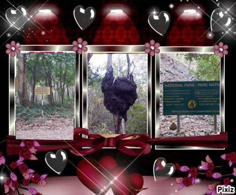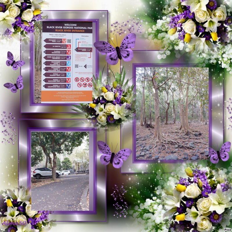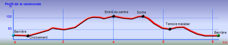 La balade débute près d'une belle propriété entourée de hauts murs de pierre de lave bordée de verdure (Photo 1). Les arbres qui poussent dès l'entrée sont très grands (Photo 2). La route est étroite mais la circulation assez calme. Il suffit donc de marcher en profitant de l'ombre bien agréable de ces grands arbres (Photo 3). On rencontre de belles racines (Photo 5), des termitières haut perché (Photo 7) et un oratoire sur le bord proche de la route (Photo 9). Les grillages installés de chaque côté (Photo 11) et les pancartes (Photo 8) indiquent que les abords sont privés. On arrive rapidement au terminus marqué par un début de parking et une aire de pique-nique (Photo 13). Marcher le long de la rivière que l'on peut enfin approcher et ne pas hésiter à poursuivre jusqu'à la case du Centre d'Information (Photo 14) et aux débuts de pistes bien marquées par des pancartes indiquant les circuits (Photo 15). Certaines montent assez rudement alors que d'autres sont à la portée de tous. Il est ainsi possible de partir sur la gauche en direction du pied de la Cascade de la Mare aux Joncs si l' on a prévu les délais nécessaires et de l'eau. Le retour s'effectue par le même itinéraire.