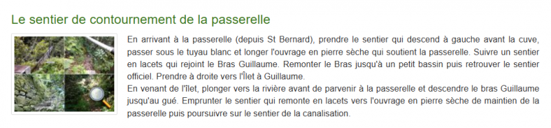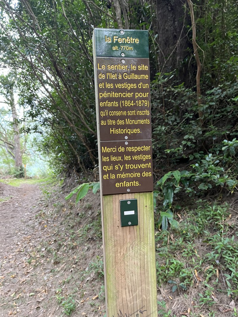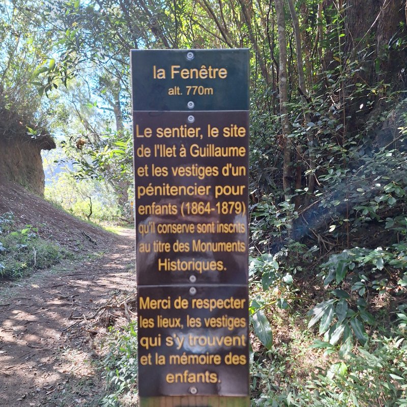 A chaque passage à l'Îlet à Guillaume, on remarque cette canalisation qui se poursuit en direction de la Roche Ecrite. Après avoir suivi la longue canalisation qui passe par la Fenêtre et frôle cet ancien pénitencier pour enfants, pourquoi ne pas continuer encore quelques centaines de mètres le long de ce même tuyau. Il va chercher l'eau dans la vallée du Bras Citron pour la transporter vers Saint-Denis. Le sentier parfois étroit, parfois très large a été mis en place à la même époque que la canalisation remontant de la passerelle du Bras Guillaume. Deux passages un peu étroits ou sur planches vermoulues peuvent ralentir mais ne comportent nul véritable danger si l'on prend son temps. Des câbles en acier rassurent grandement. Le cheminement est dans la continuité de ce qui vient d'être effectué depuis la Fenêtre. Au captage, une source d'eau claire rafraîchissante jaillit des rochers. Au retour, Il est possible d’effectuer un petit écart pour remonter le Bras Guillaume afin de rejoindre une cascade et son bassin à une centaine de mètres du gué. L'îlet à Guillaume, qui abrita un pénitencier pour enfants est un endroit de recueillement qui comporte quelques vestiges dont un émouvant petit cimetière. Malgré les recommandations de l'ONF qu'on retrouve sur les panneaux d'entrée, l'endroit n'est pas toujours aussi propre qu'on pourrait le croire. Poursuivre derrière la case en ruine pour profiter les points de vue sur la vallée profonde de la Rivière Saint-Denis qui prend sa source du côté du Gîte de la Caverne Dufour.