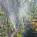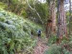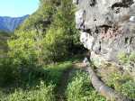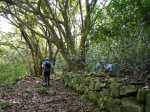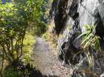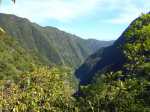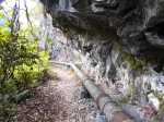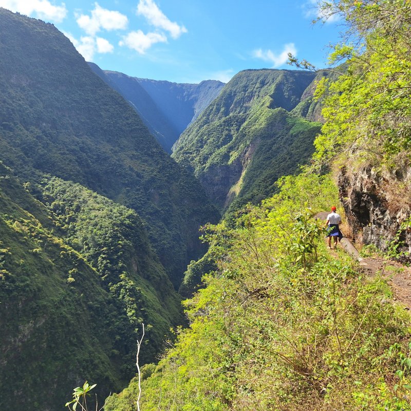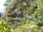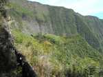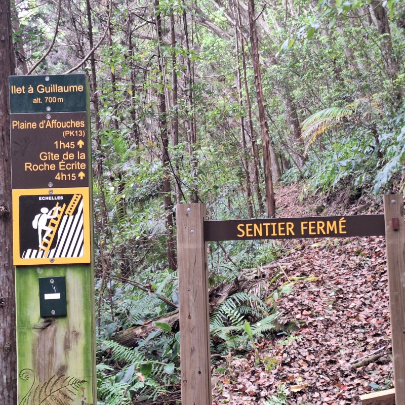 La randonnée débute à la route de Saint-Bernard où il est facile de stationner. Le sentier qui remonte à la Fenêtre est facile à suivre sur une montée régulière pouvant être glissante par endroits. Quelques marches facilitent la courte ascension (Photo 1). Il est sombre toute la journée tant les jamrosas poussent ici serrés les uns contre les autres (Photo 2). La montée est directe dès le départ et les muscles ne sont chauds. Des sentiers partent dans plusieurs directions vers le Domaine Telmard, le Colorado ou la RF de la Plaine d'Affouches par le sentier des Goyaviers. Un quatrième sentier débute près du rempart et file en direction de l'Îlet à Guillaume (Photo 3). Lorsqu'il n'y a pas d'éboulis (Photo 4), c'est une formalité que de descendre vers le Bras Guillaume. Le sentier qui longe la tuyauterie est toujours large (Photo 5), en faible pente et offre souvent de beaux points de vue sur la vallée sur la gauche. Le sentier longe constamment la tuyauterie (Photo 6). Comme tous les circuits longeant des canalisations il est en général assez plat (Photo 7). Lorsqu'elle plonge dans le vide, le sentier effectue un écart pour la rejoindre à nouveau un peu plus bas (Photo 8). La falaise est impressionnante mais quelques câbles aident aux passages délicats (Photo 10). La végétation diminue beaucoup les sensations de vertige. Elle n'est cependant pas suffisante à certains endroits pour les acrophobes confirmés (Photo 11). D'autres passages ont été carrément creusés dans la roche et sont parfois à l'origine de quelques chutes de pierres (Photo 12). La canalisation plonge à nouveau dans le ravin et le sentier effectue quelques lacets pour la retrouver (Photo 13). On parvient ainsi en moins d'une heure à la passerelle qu'il n'est plus recommandé d'utiliser pour le franchissement. Un sentier a été aménagé spécialement et ceux qui veulent emprunter la passerelle prennent leurs responsabilités. Pour cela, prendre le sentier qui descend à gauche avant la cuve, passer sous le tuyau blanc et longer l'ouvrage en pierre sèche qui soutient la passerelle. Suivre un sentier en lacets qui rejoint le Bras Guillaume (Photo 14). Remonter le Bras jusqu'à un petit bassin puis retrouver l'itinéraire officiel. Le sentier en rive droite du Bras Guillaume monte parfois très fortement et passe sous d'énormes eucalyptus au tronc spongieux (Photo 15). Plus loin, débutent les premiers vestiges d’occupation de la zone avec, ça et là, des murets en bordure de sentier (Photo 16). La liane papillon est de plus en plus présente et étouffe inexorablement les arbres endémiques ou créent des tunnels sombres (Photo 17). Une dernière montée plus rectiligne sous les eucalyptus amène à l'emplacement de l'ancien pénitencier dont il ne reste qu'une case vieillissante démontée jour après jour pour faire un peu de feu lors des bivouacs des marcheurs de passage. Profiter d'une halte pour contourner la case et s'approcher du rempart. Poursuivre par une piste bordée de cryptomerias qui se dirige vers l'ancien cimetière. Le sentier de la Roche Écrite part sur la gauche au cimetière et entame une longue montée de plusieurs heures vers le gîte de la Plaine des Chicots. Entamer la montée à l'ombre des gros camphriers (Photo 19). Une petite sente sur la gauche rejoint une grande cavité entourée de pierres sèches qui devait certainement servir de réserve d'eau. Des pierres taillées occupent encore le fond dont certaines en forme de boite aux lettres. Heureusement, le sentier est long, la pente forte ce qui a évité à ces vestiges de disparaitre ! Poursuivre, toujours en montée le long de la tuyauterie jusqu'au panneau indiquant la Roche Écrite. Partir sur la gauche et longer simplement le tuyau métallique sans chercher à s'éloigner de la canalisation (Photo 20). Les passages alternent larges parties plates herbeuses (Photo 23) ou étroits sentiers entre tuyau et roche. Franchir calmement les deux passages plus délicats (Photo 21) qui représentent moins de 30 mètres. Profiter de la vue en enfilade de toute la vallée de la Rivière Saint-Denis (Photo 22). Après quelques virages, on parvient à une source contenant sans doute un peu d'oxyde de fer colorant la roche (Photo 24) et l'on aperçoit déjà les installations construites à la fin du tunnel. Pour les rejoindre, passer deux petites passerelles (Photo 25) puis grimper un haut escalier bétonné. Une grille ferme l'accès au tunnel qui domine les ravines du Bras Citron. Ne rien rajouter aux lamentables vestiges de boissons et emballages de gâteaux jetés là puis repartir en sens inverse pour regagner le point de départ par le même itinéraire en profitant cette fois des panoramas sur l'Îlet à Guillaume (Photo 26). En arrivant au Bras Guillaume, les plus courageux ne craignant pas de mouiller les chaussures remonteront le torrent sur une bonne centaine de mètres en sautant de caillou en caillou, en pataugeant dans la rivière ou en escaladant les berges. Un bassin et sa cascade (Photo 27) rendent plus difficile et aléatoire une remontée plus en amont.